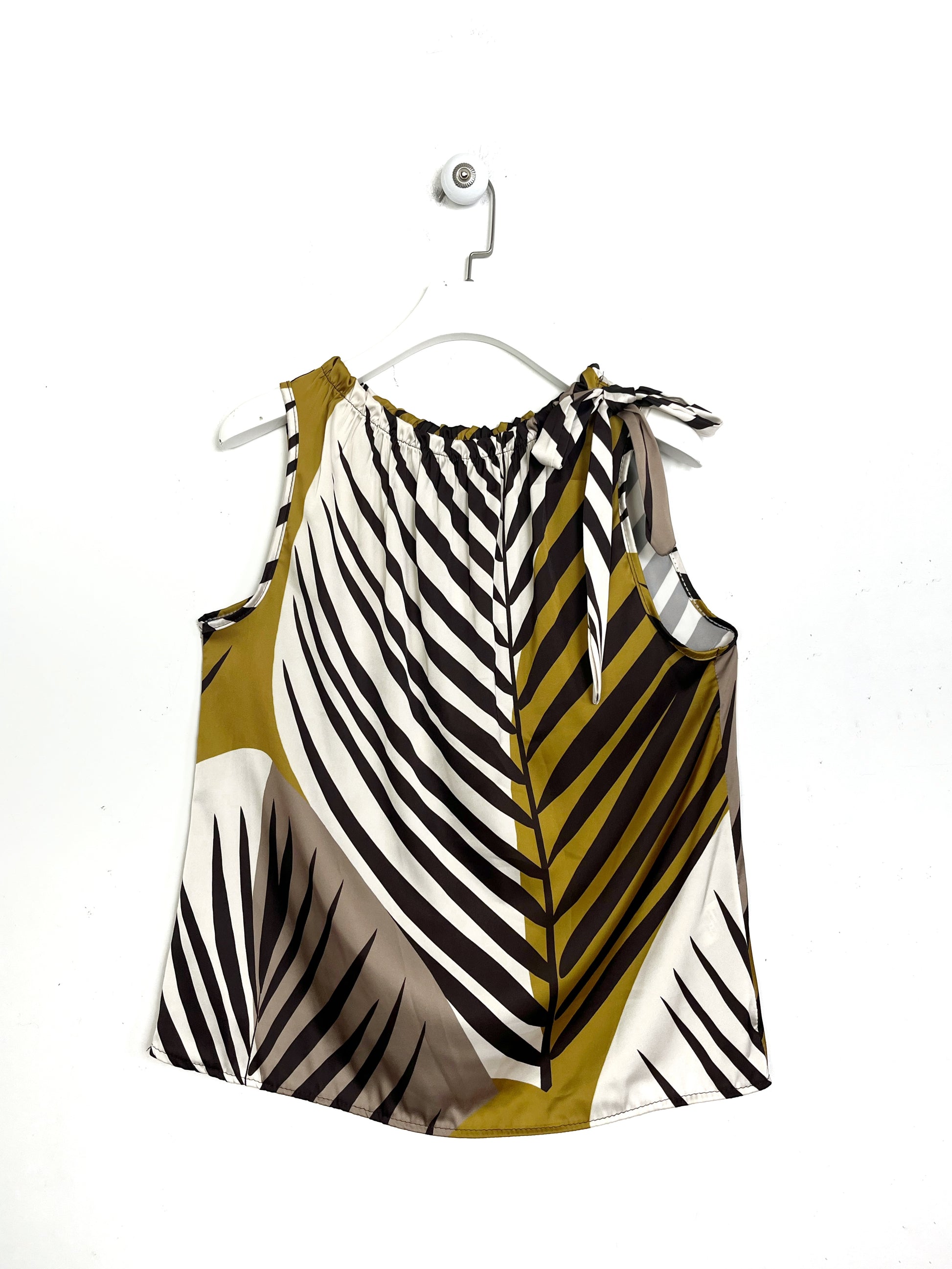 La blusa è smanicate con arricciatura nel girocollo, fiocchetto applicato sulla spalla sinistra