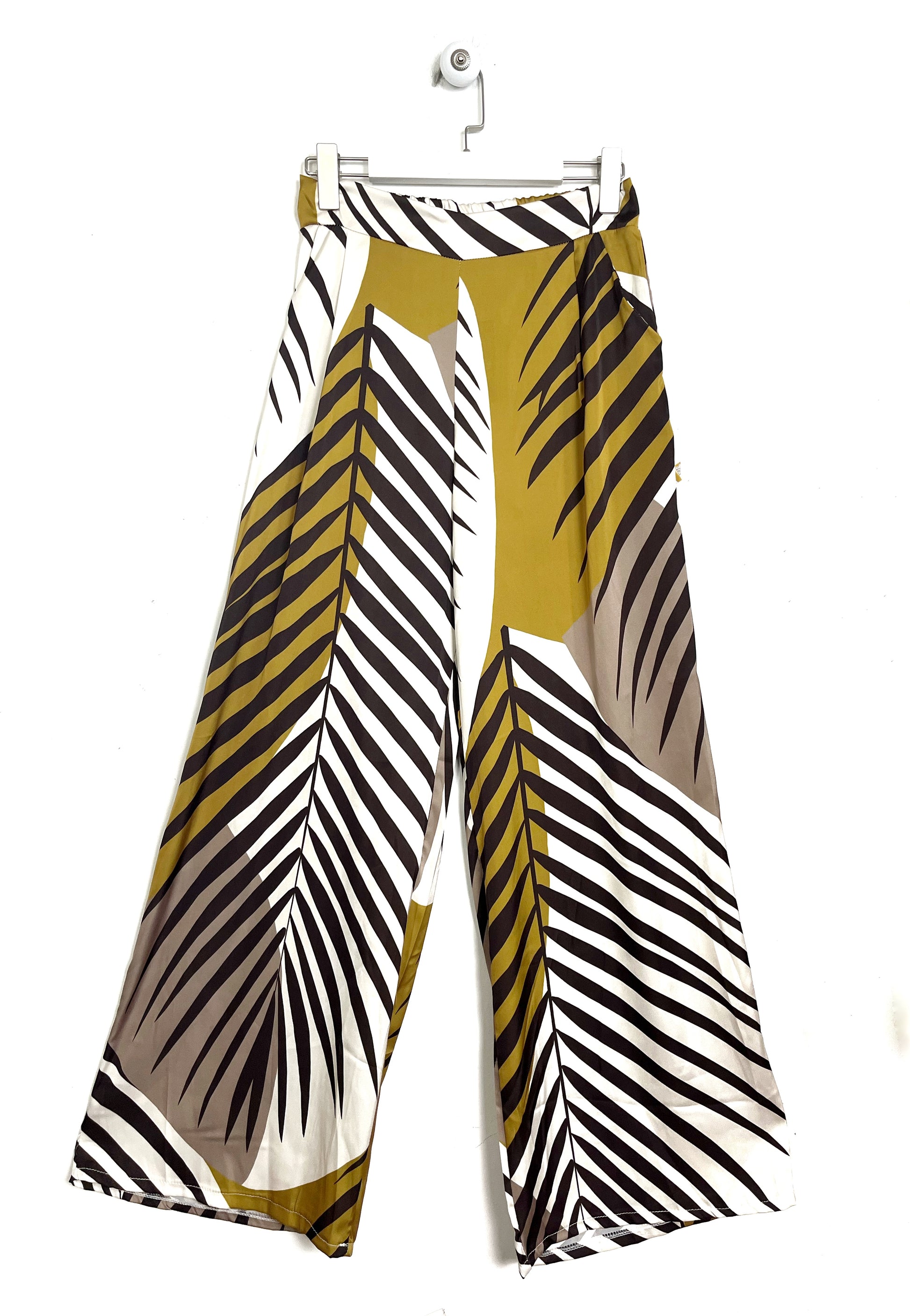 Il pantalone ha la vita alta con elastico dietro e baschina liscia sul davanti. Tasche laterali