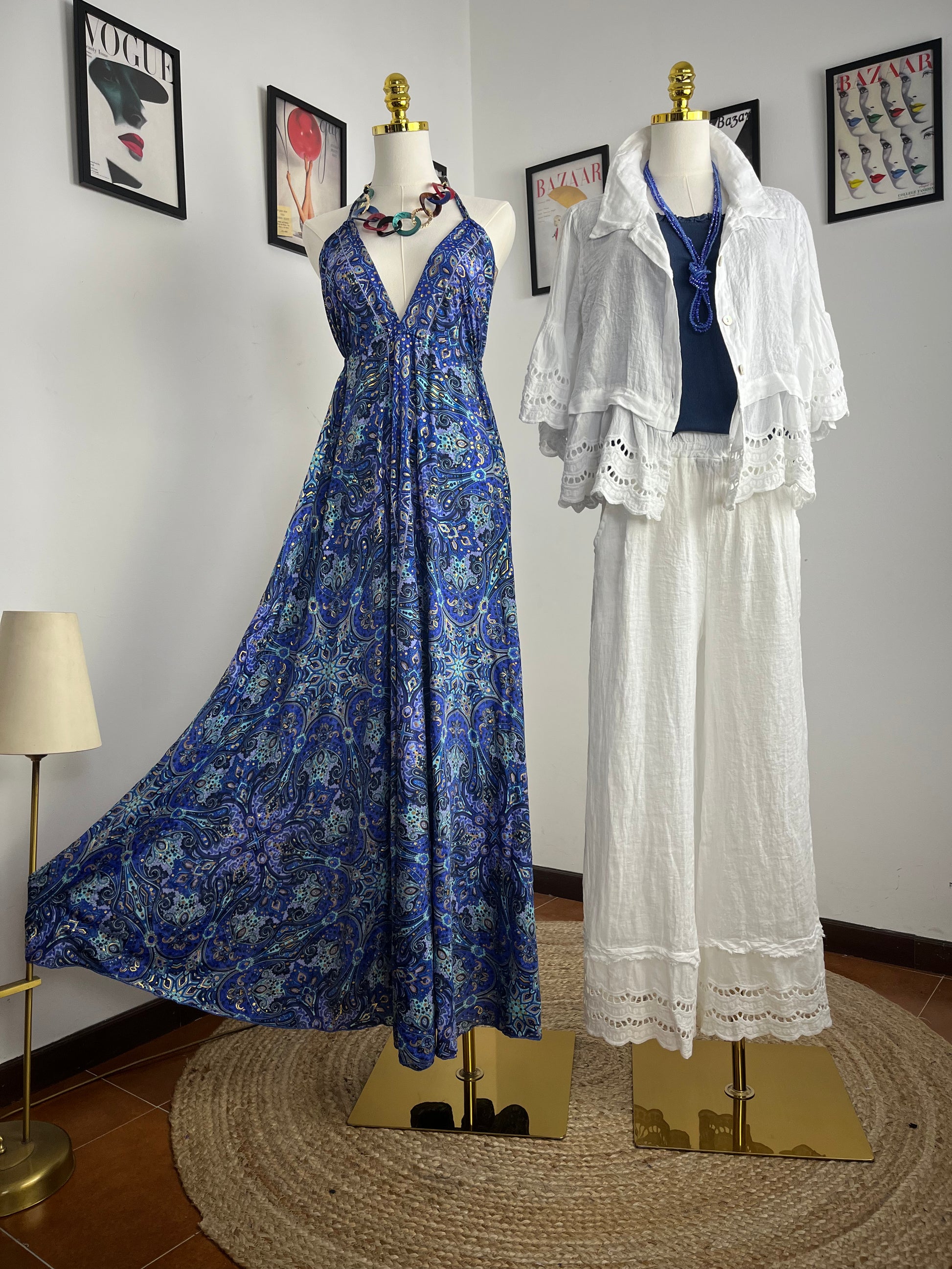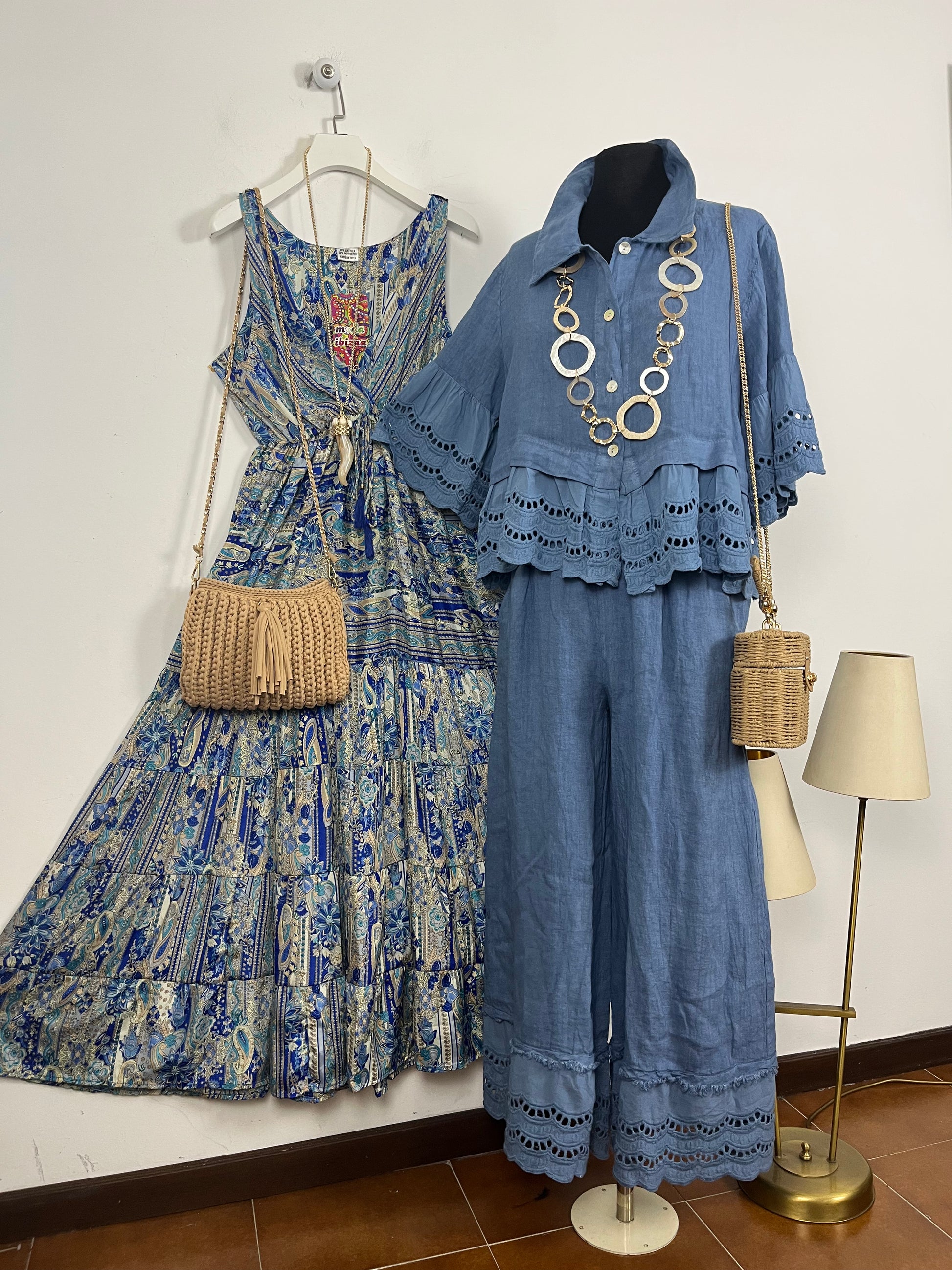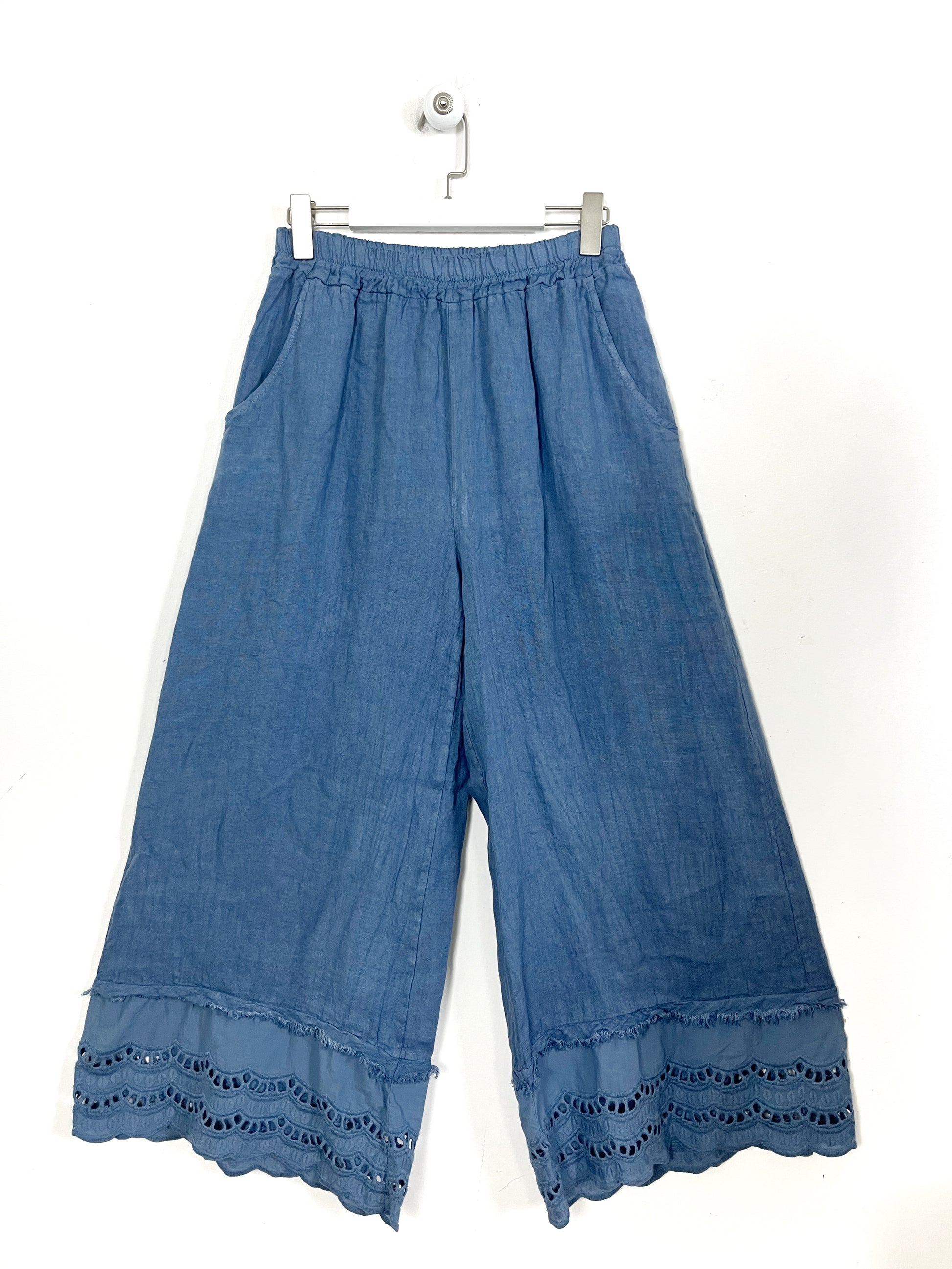 Pantalone gamba larga, elastico in vita, tasche laterali, lunghezza alla caviglia. Puzzo sangallo sul fondo.