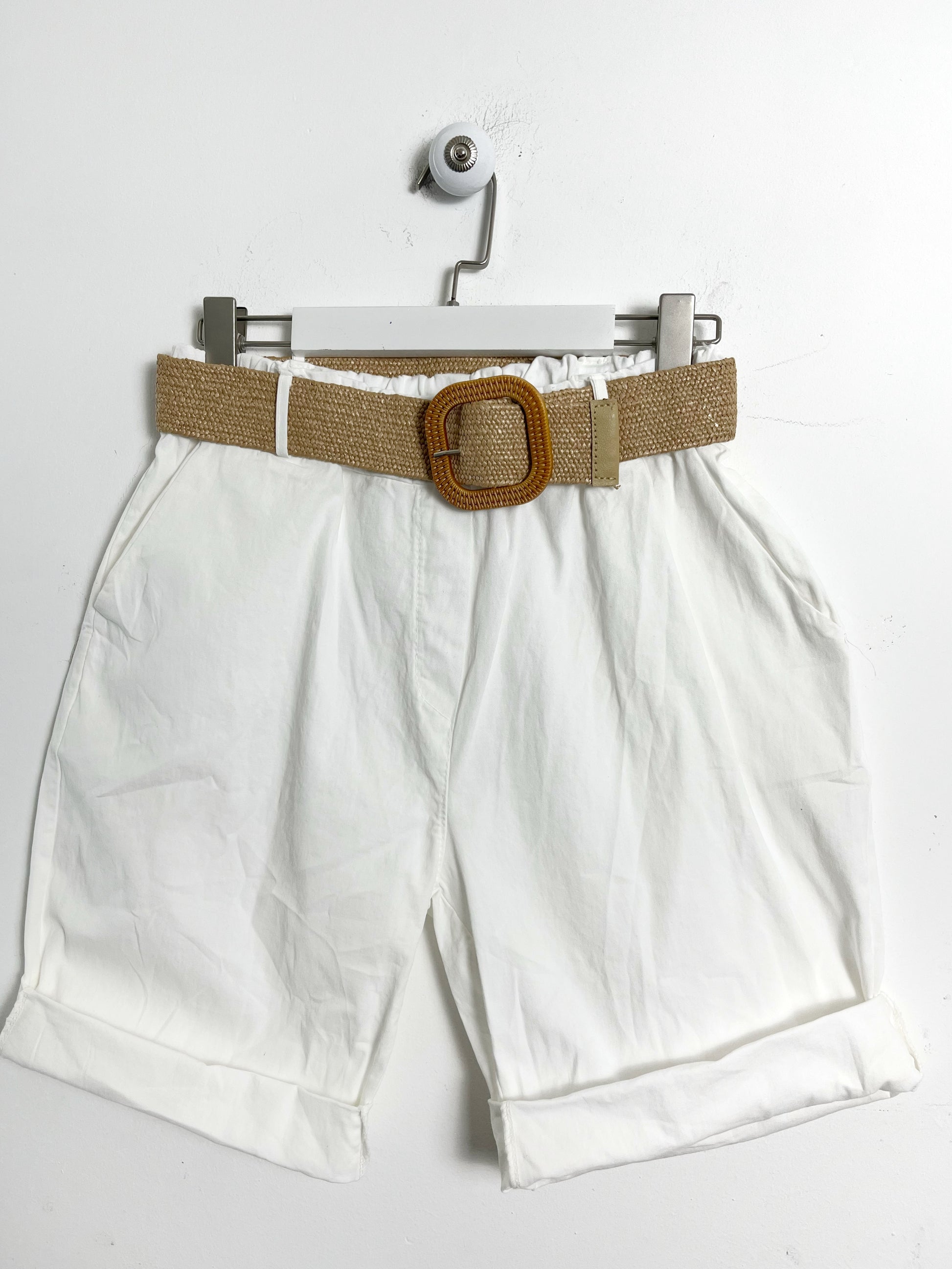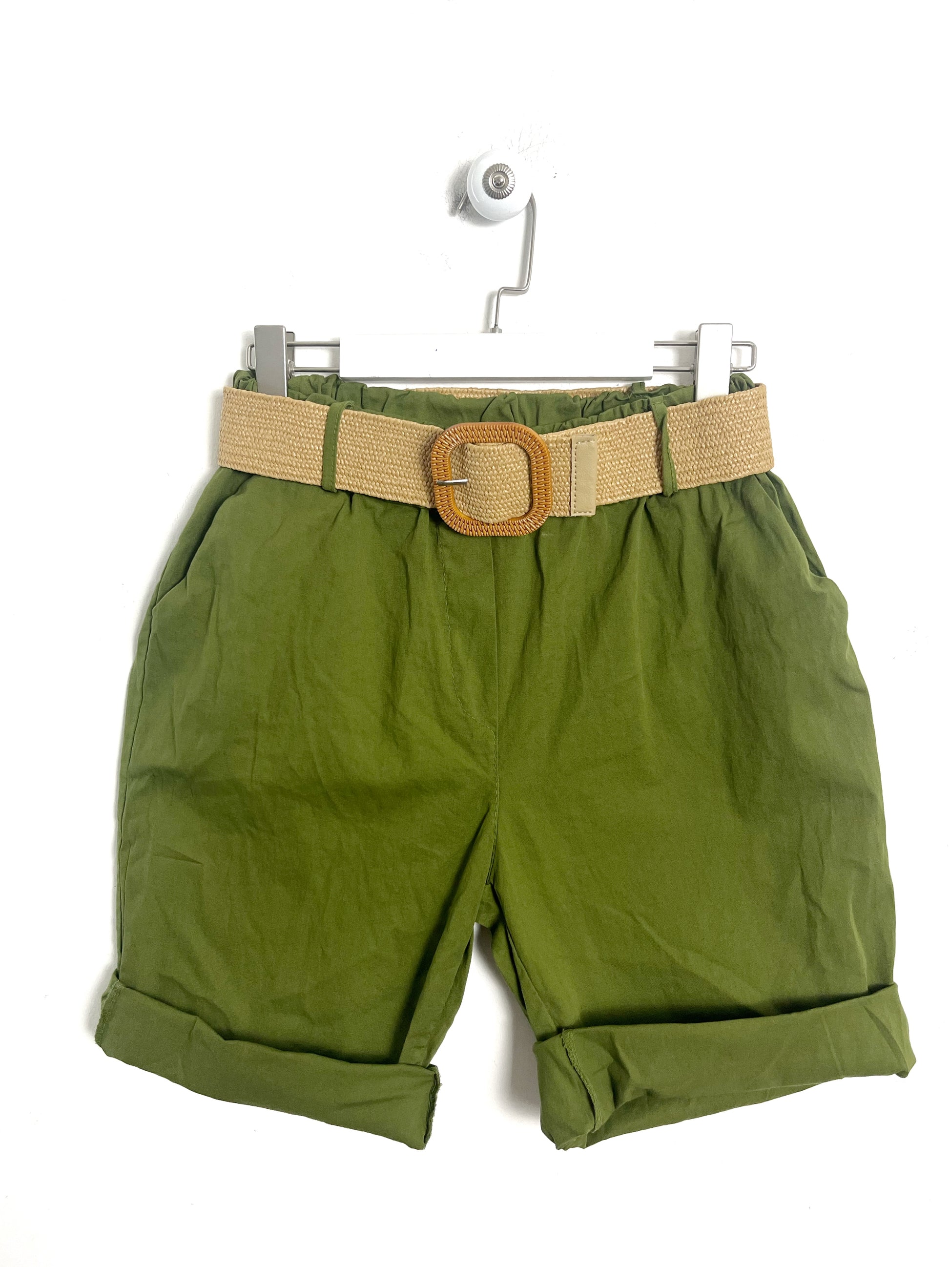 Bermuda in cotone leggero. Vita alta con elastico in vita, passanti con cintura. 2 tasche davanti oblique.