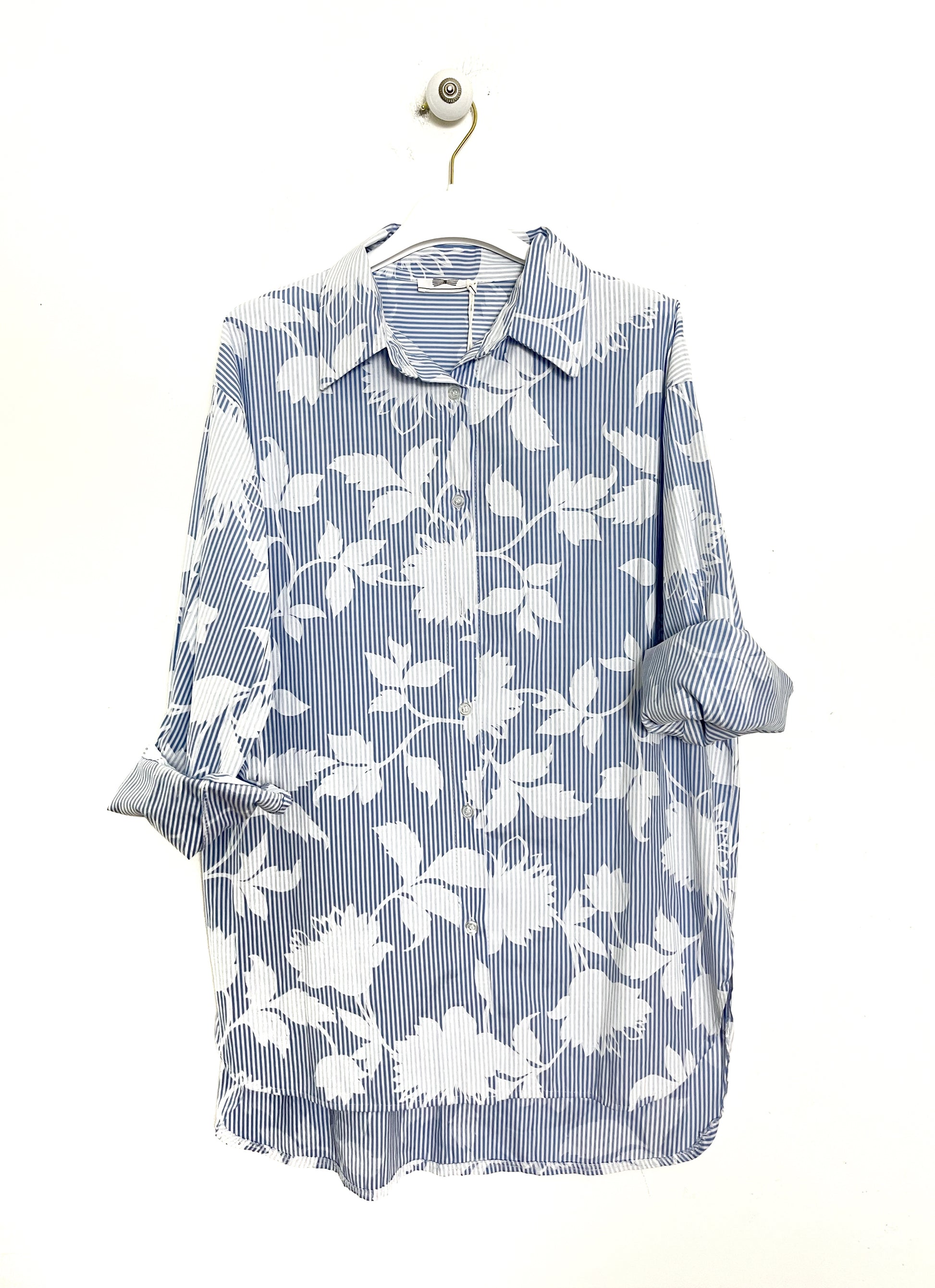 Camicia in misto cotone, con colletto tutta abbottonata sul davanti. Manica lunga risvoltata, stondata sul fondo, corta davanti più lunga dietro.