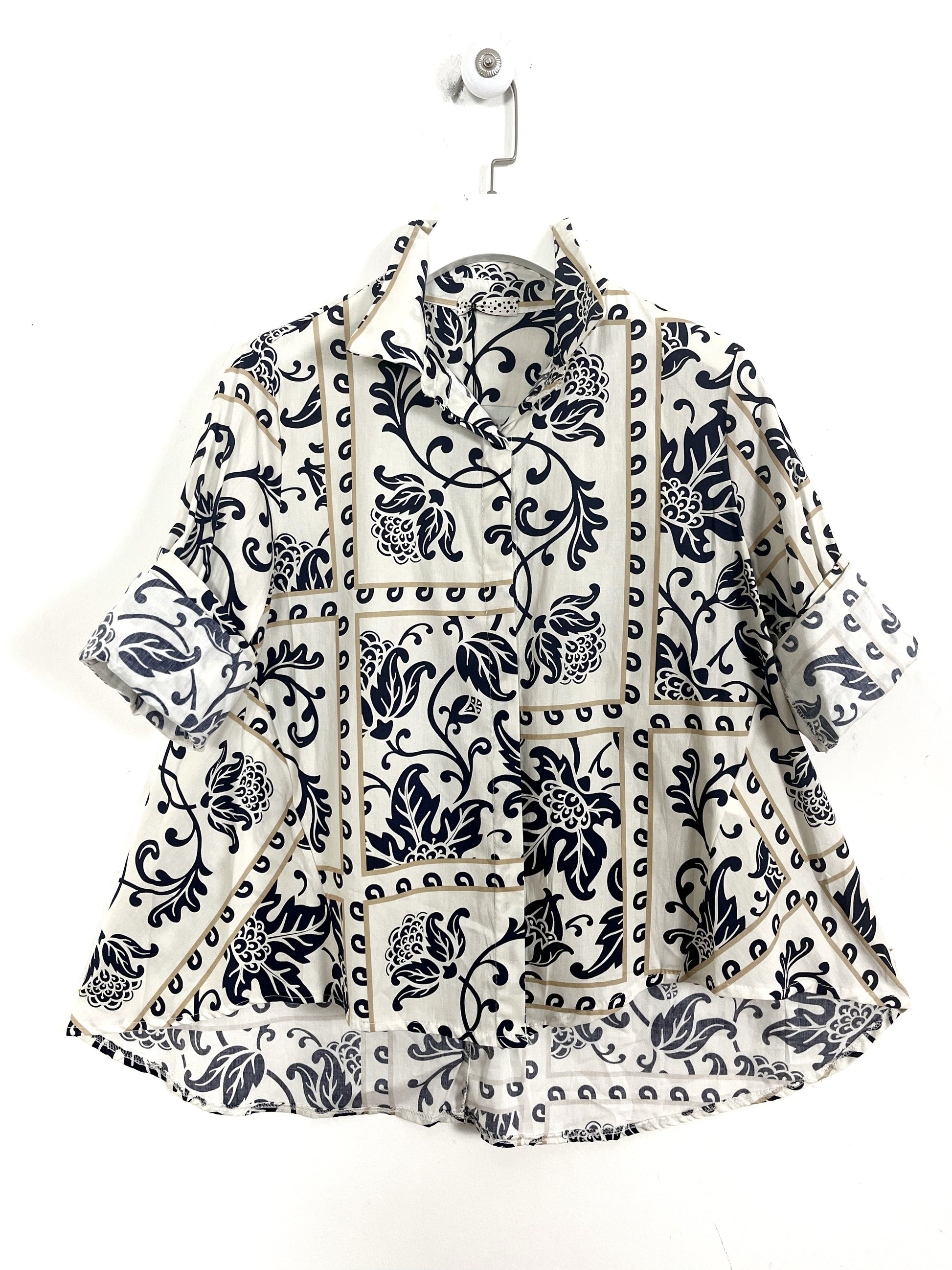 Camicia di cotone con colletto, tutta abbottonata. Manica lunga risvoltata. Svasata sotto, più lunga dietro.