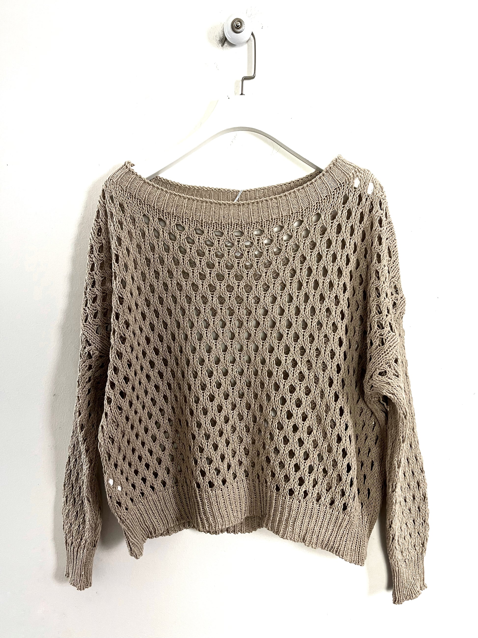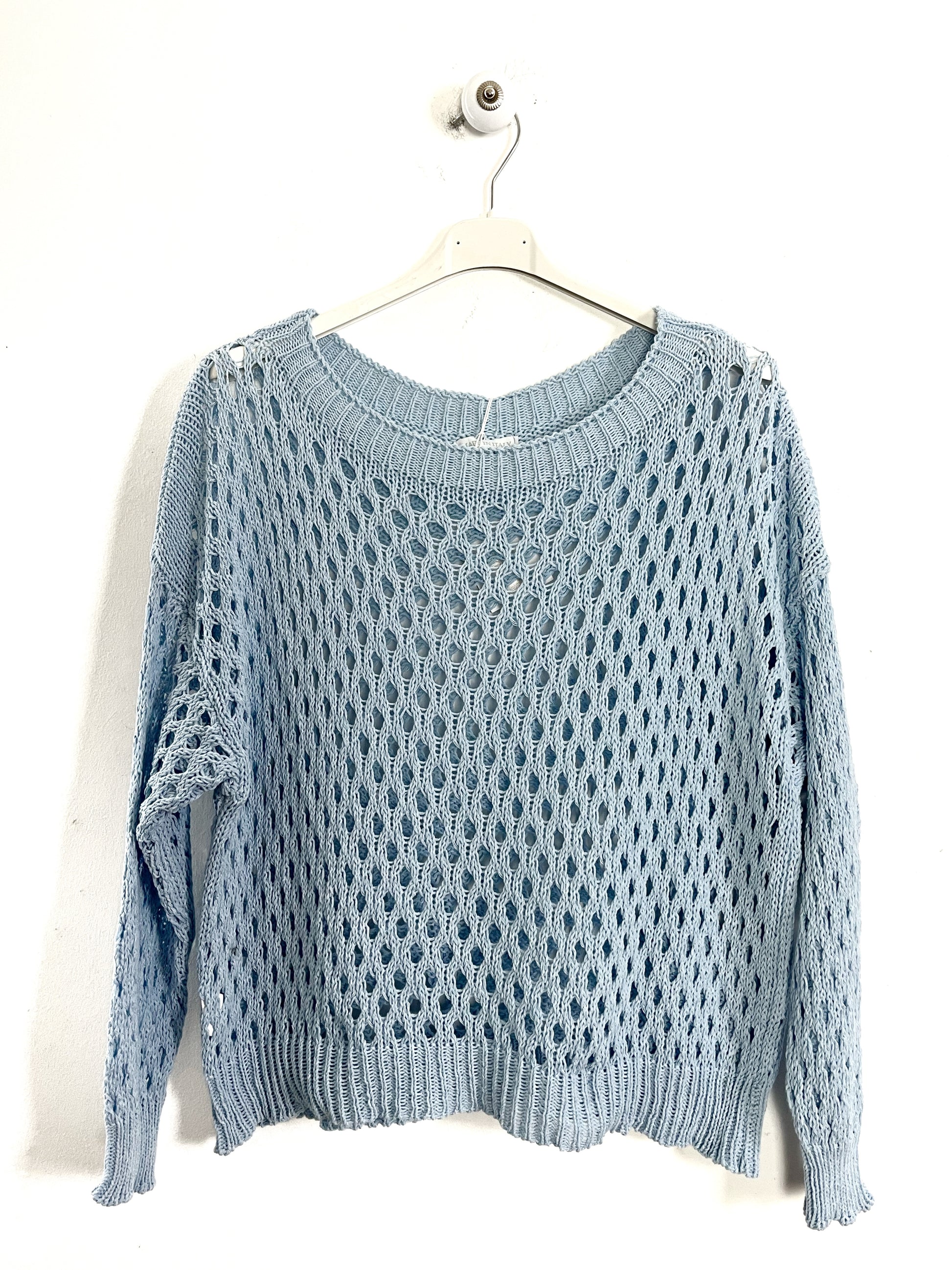 Maglioncino cropped in filo di cotone traforato, con spalla ribassata. Manica lunga