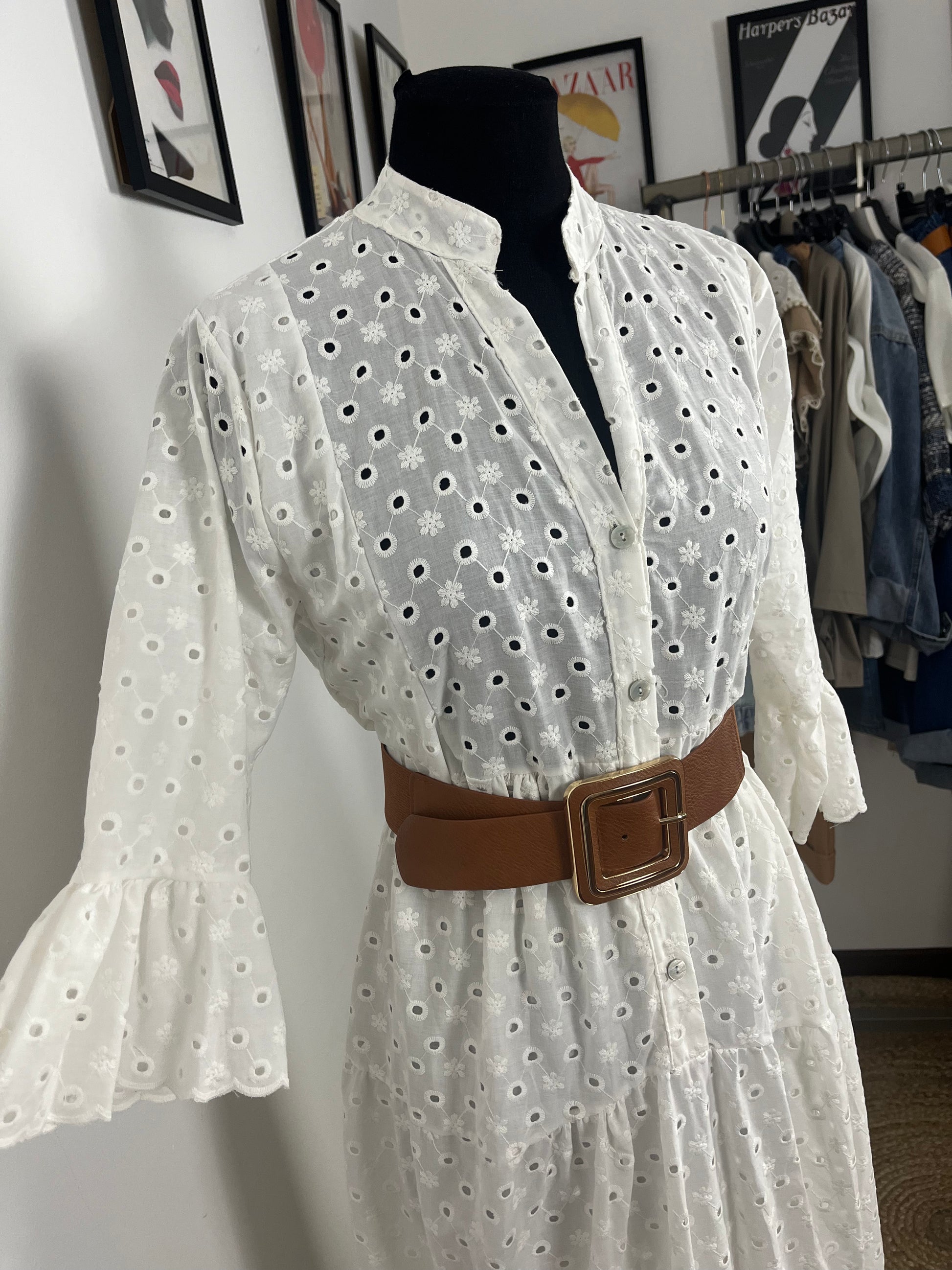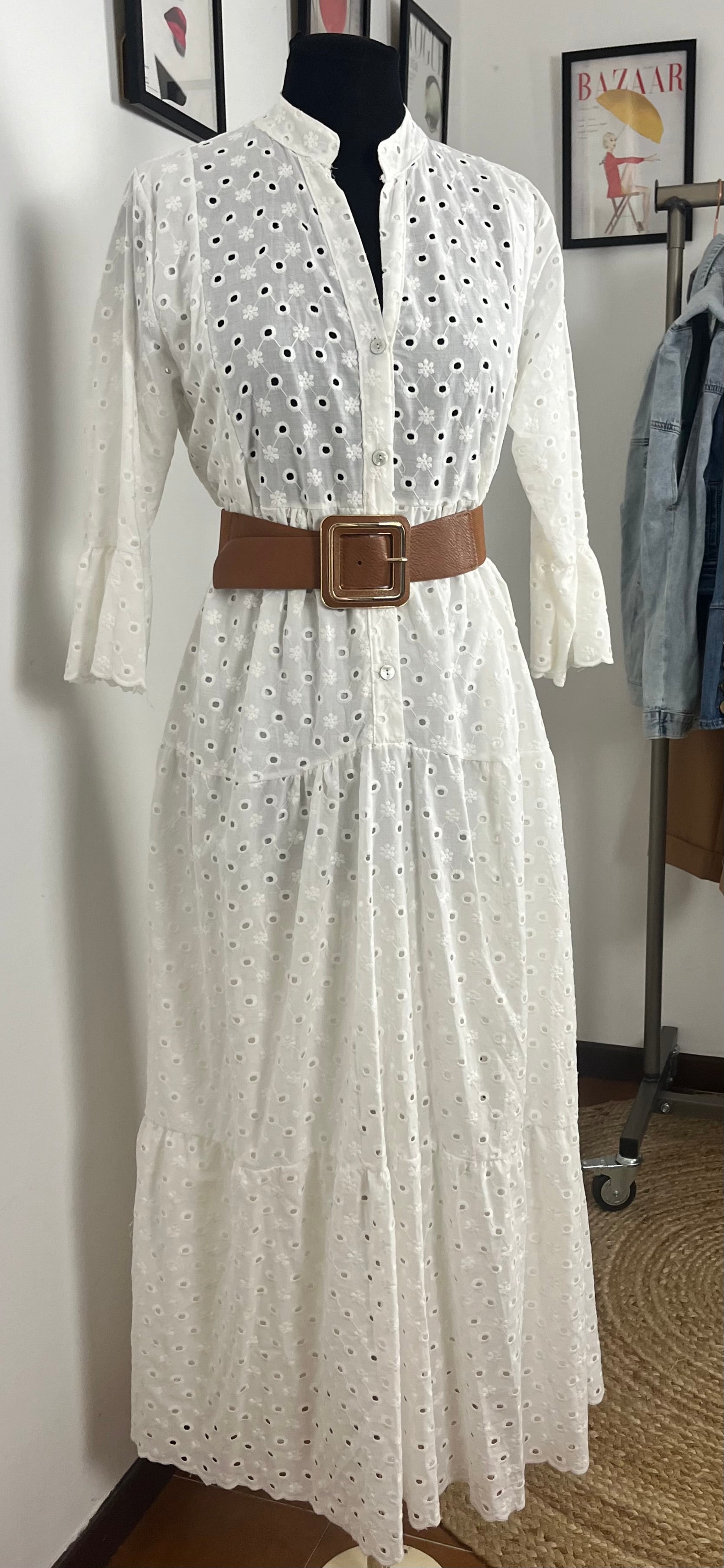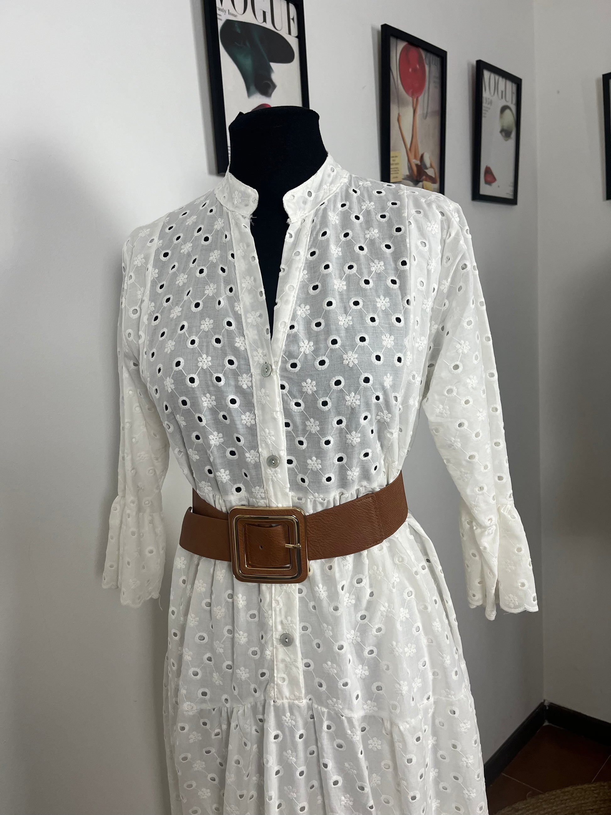 Abito lungo, con colletto a coreana, manica tre quarti. Tutto abbottonato sul. Bottoncini in chiusura sul davanti fino alla vita, foderato