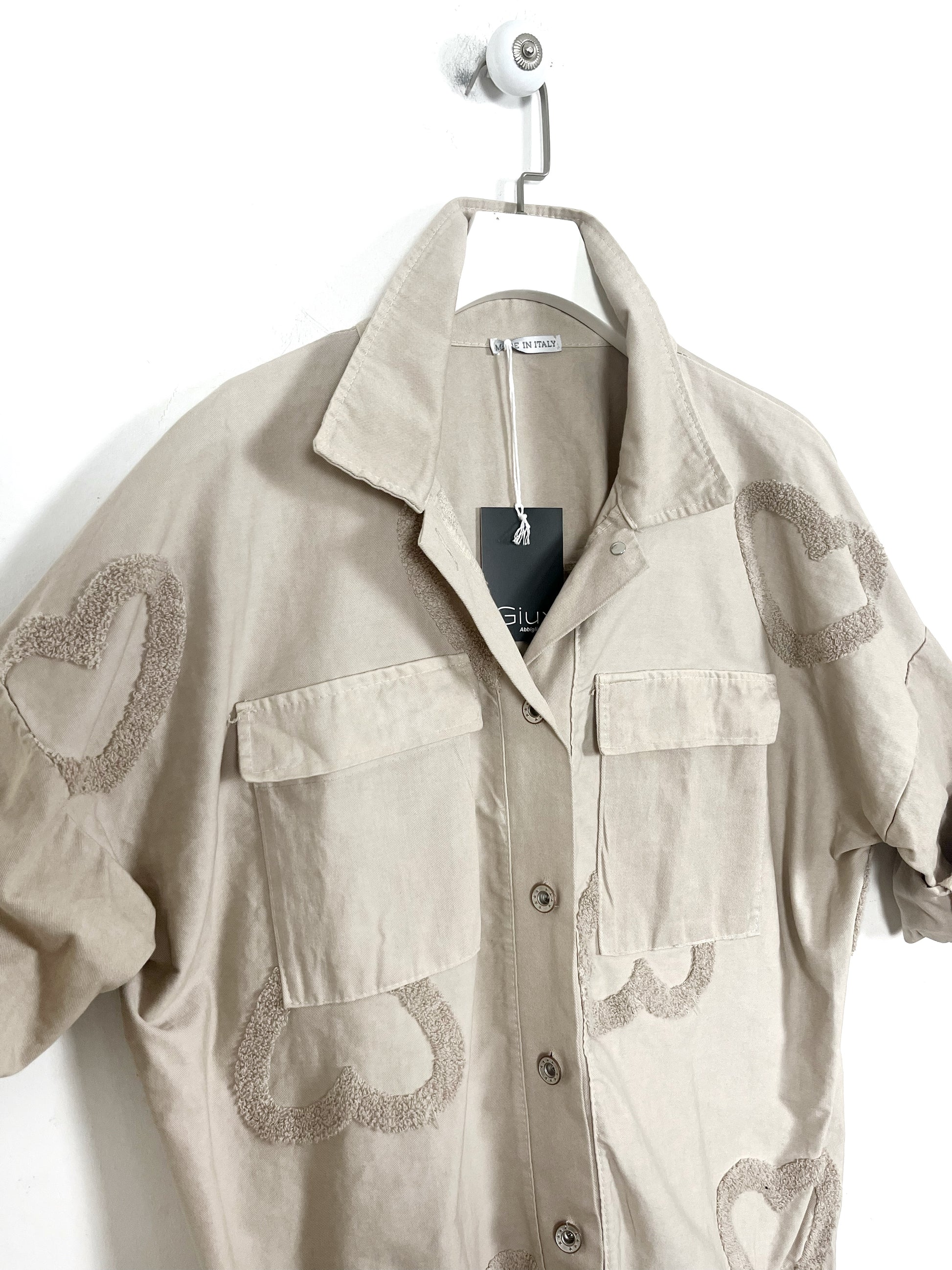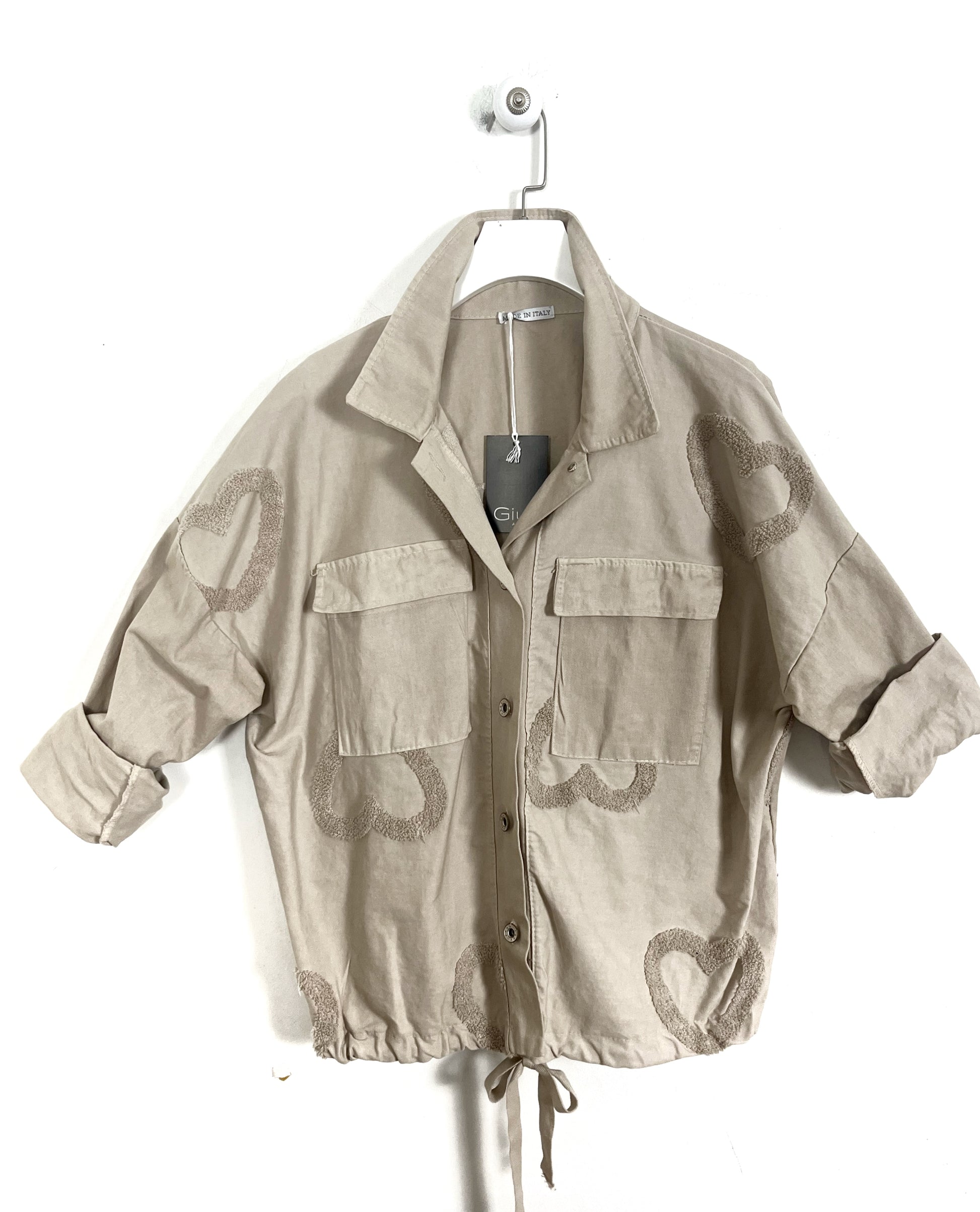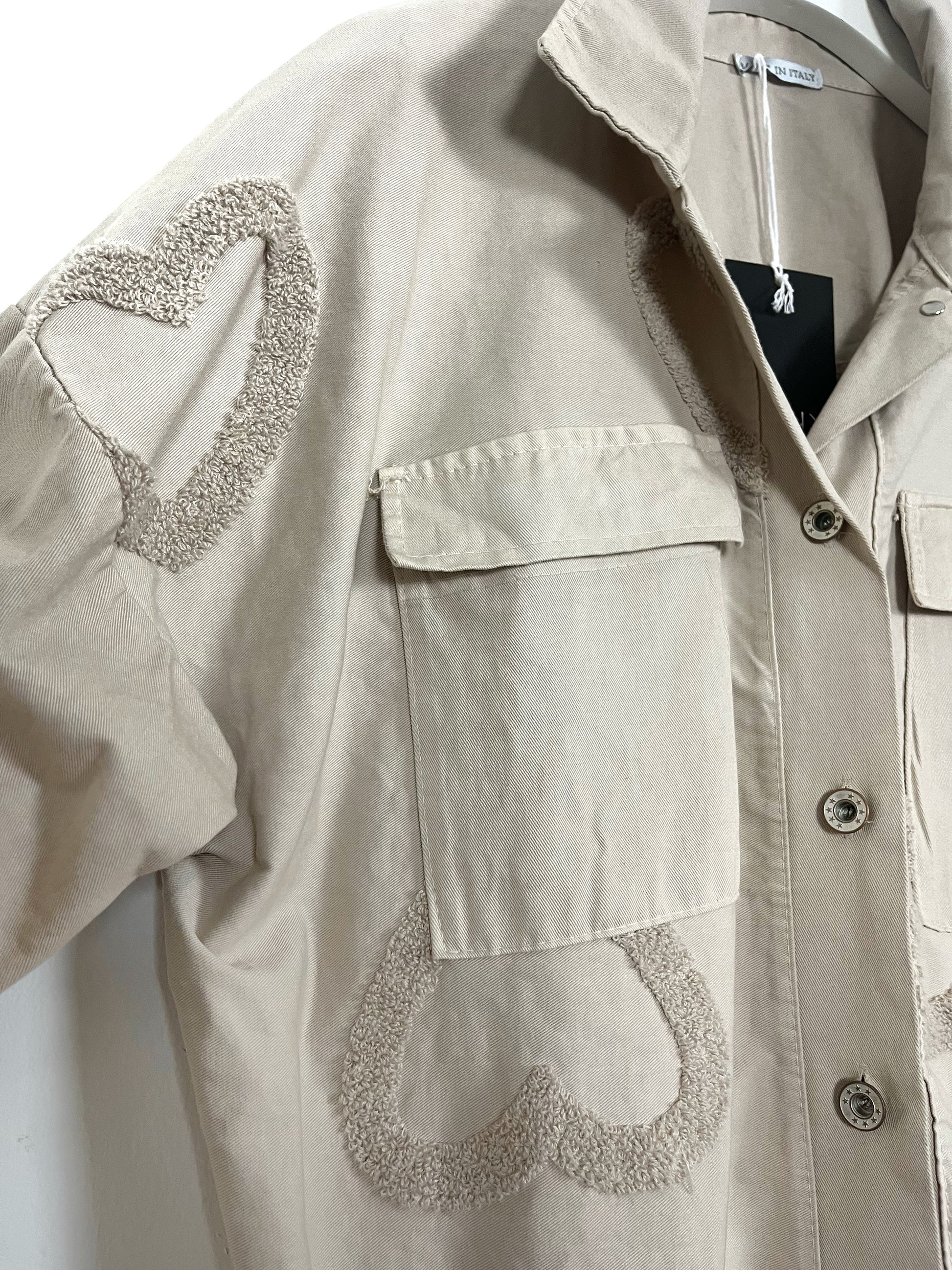 Giubbino in cotone elasticizzato. Chiusura con bottoni. 2 Tasche applicate con patta. Manica lunga con polsino e bottone, spalla ribassata. Arricciatura con coulisse sul fondo. Disegni in rilievo.