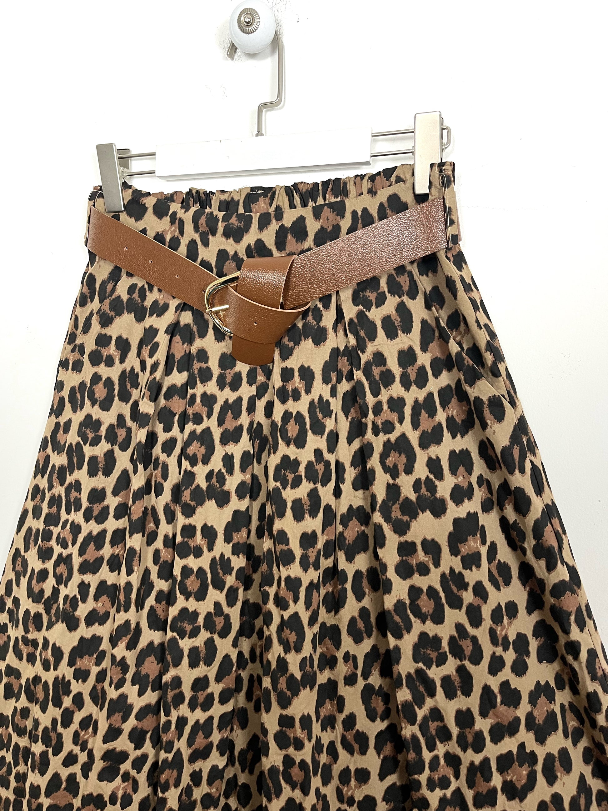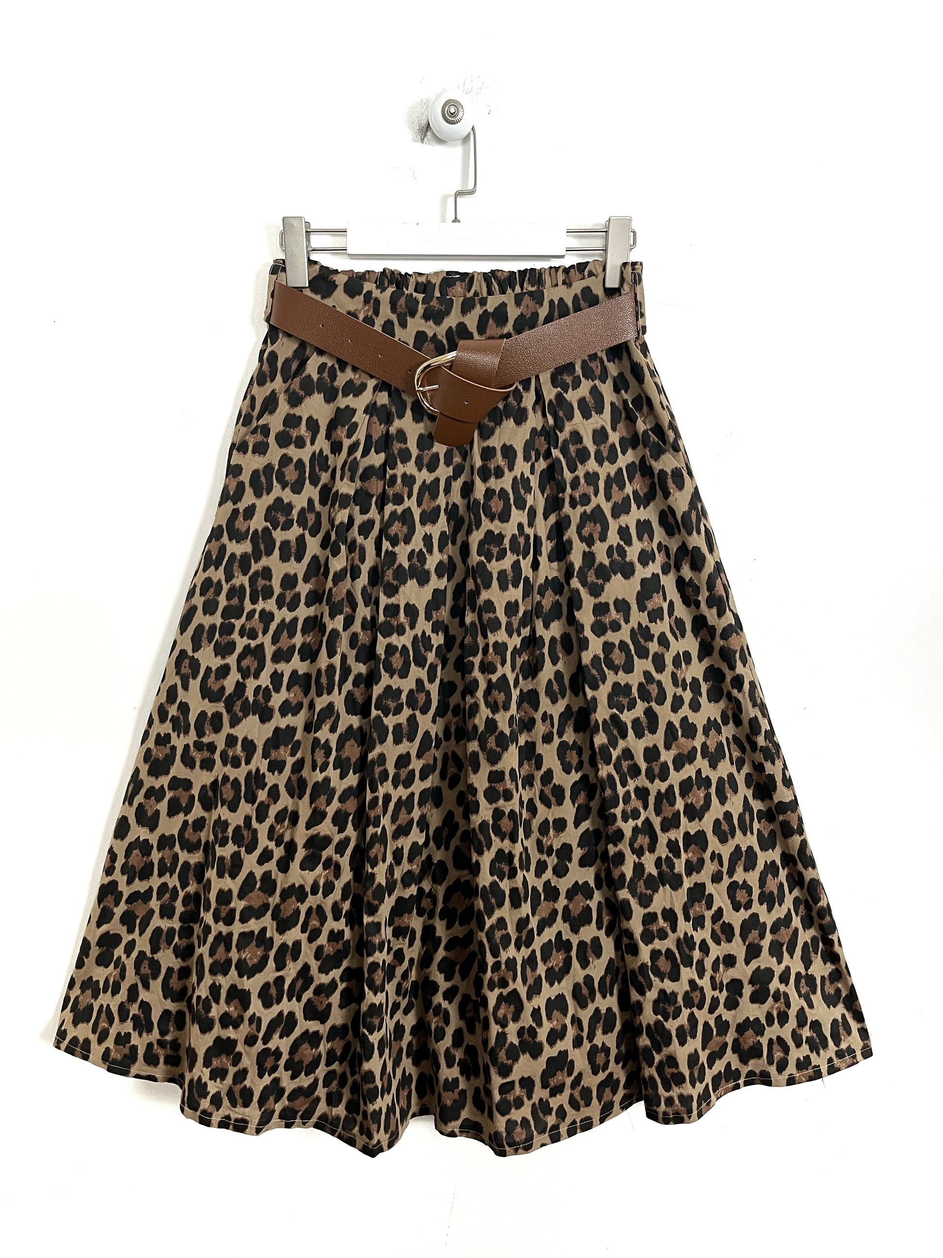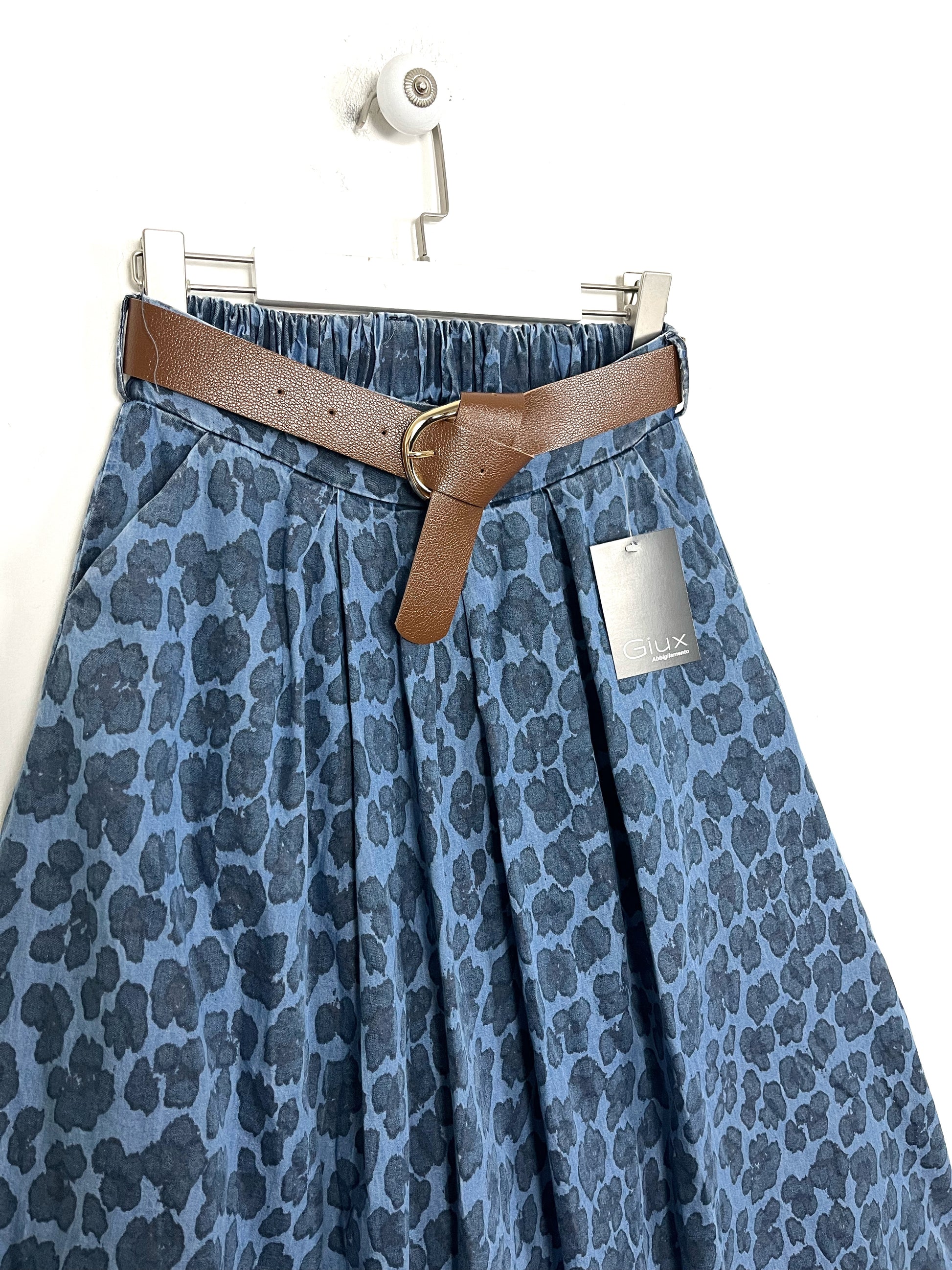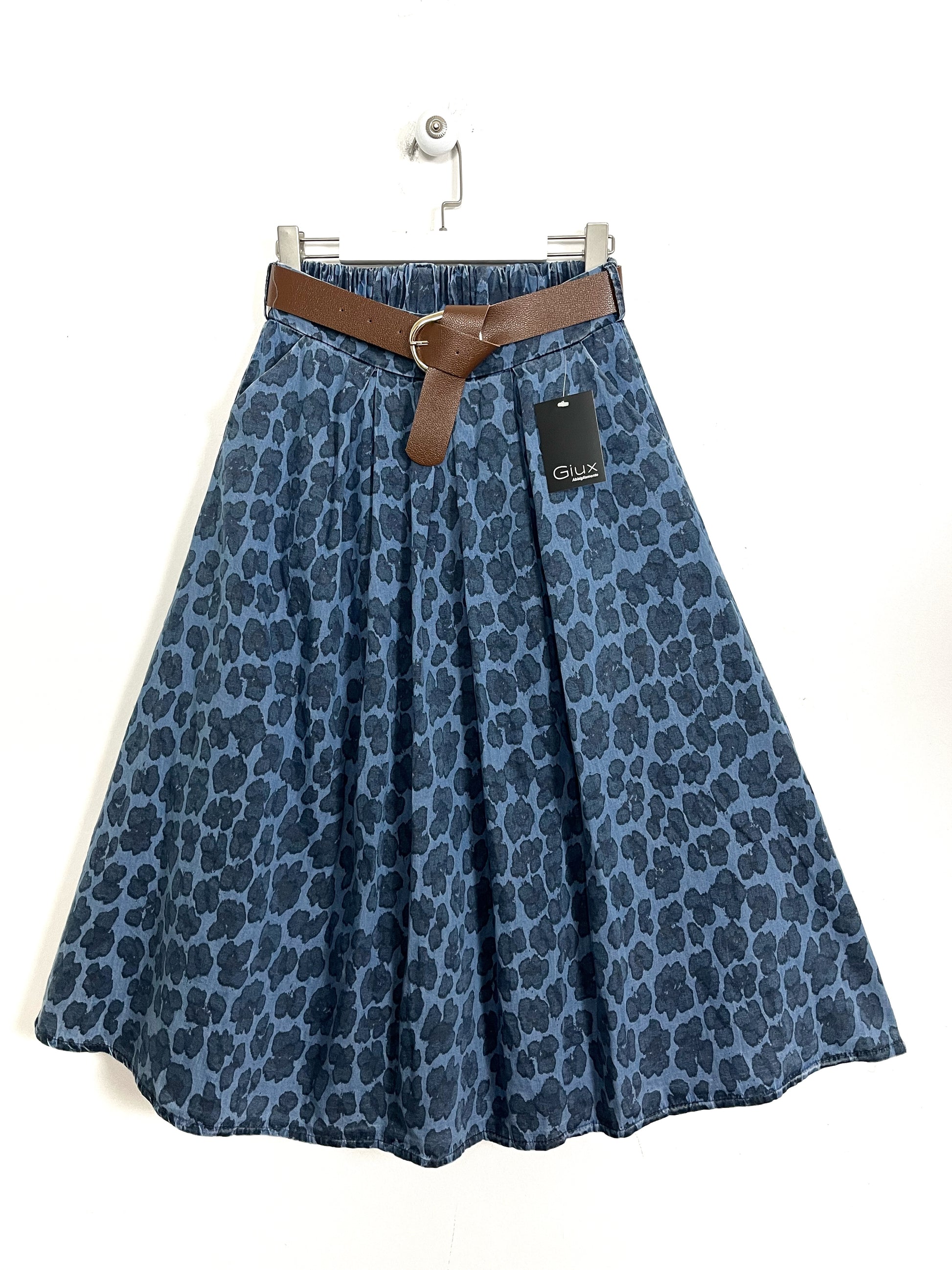 Gonna in cotone lunghezza midi, baschina sul davanti in vita, elastico dietro. Passanti con cintura in ecopelle.