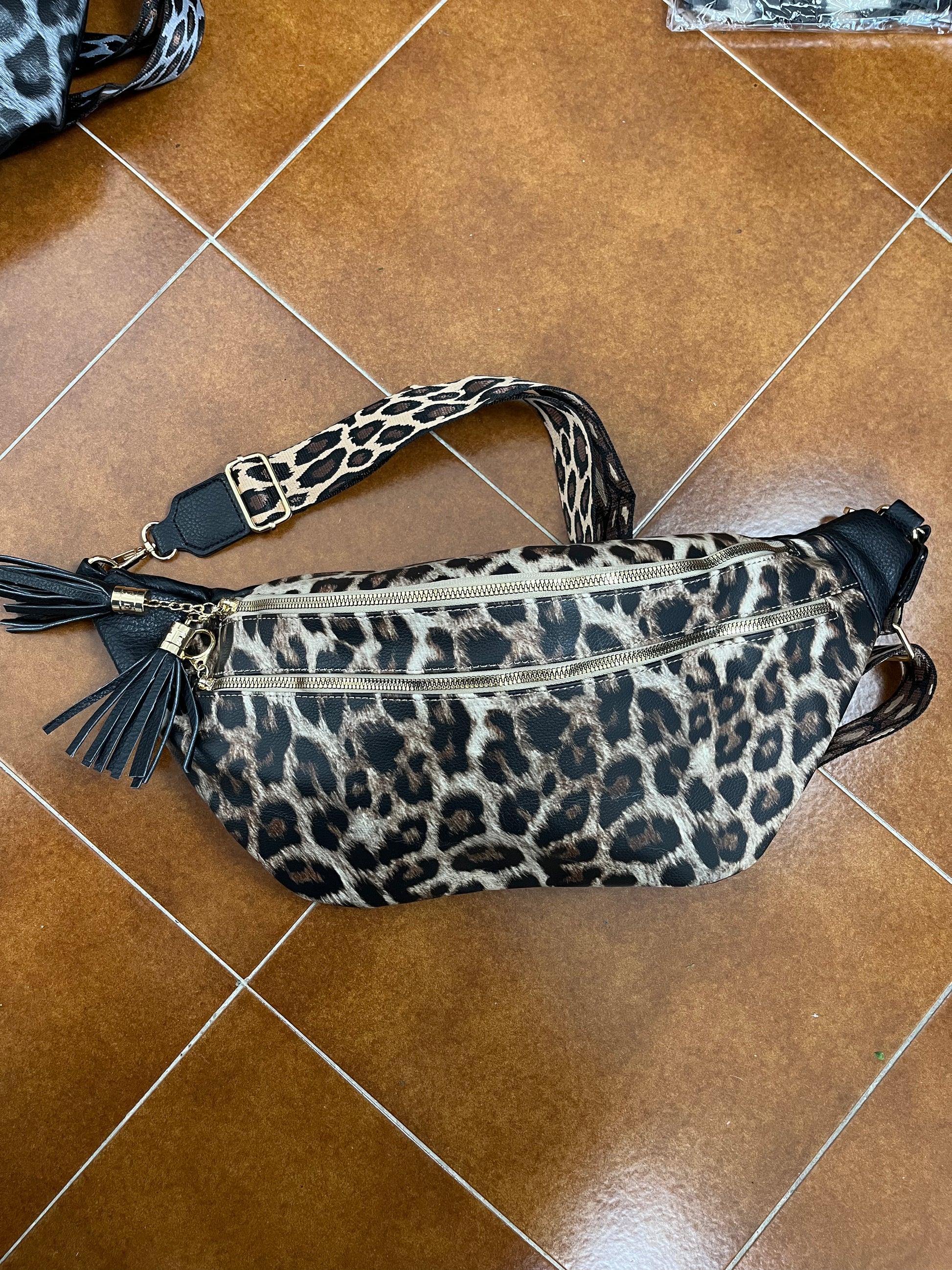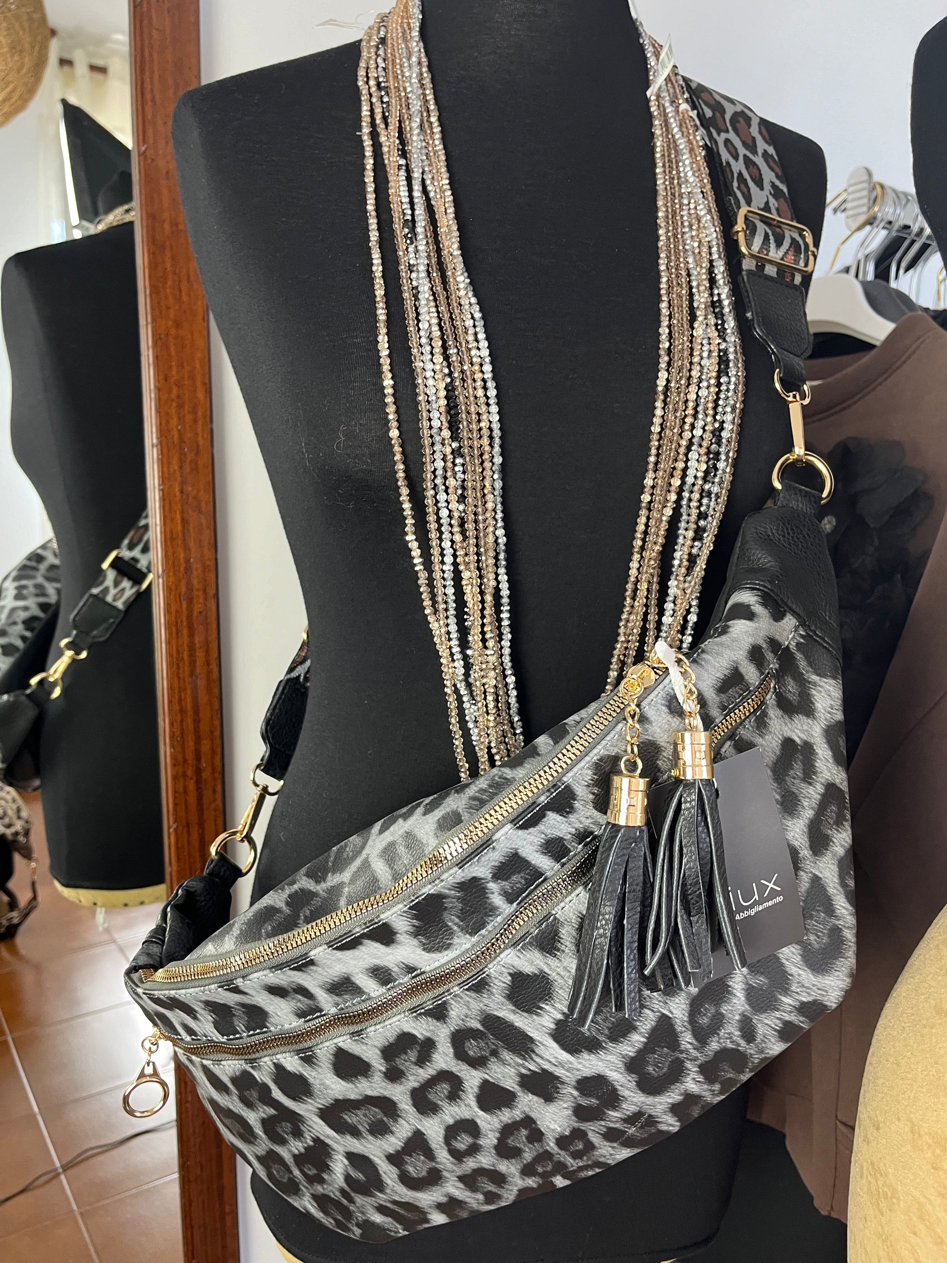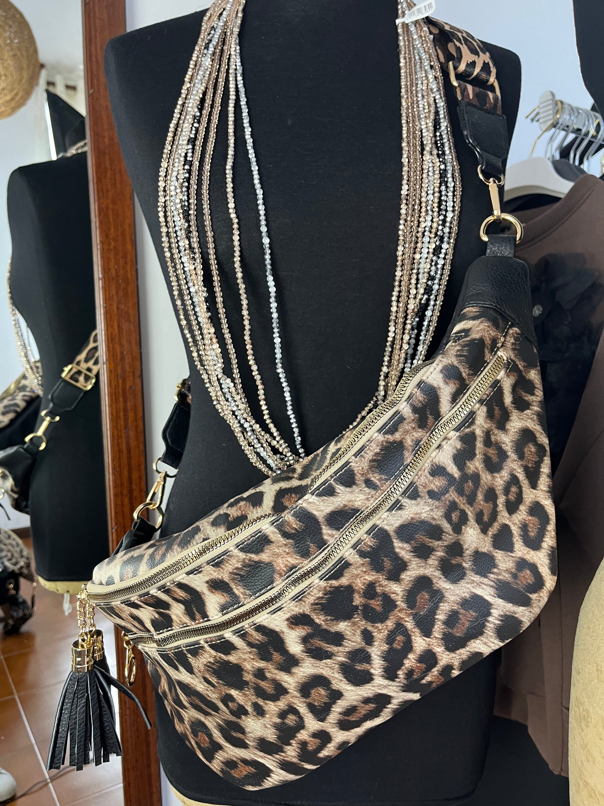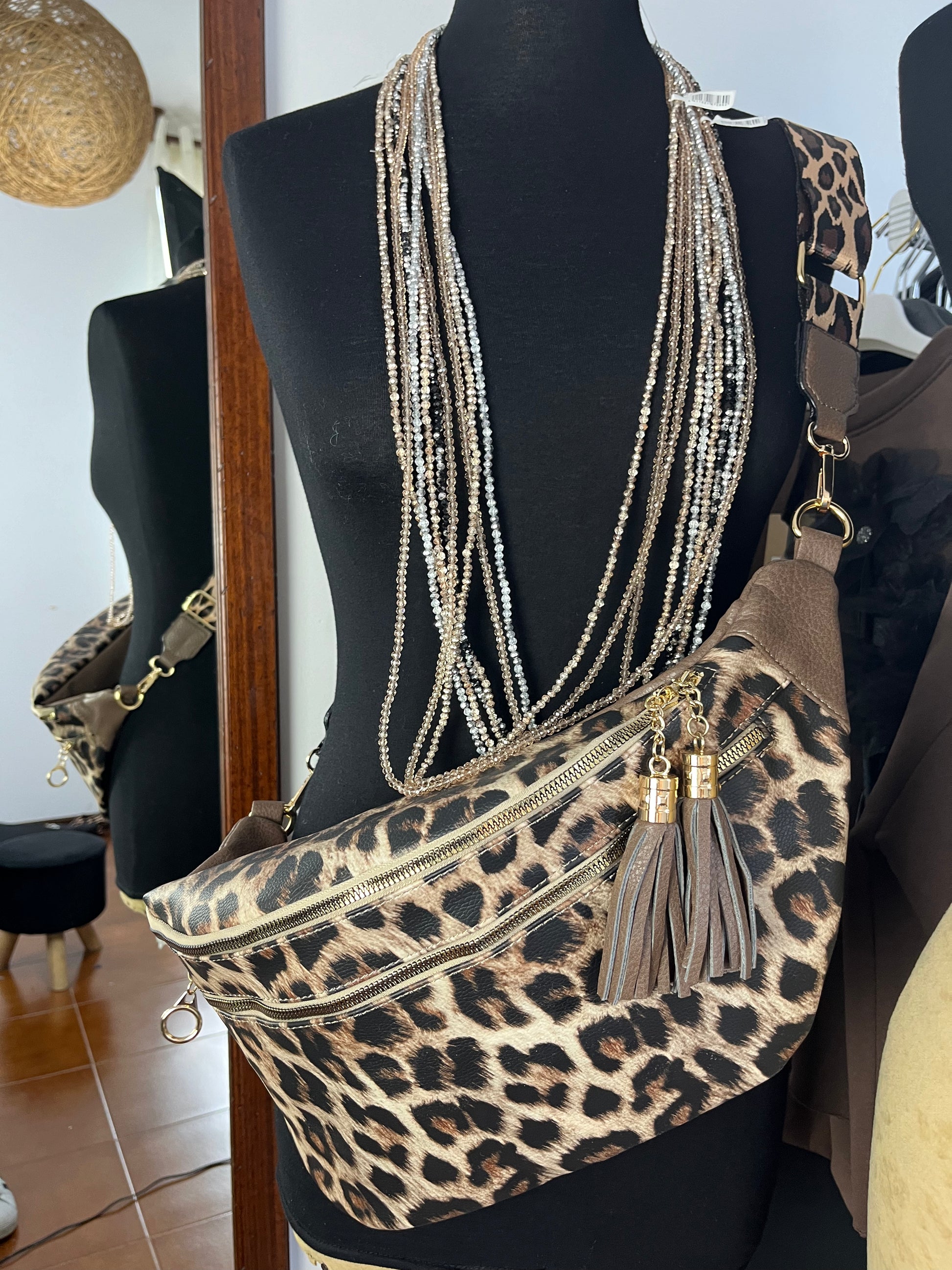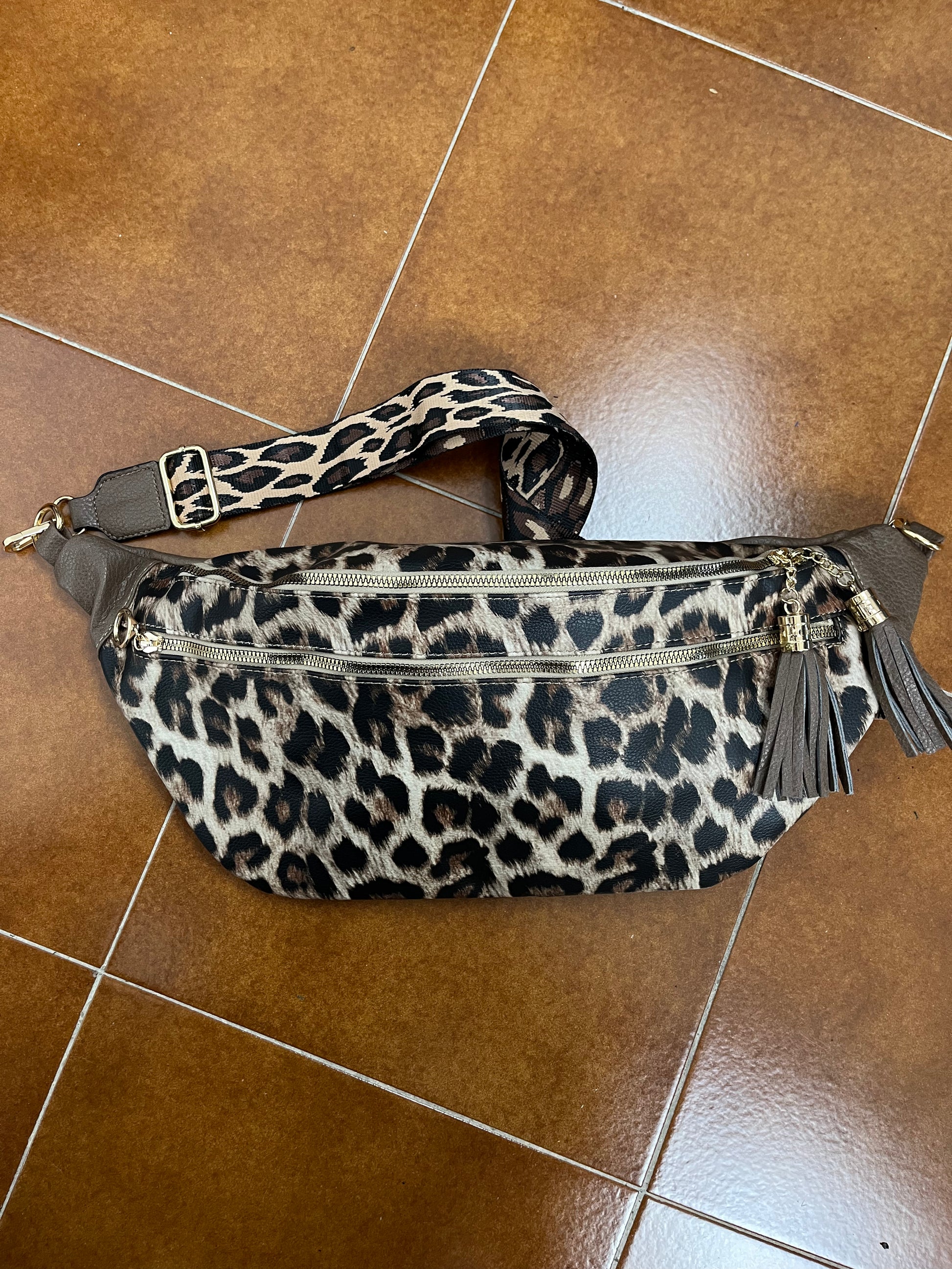 Marsupio in ecopelle con tracolla in tessuto fantasia. Taschina dietro e taschine allinterno. Chiusura con cerniera.