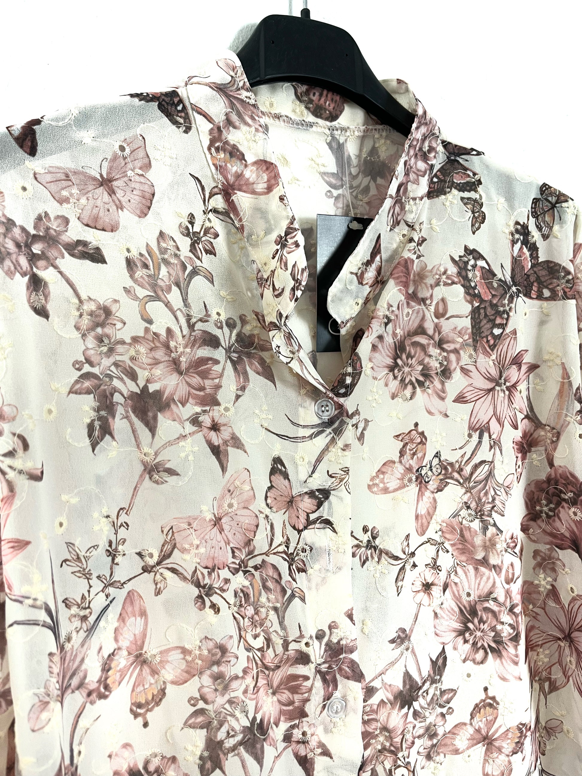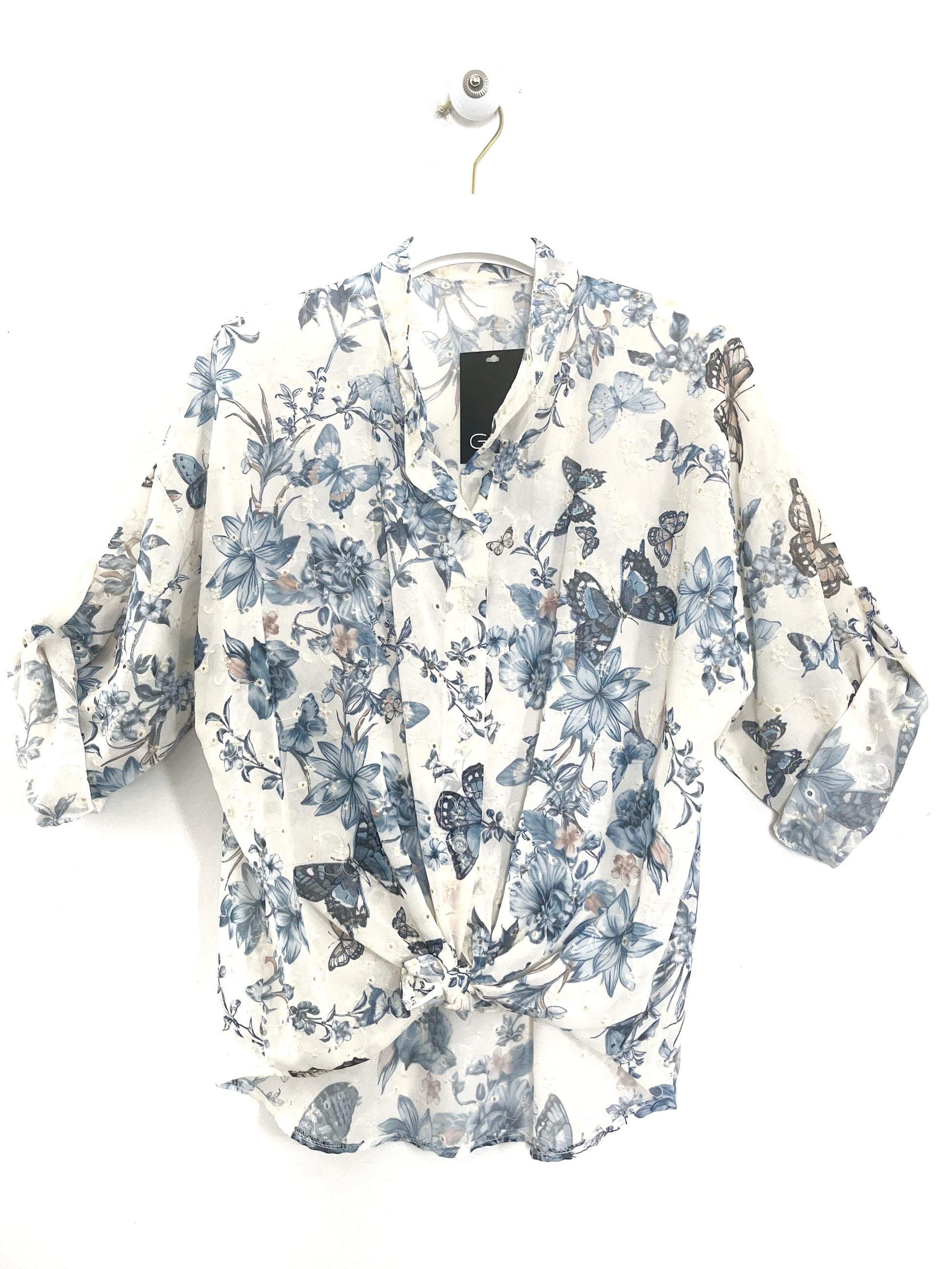 Coreana in misto cotone leggero traforato, manica tre quarti rivoltata. Corta da vanti, più lunga e stondata dietro. Spalla ribassata.