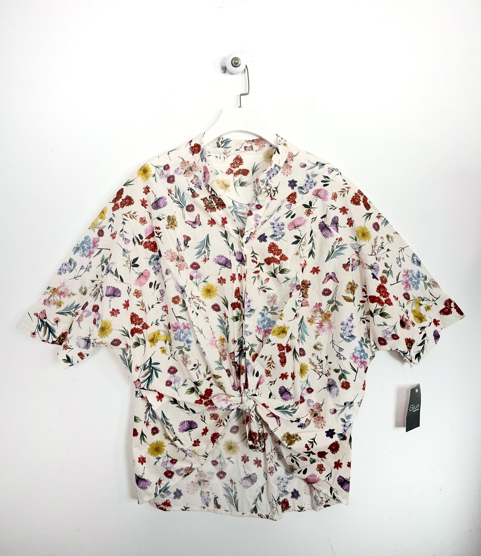 Camicia fantasia in cotone , manica tre quarti rivoltata. Spalla ribassata.