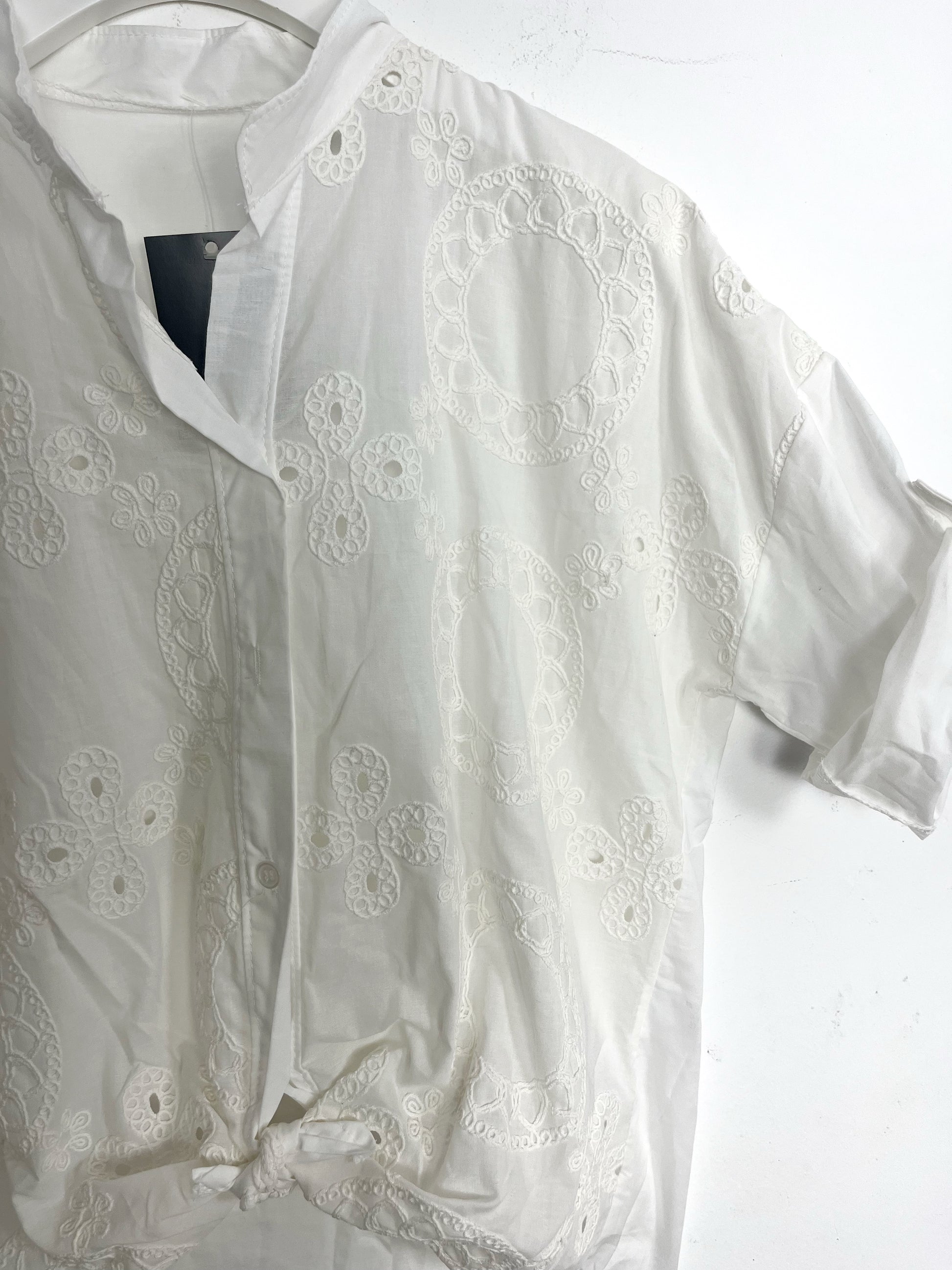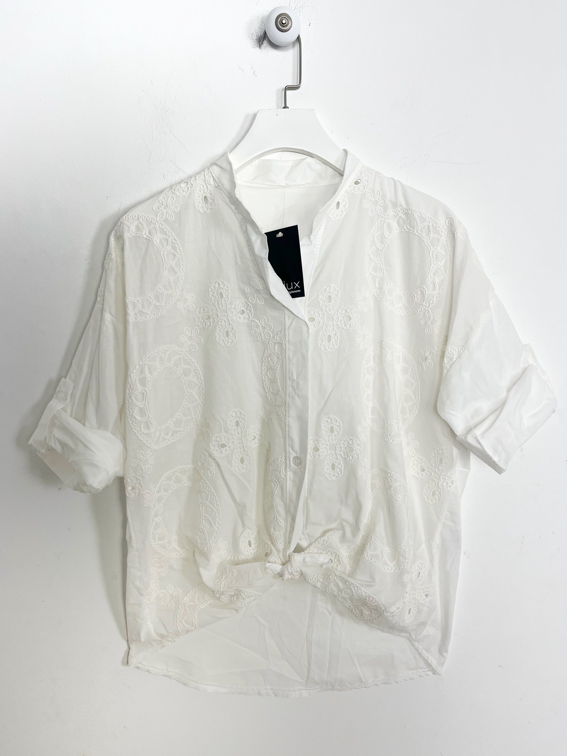 Camicia con colletto a coreana in puro cotone, tutta ricamata sul davanti. Chiusura con bottoncini. Spalla ribassata, manica tre quarti risvoltata.