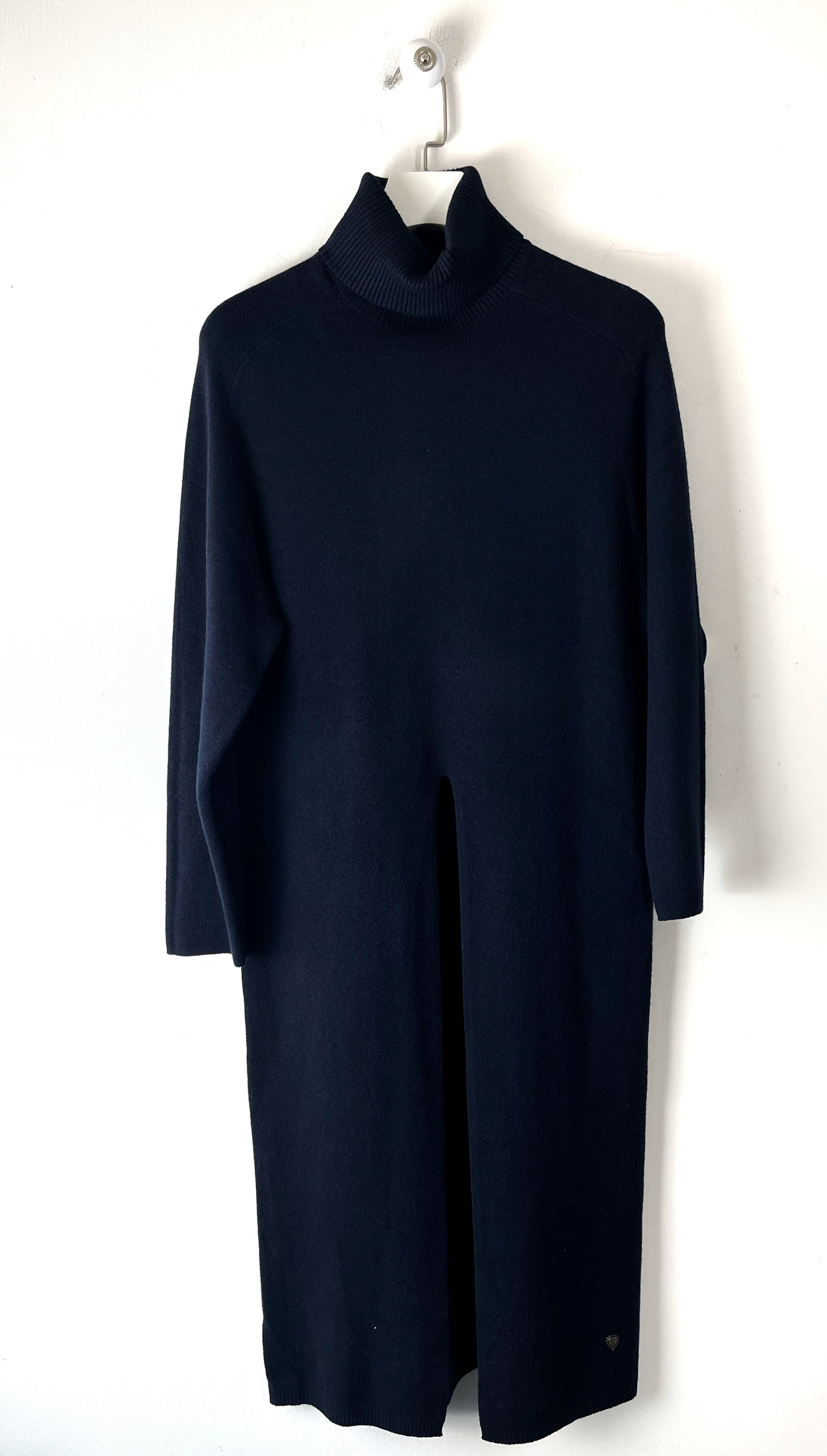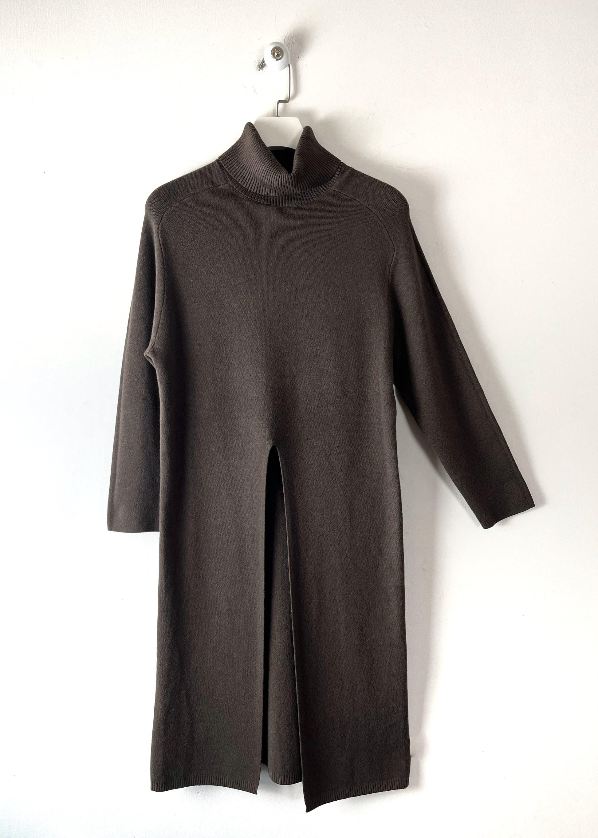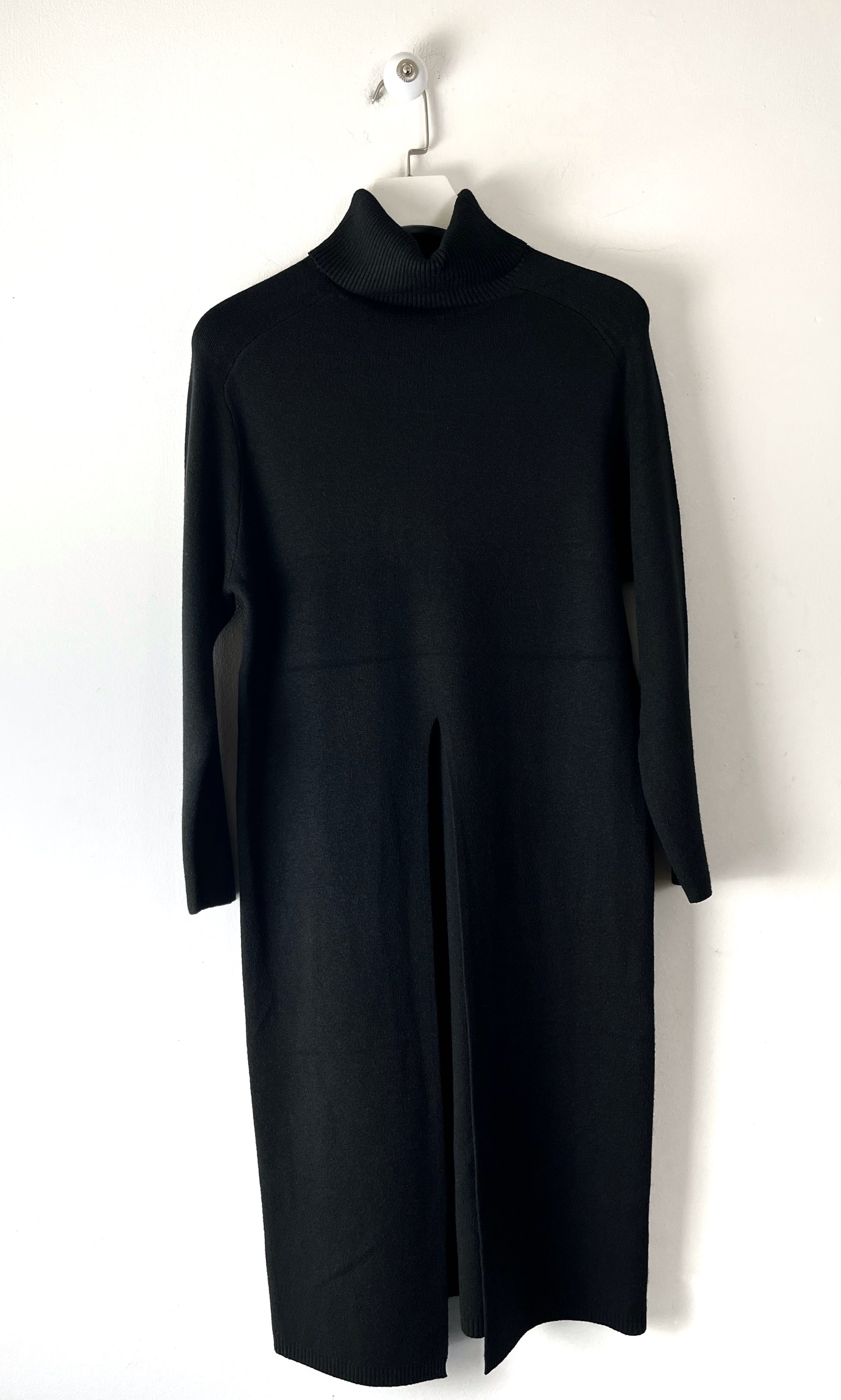 Maxi dolcevita in calda viscosa, spacco profondo sul davanti. Spalla ribassata.