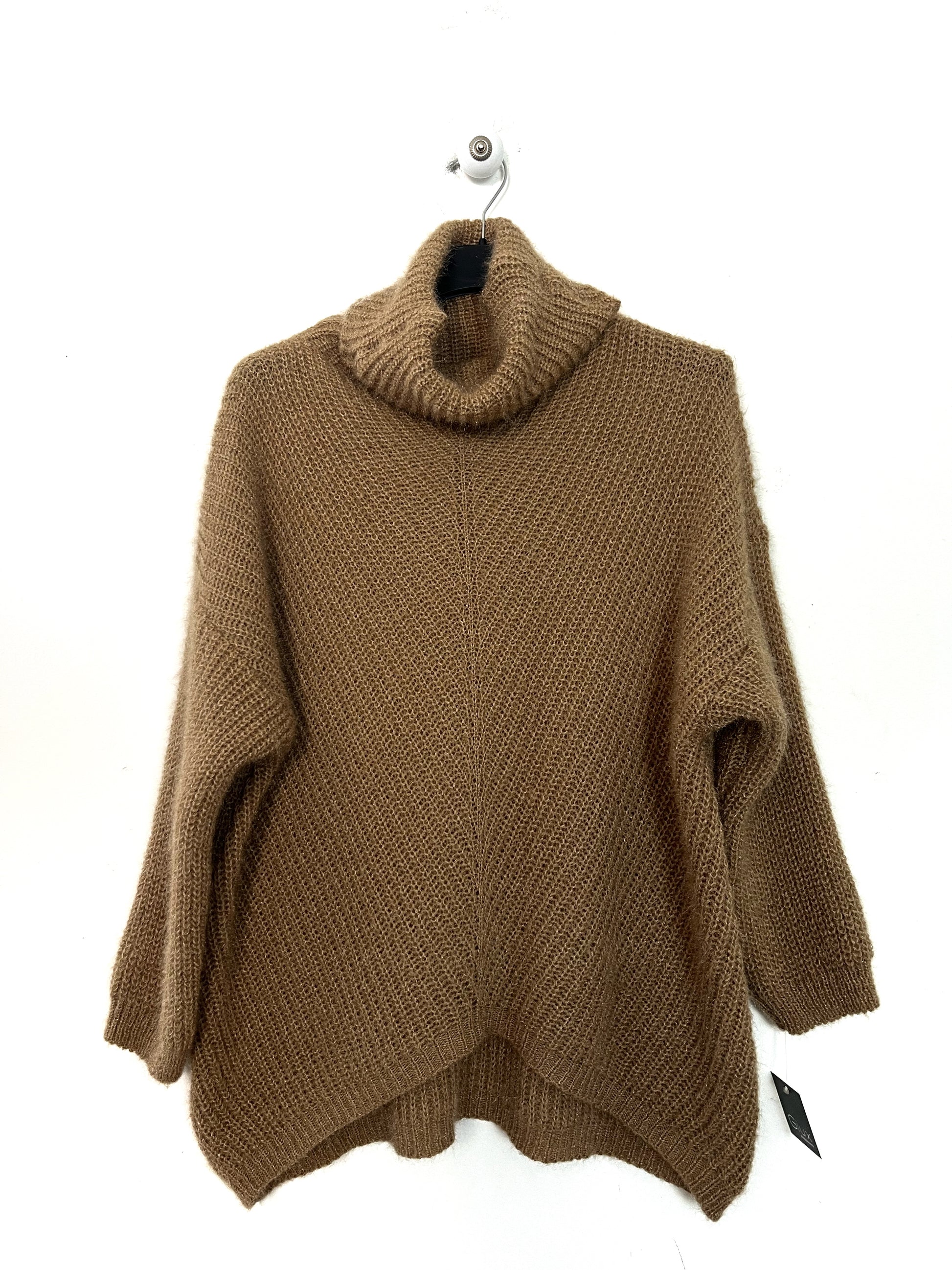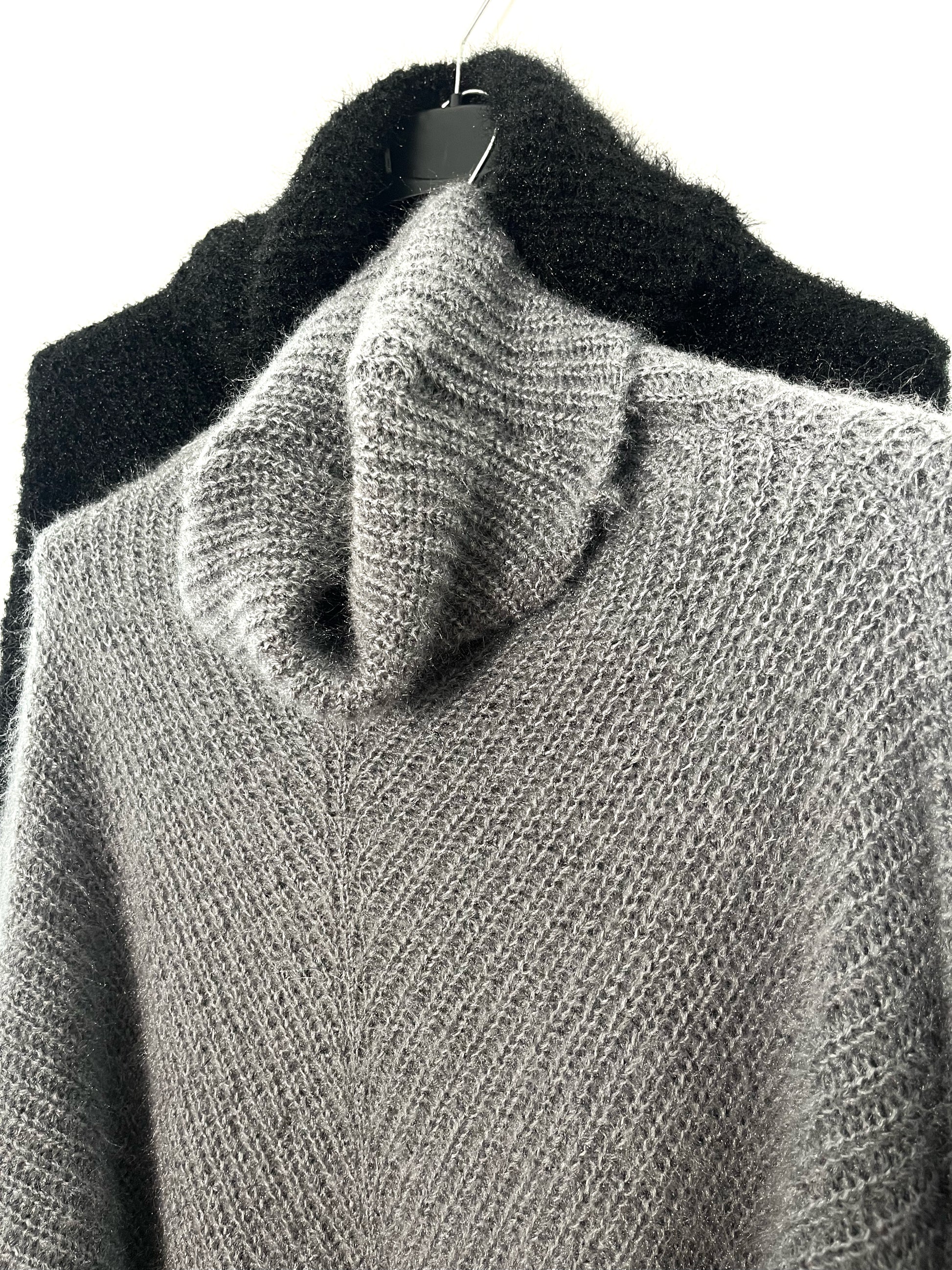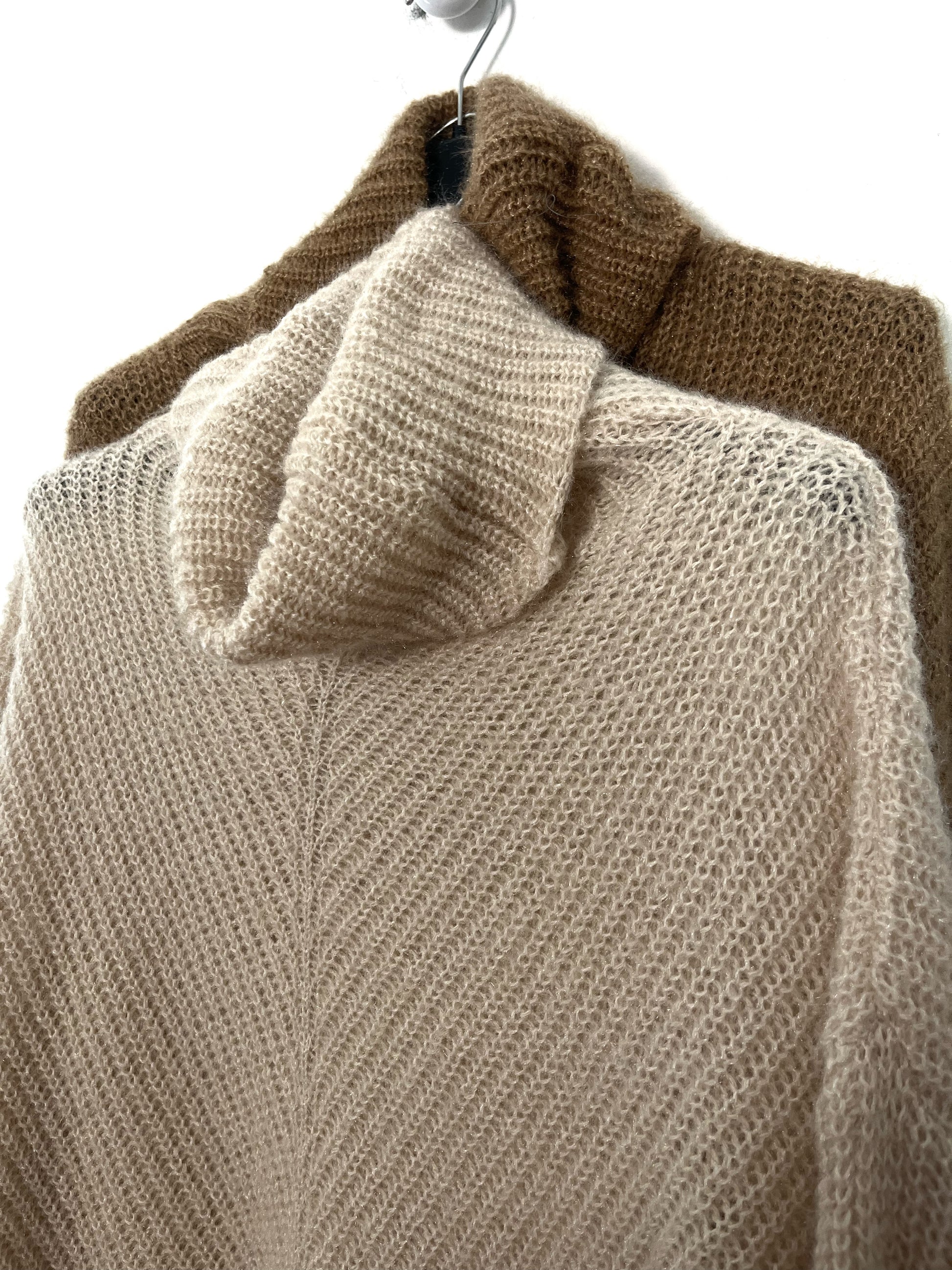 Maglioncino morbido, dolcevita. Spalla ribassata. Corto davanti, più lungo dietro.