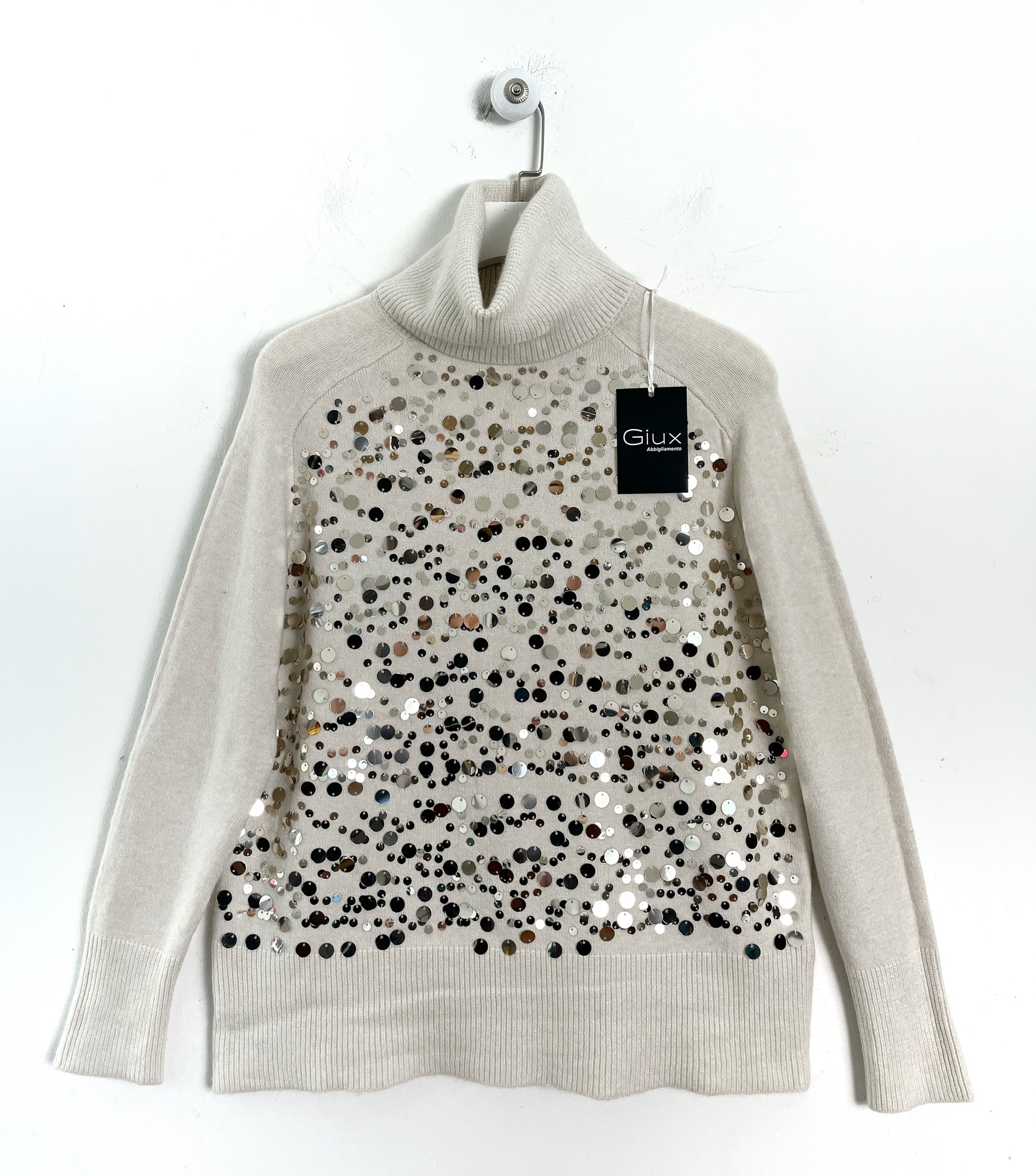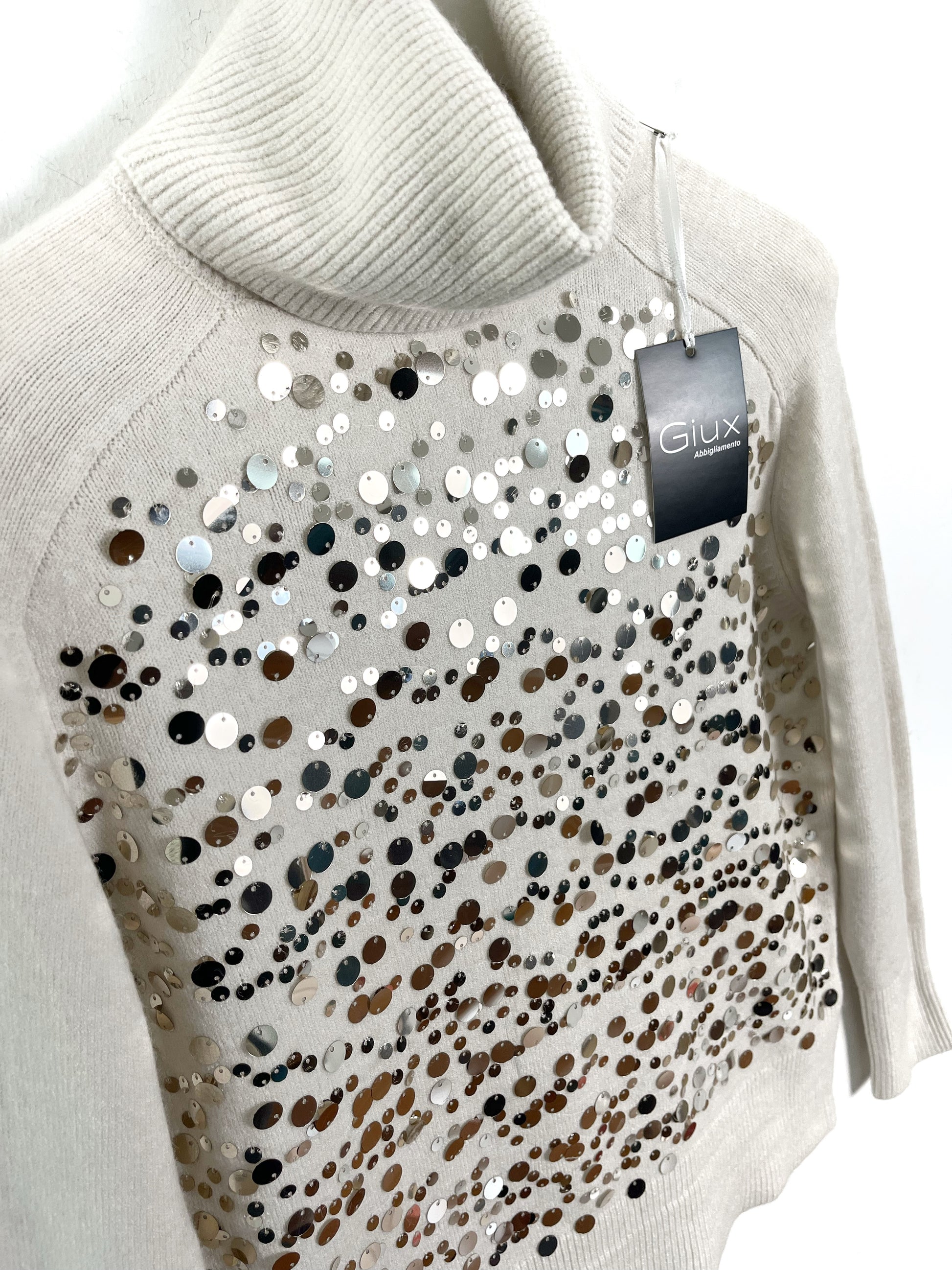 Dolcevita n calda viscosa girocollo. Manica lunga con polsino. Paillettes applicate sul davanti.