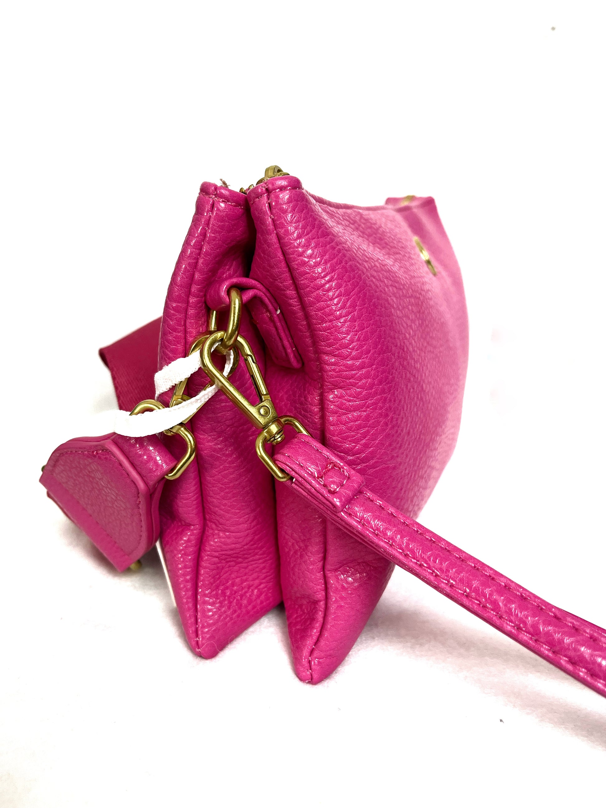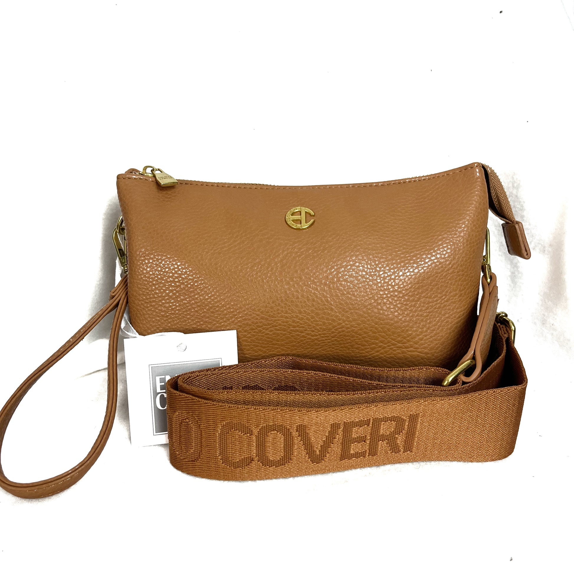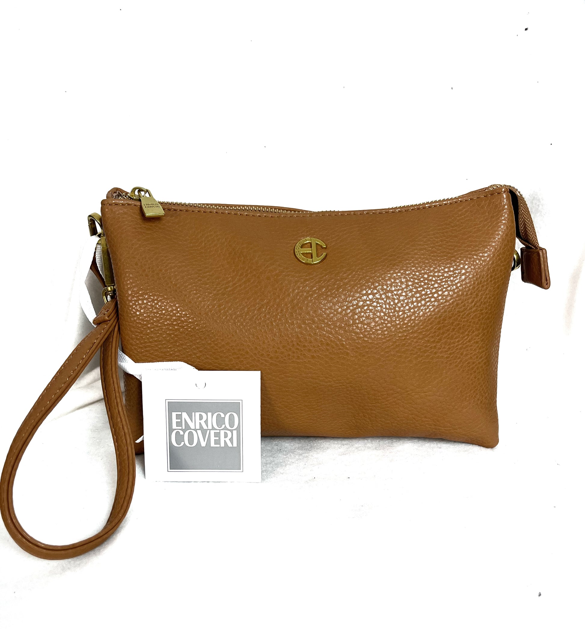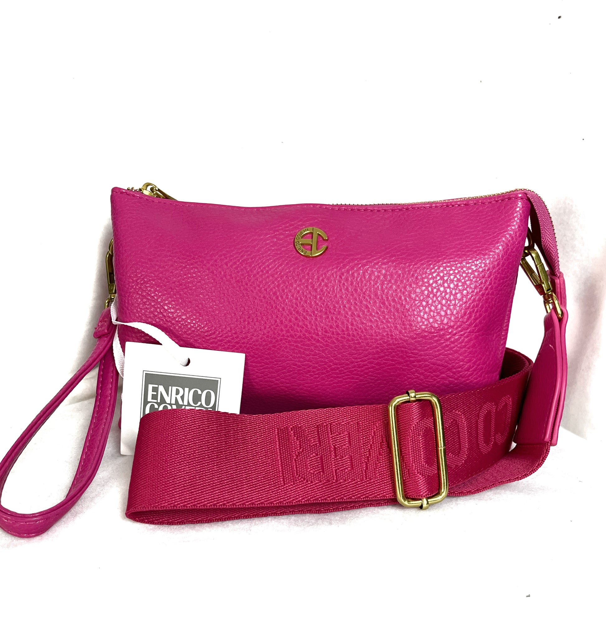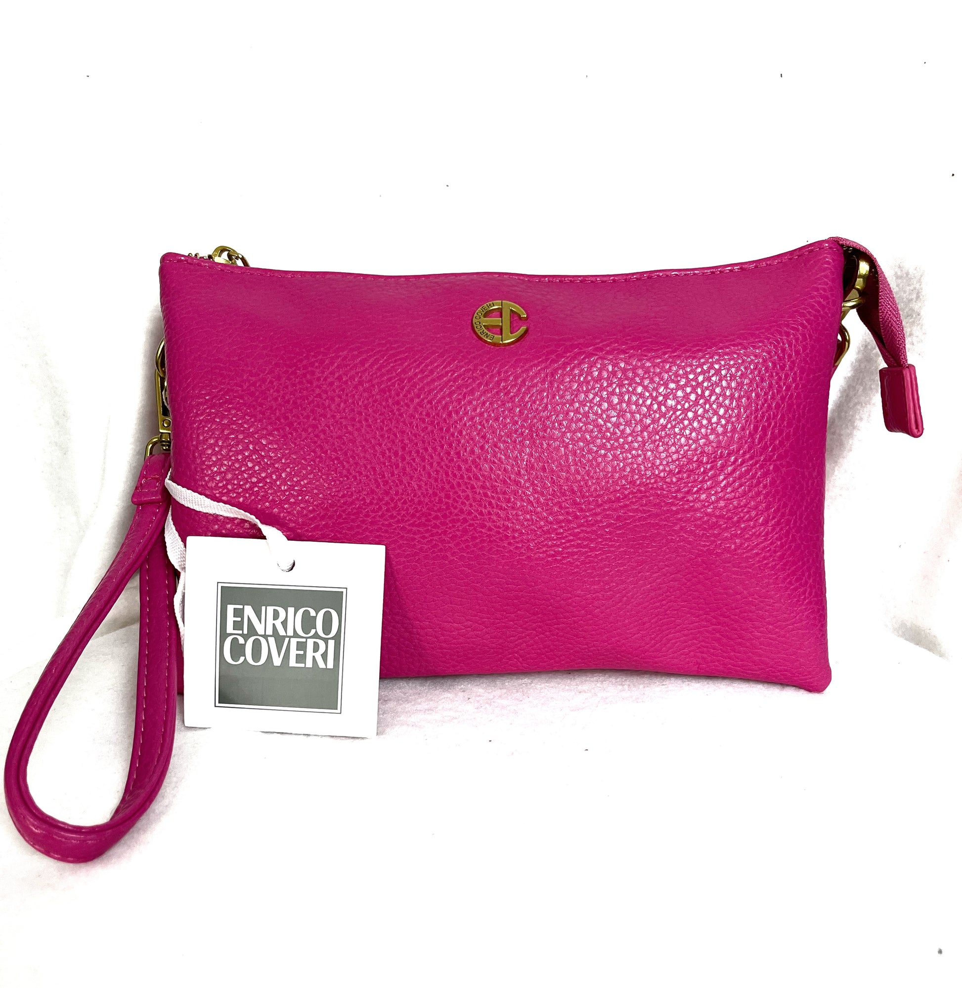 Doppia bustina in ecopelle con tracolla in tessuto. Effetto martellato. Apertura con cerniera. 2 scomparti. Maniglia in dotazione da portare a mano. Enrico Coveri