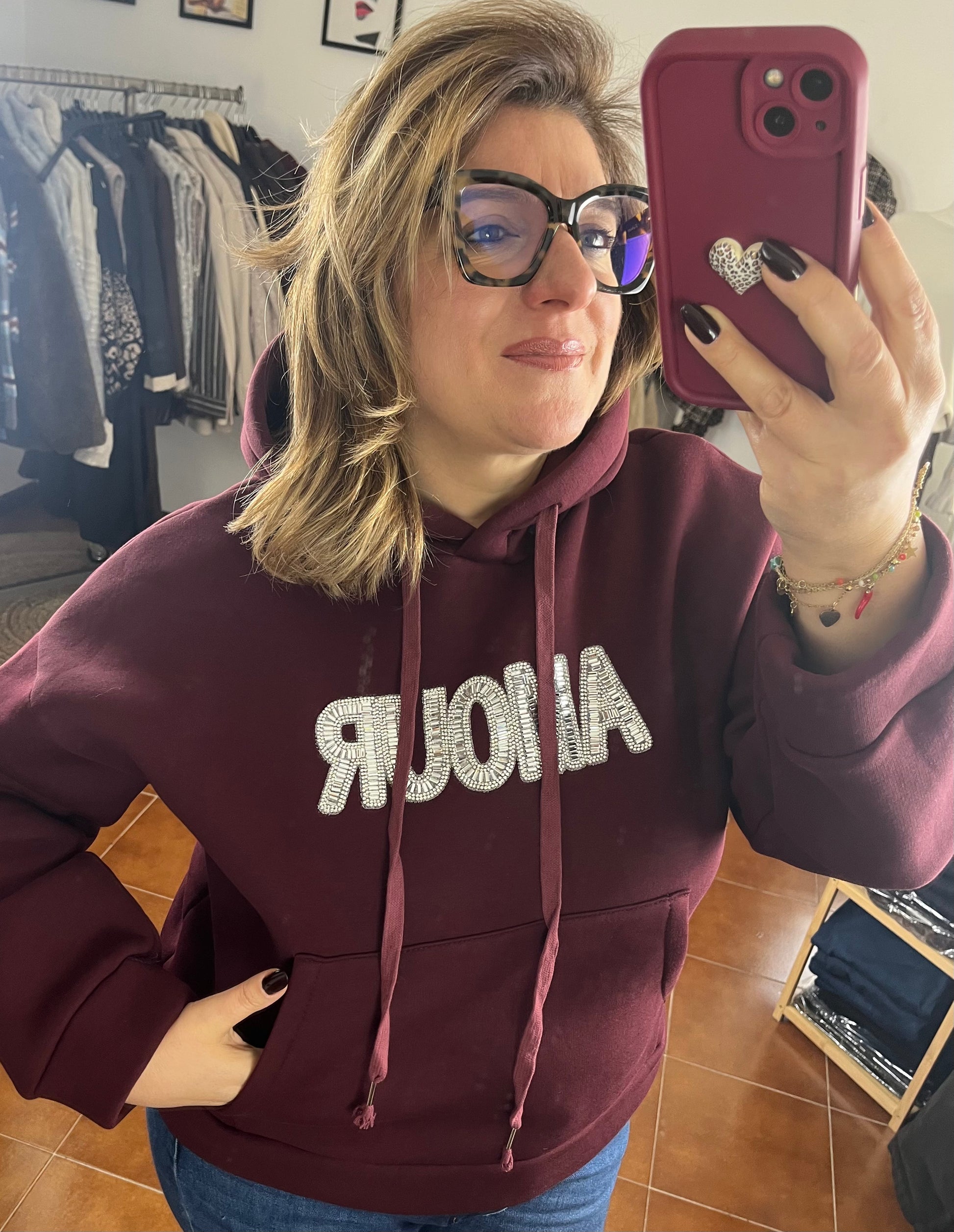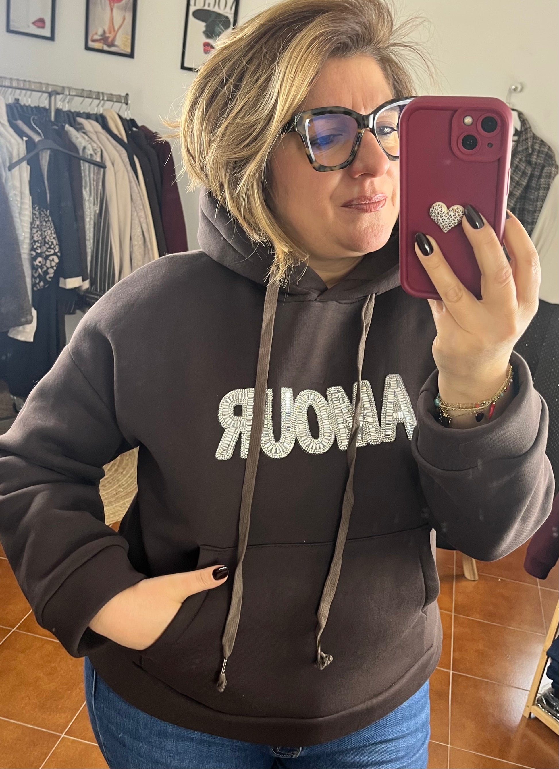 Felpa con cappuccio felpata. Spalla ribassata manica lunga, felpata. Tasca sul davanti. Con stampa