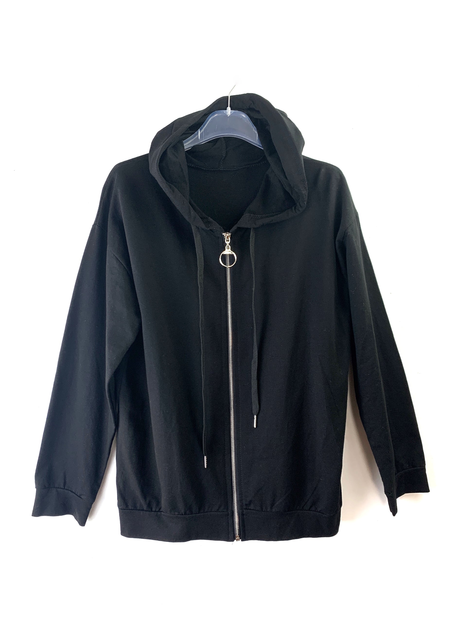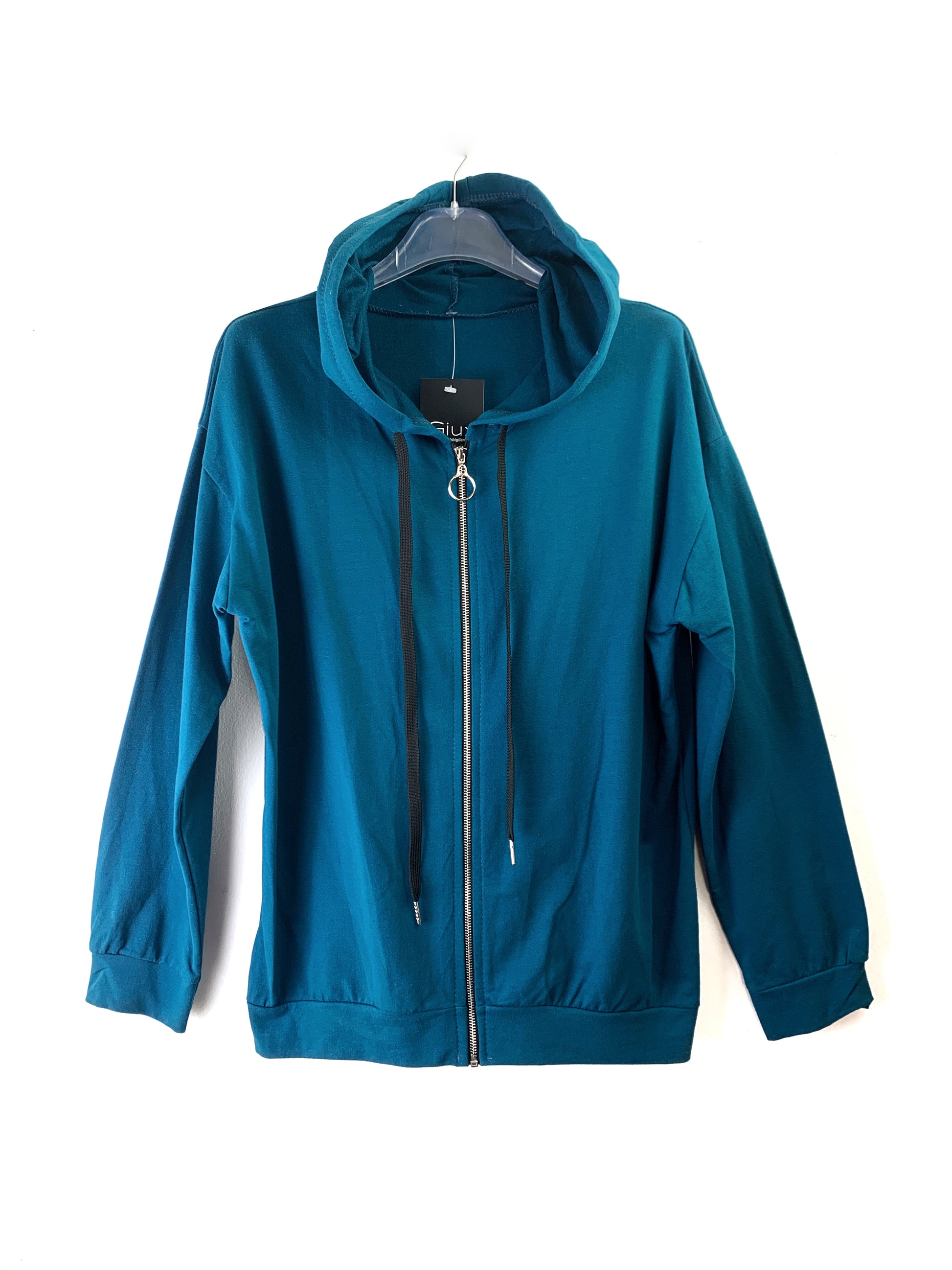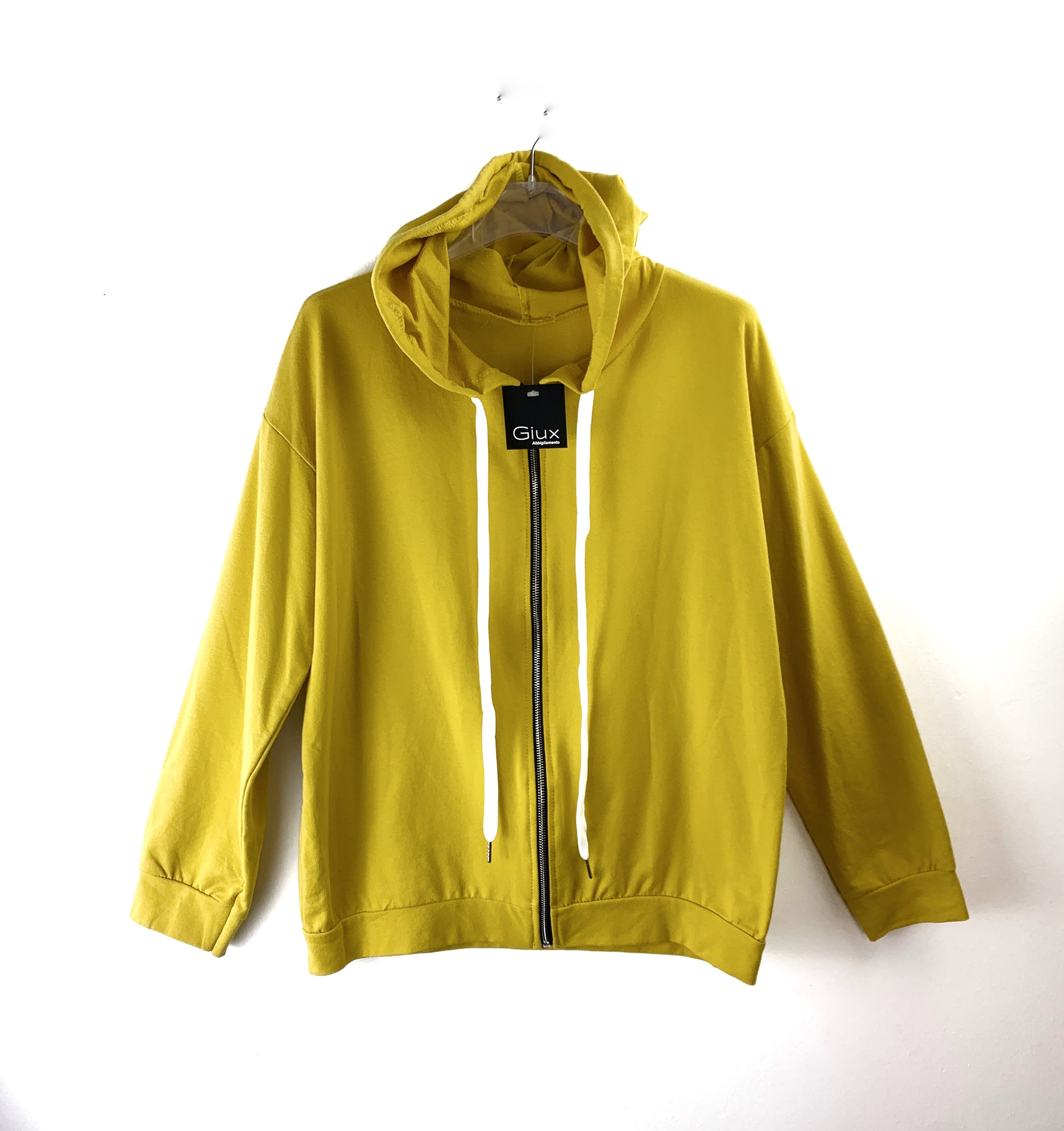 Felpa in morbido cotone garzato. Con cerniera. Cappuccio con coulisse. Spalle ribassate.