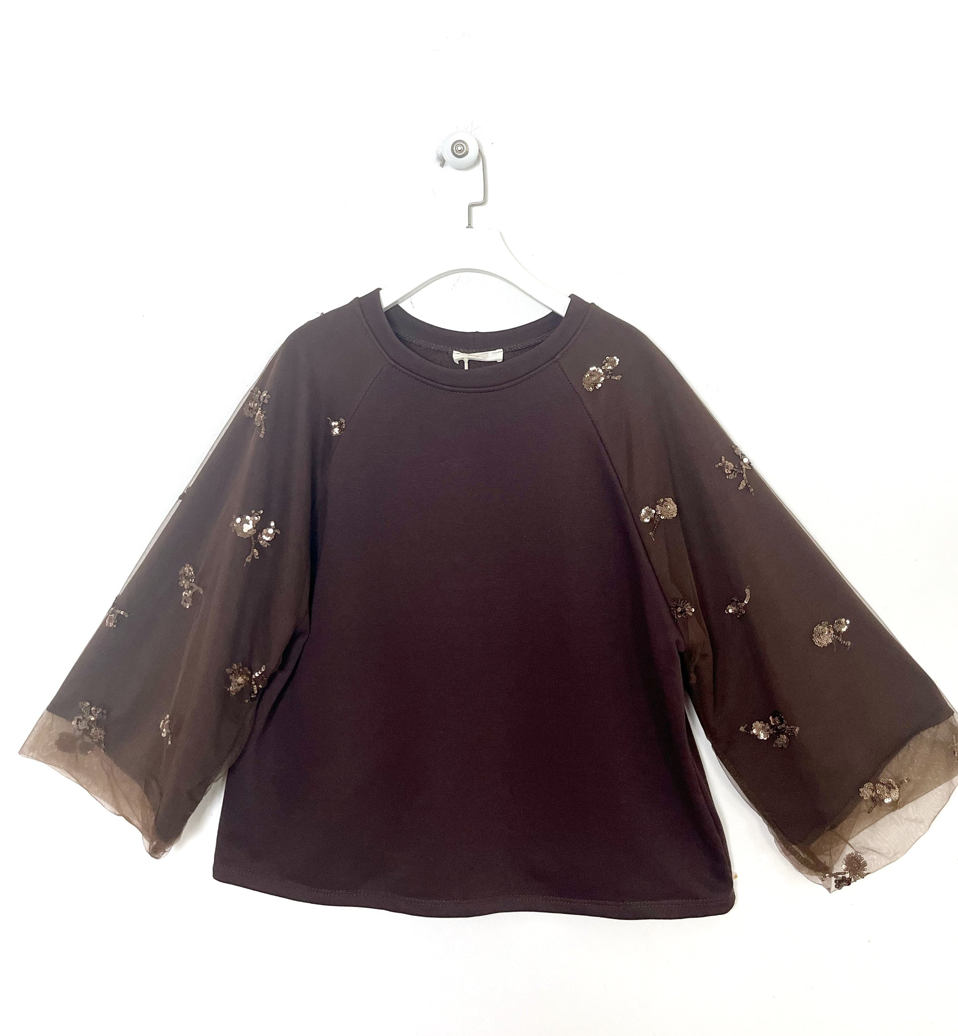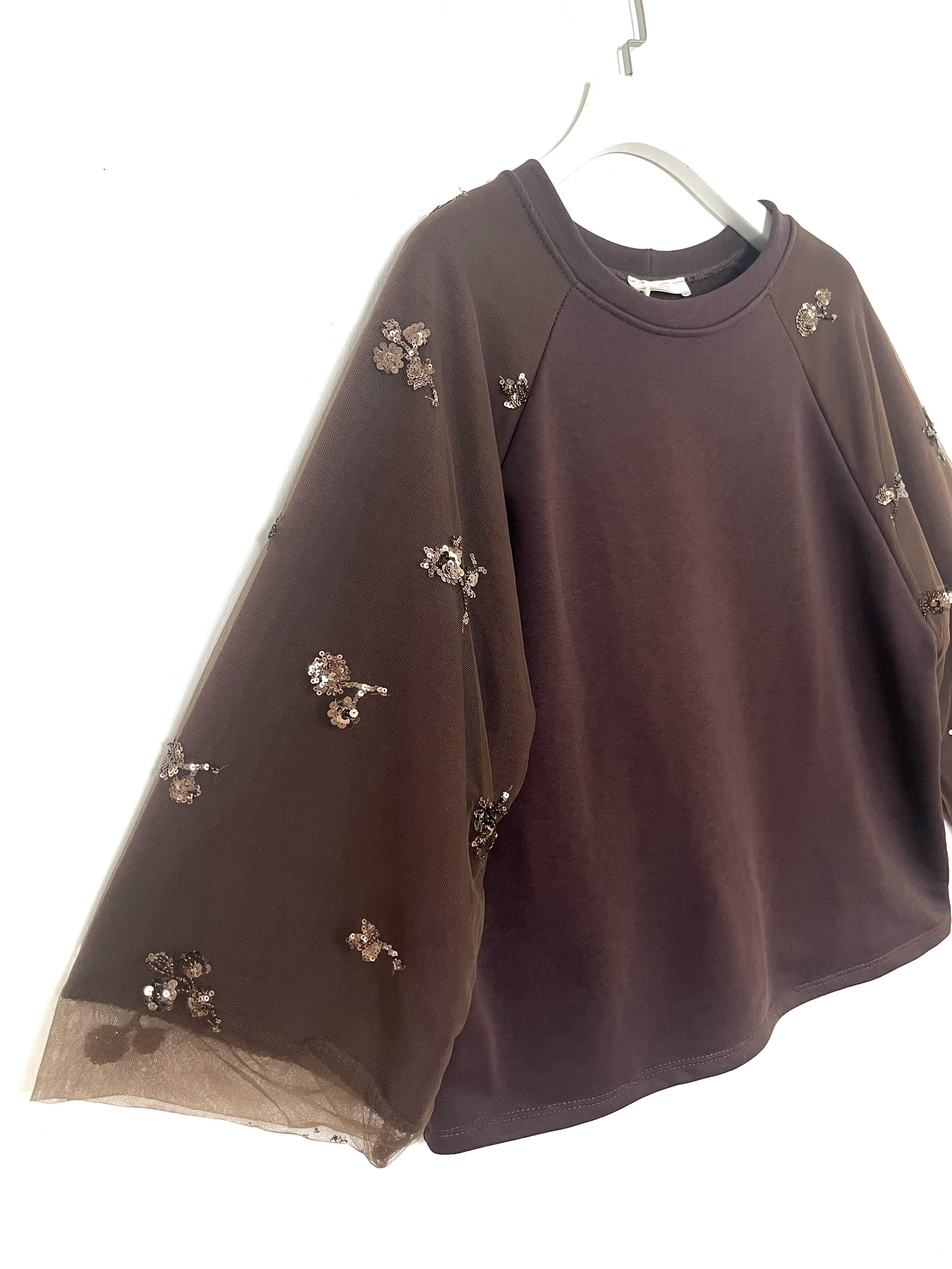 Felpa girocollo in cotone garzato. Spalla ribassata, manica ampia e lunga in tulle ricamato.