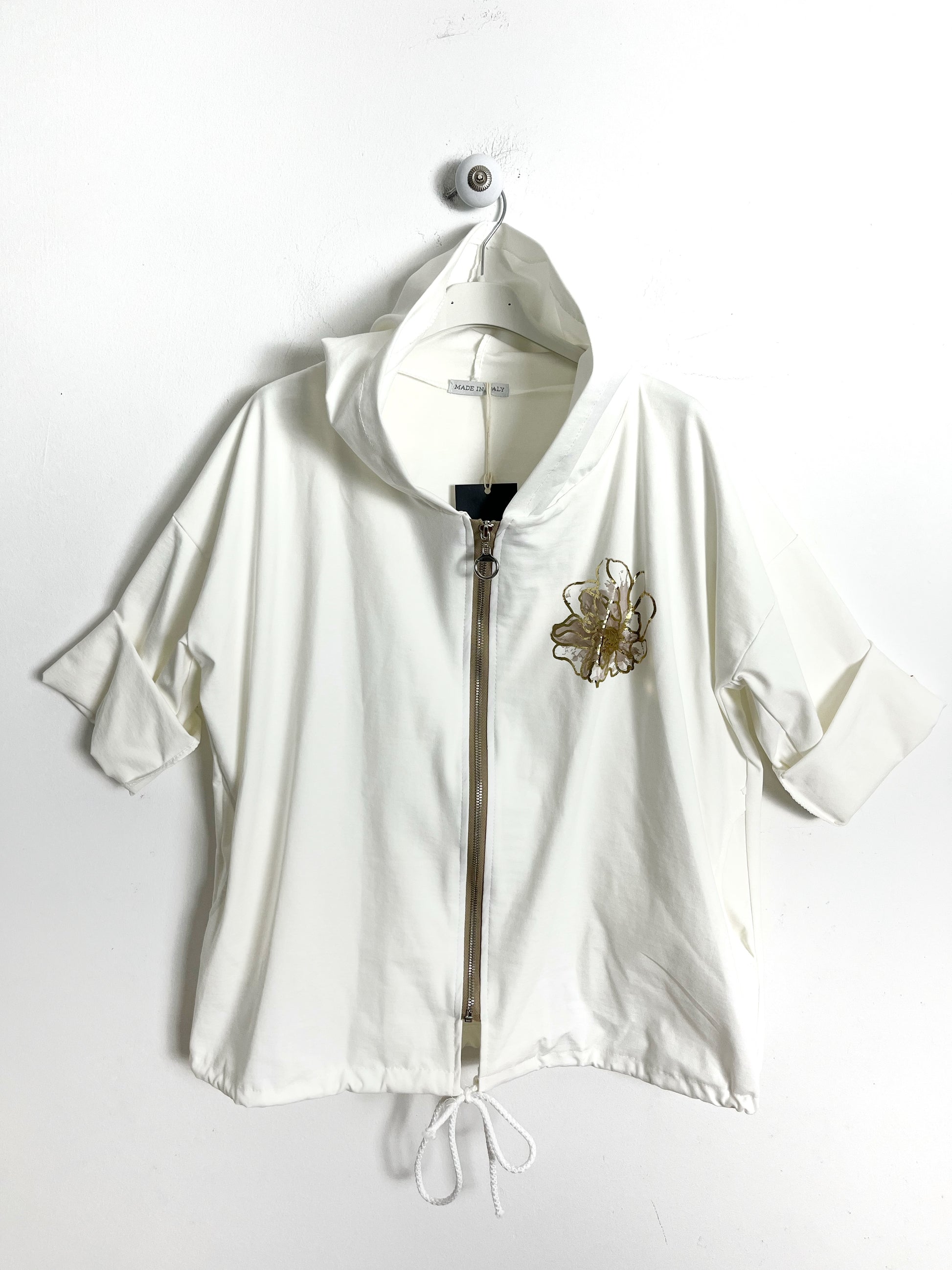 Felpa in morbido cotone elasticizzato con cerniera in contrasto e cappuccio. Spalle ribassate. Piccola stampa con dettagli in lurex dorato. Manica tre quarti. Due tasche latrali, coulisse sul fondo.