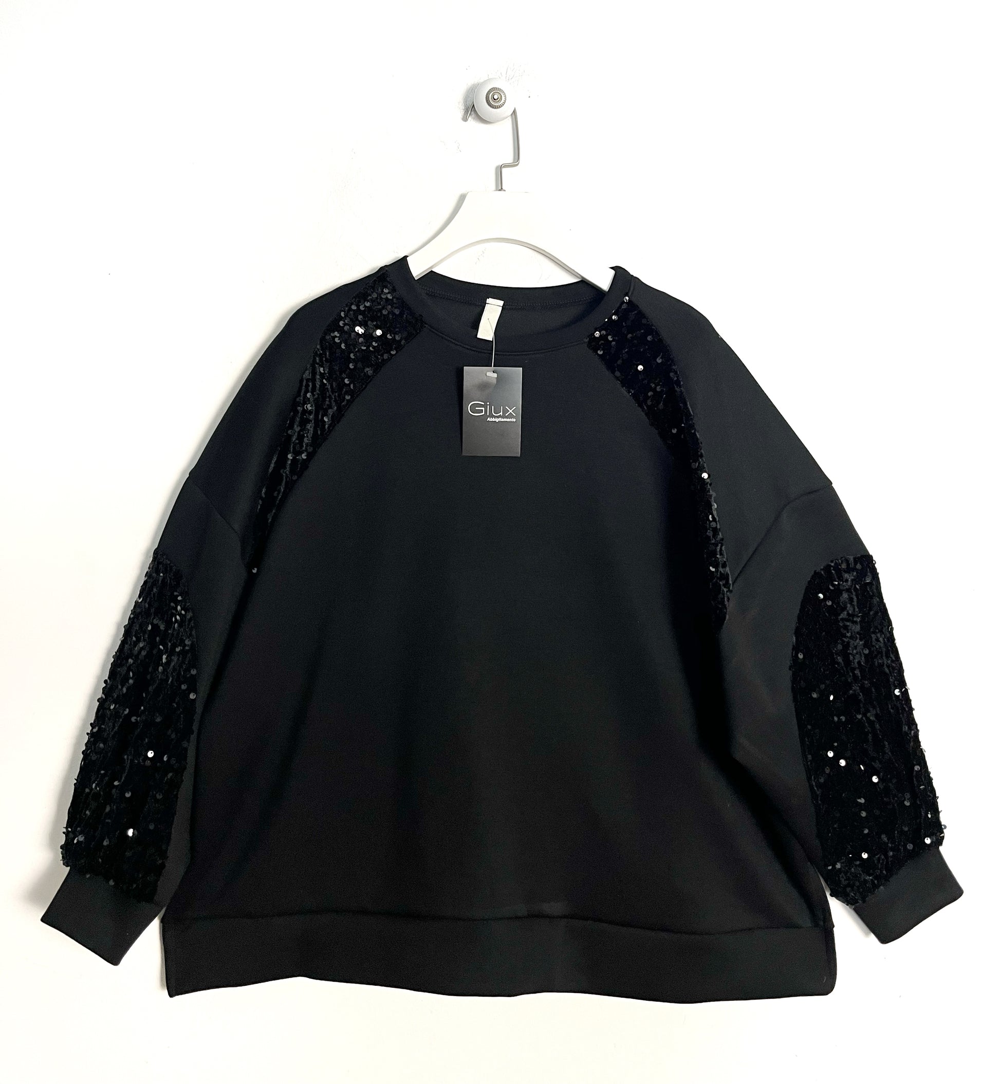 Felpa girocollo in leggero neoprene. Spalla ribassata manica lunga. Inserti di ciniglia con paillettes. Spacchetti laterali