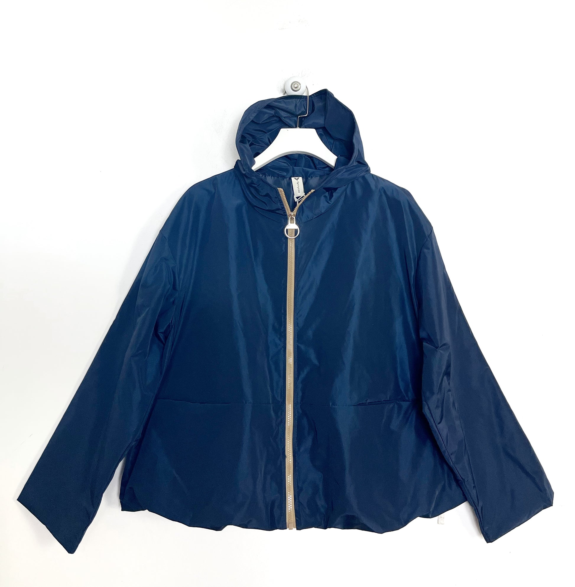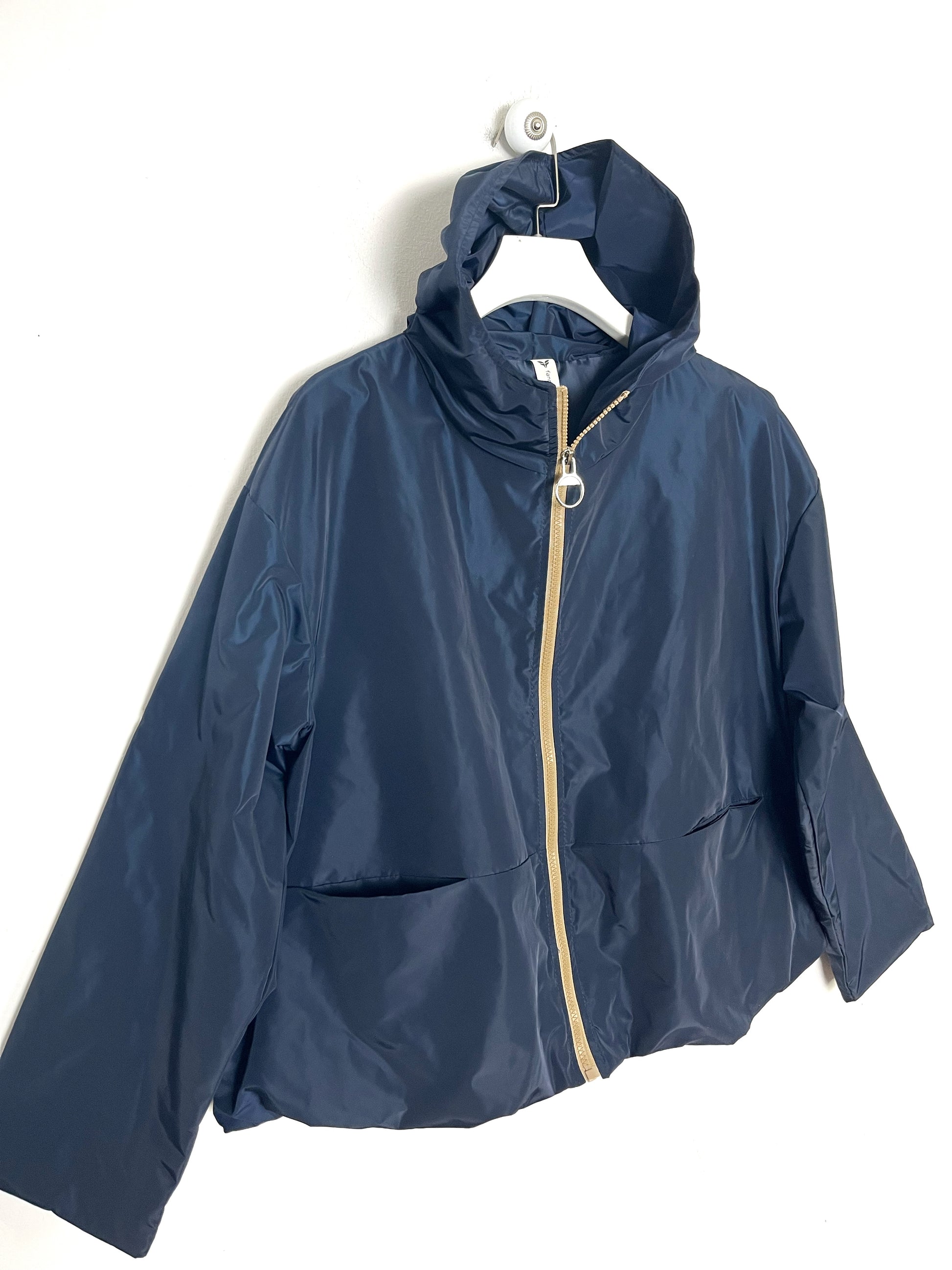 Giacca con cappuccio antivento. Manica lunga, cerniera in contrasto. Tasche sul davanti a scomparsa.