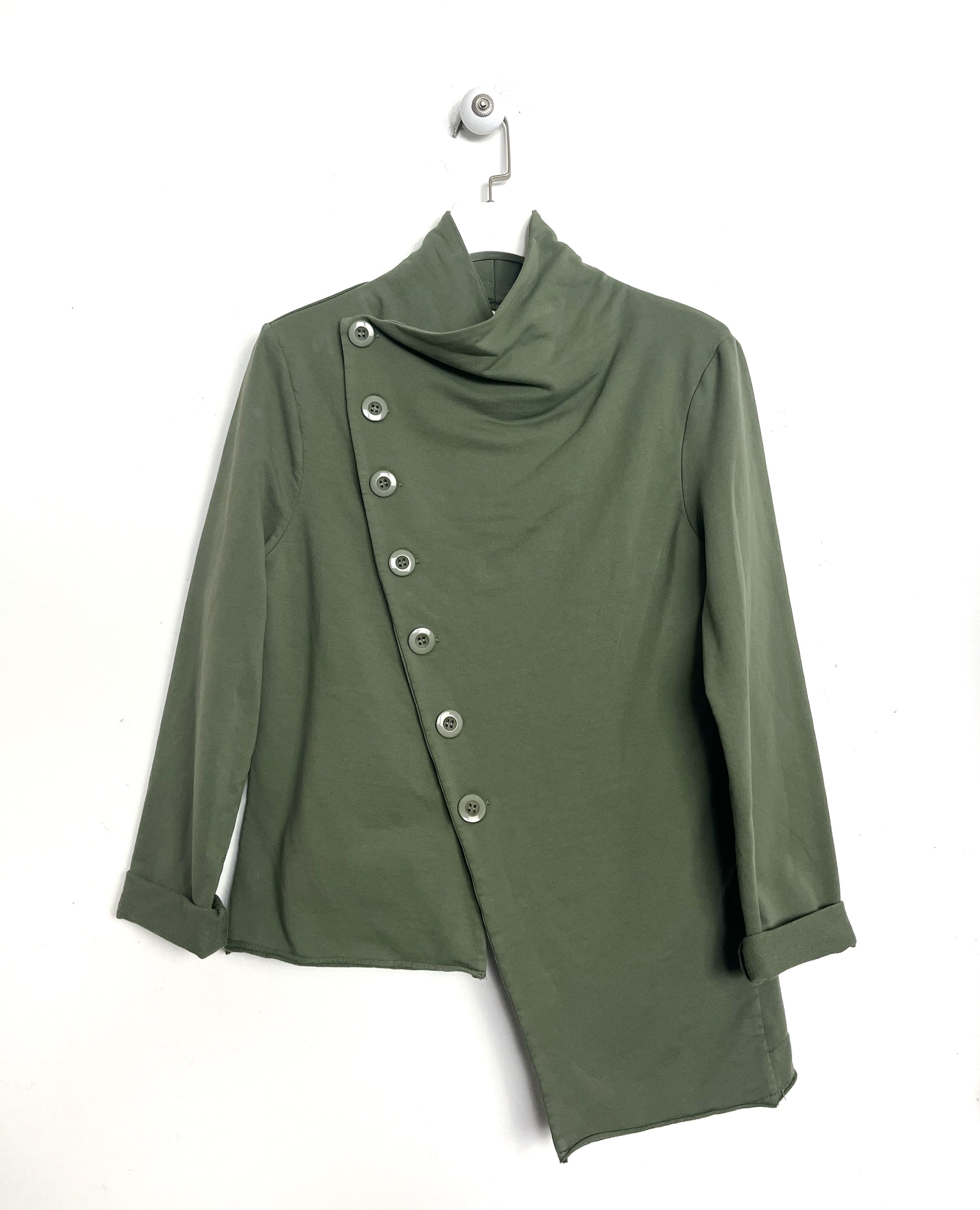 Giacca in cotone dal taglio asimmetrico. Bottoni frontali dí sbieco, manica lunga. Più lunga sul davanti.