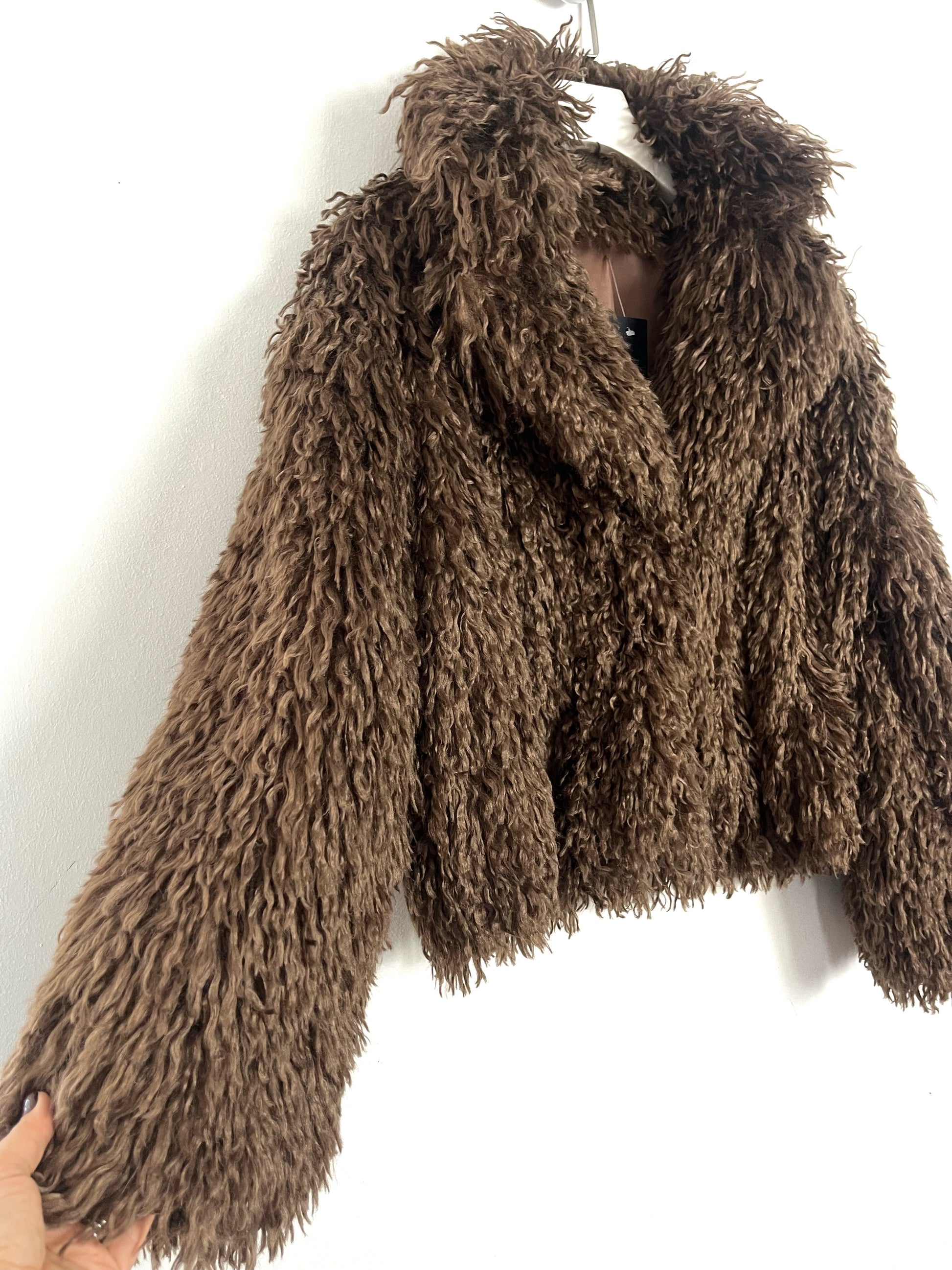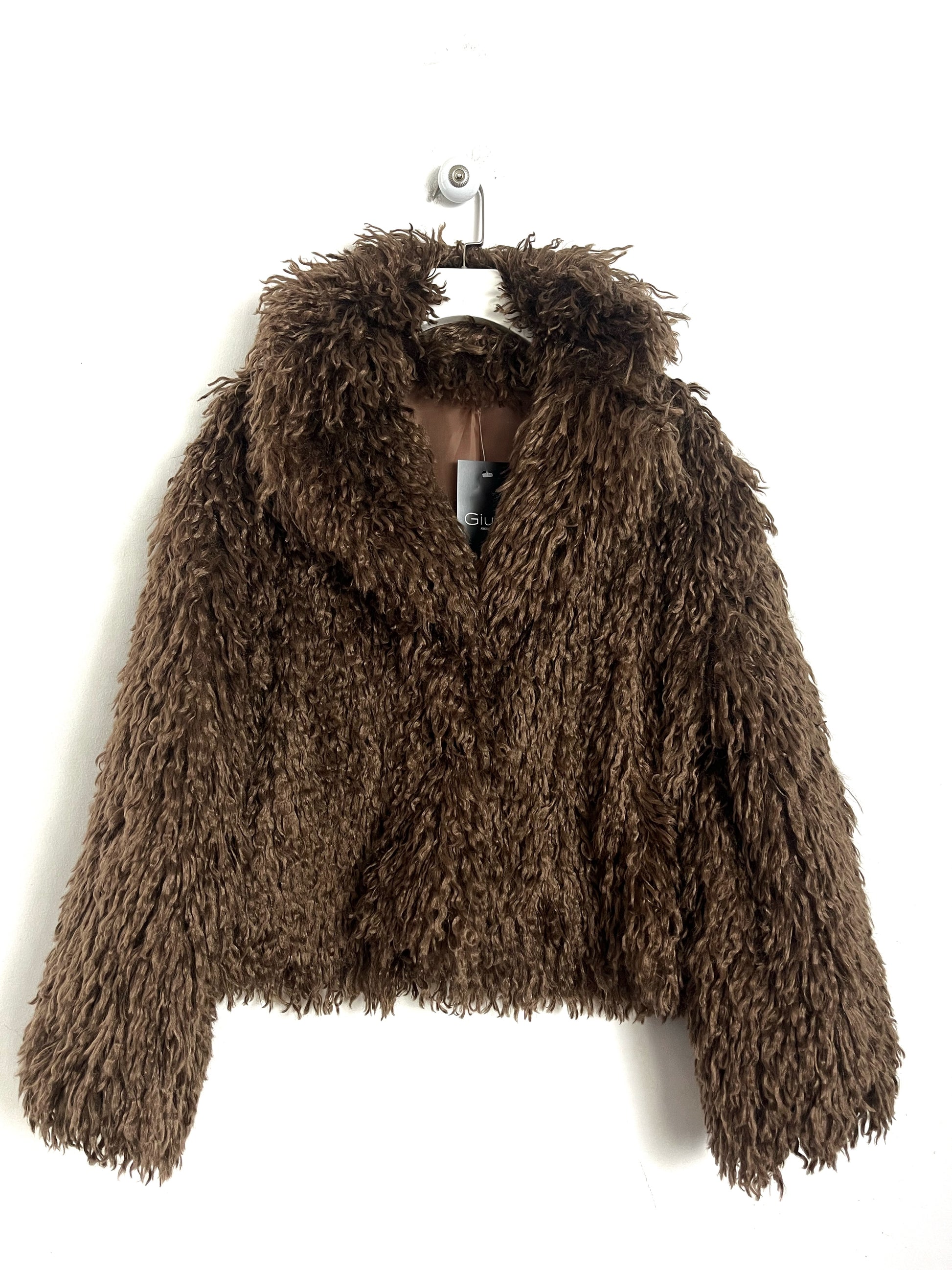 Giacca corta in eco mongolia tortora. Tasche laterali nascoste. Foderata. Chiusura Con bottone automatico