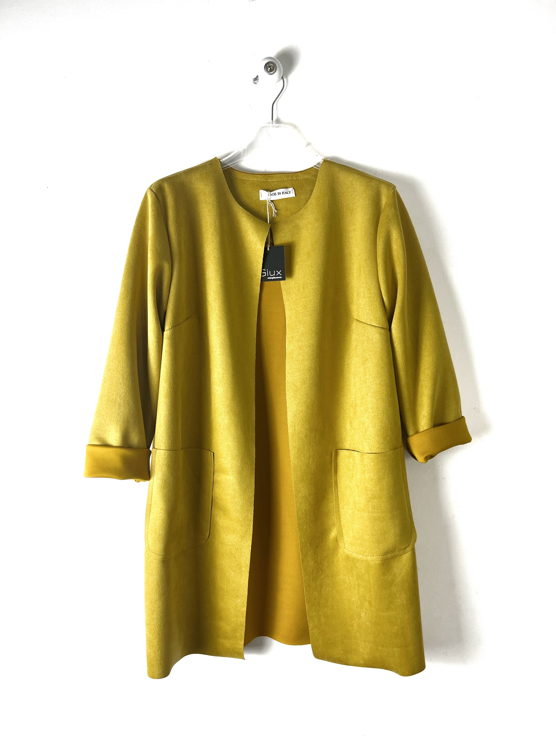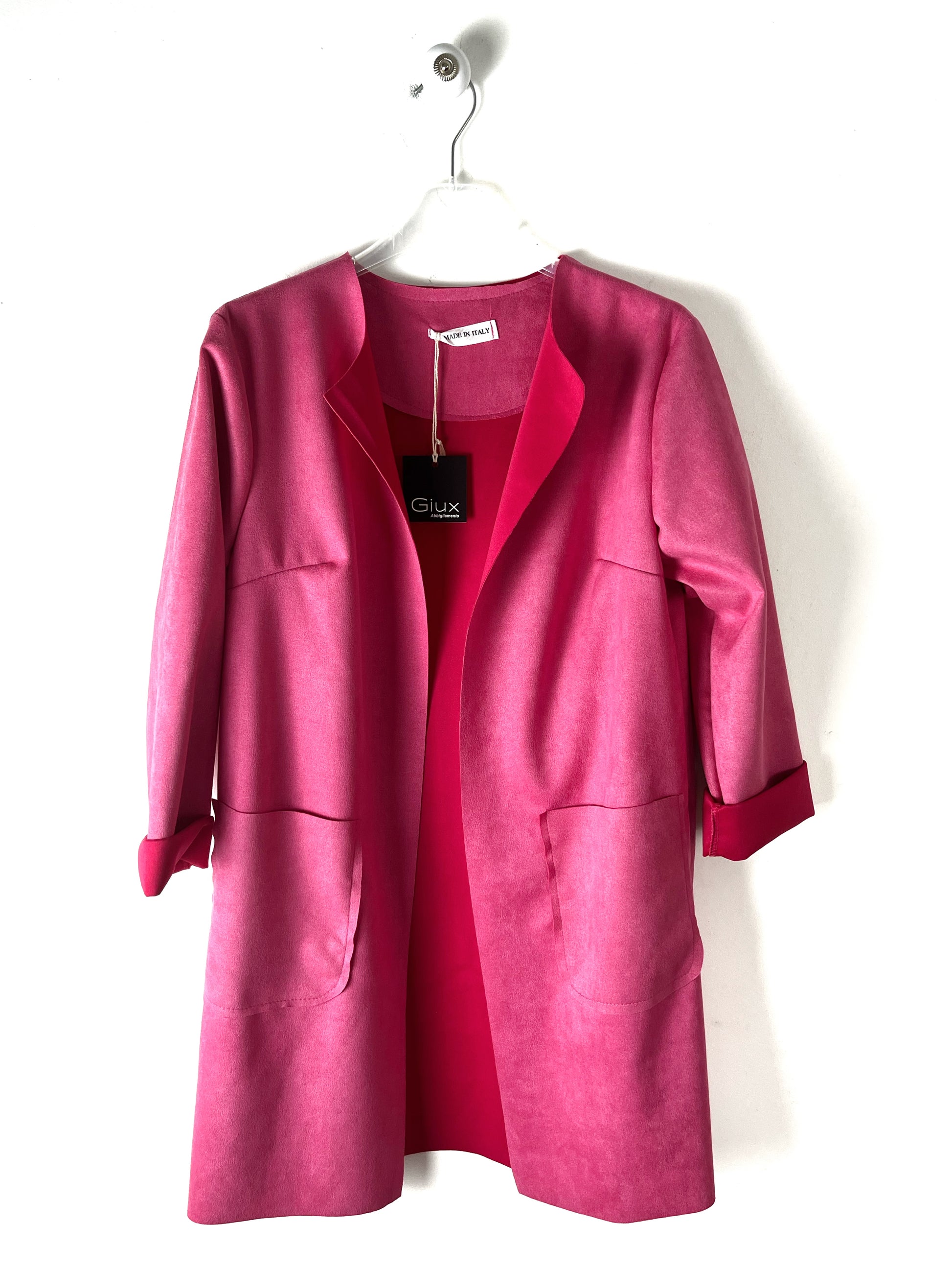 Giacca lunga girocollo scamosciata, tasche applicate davanti. Manica lunga, sfoderato.