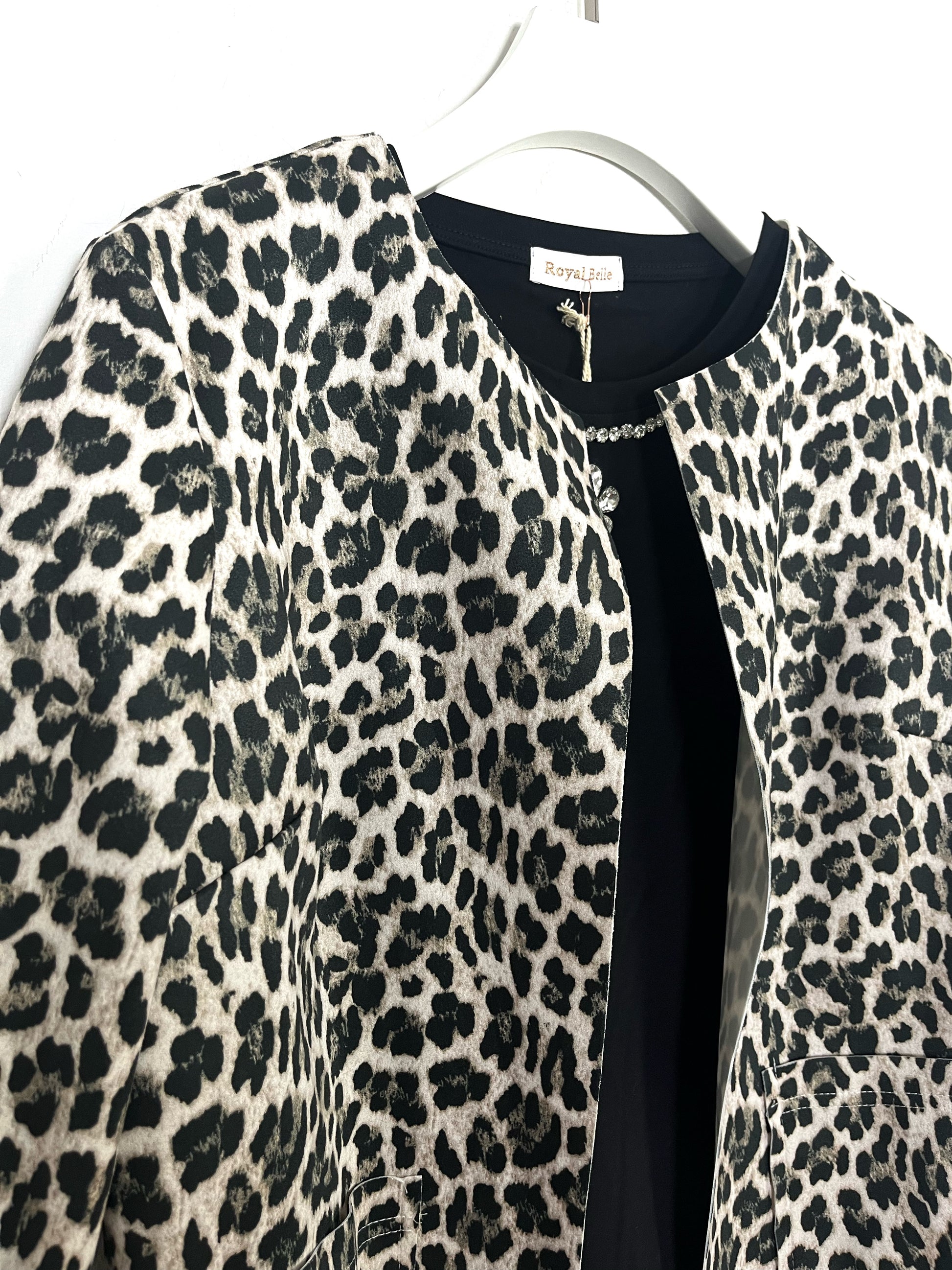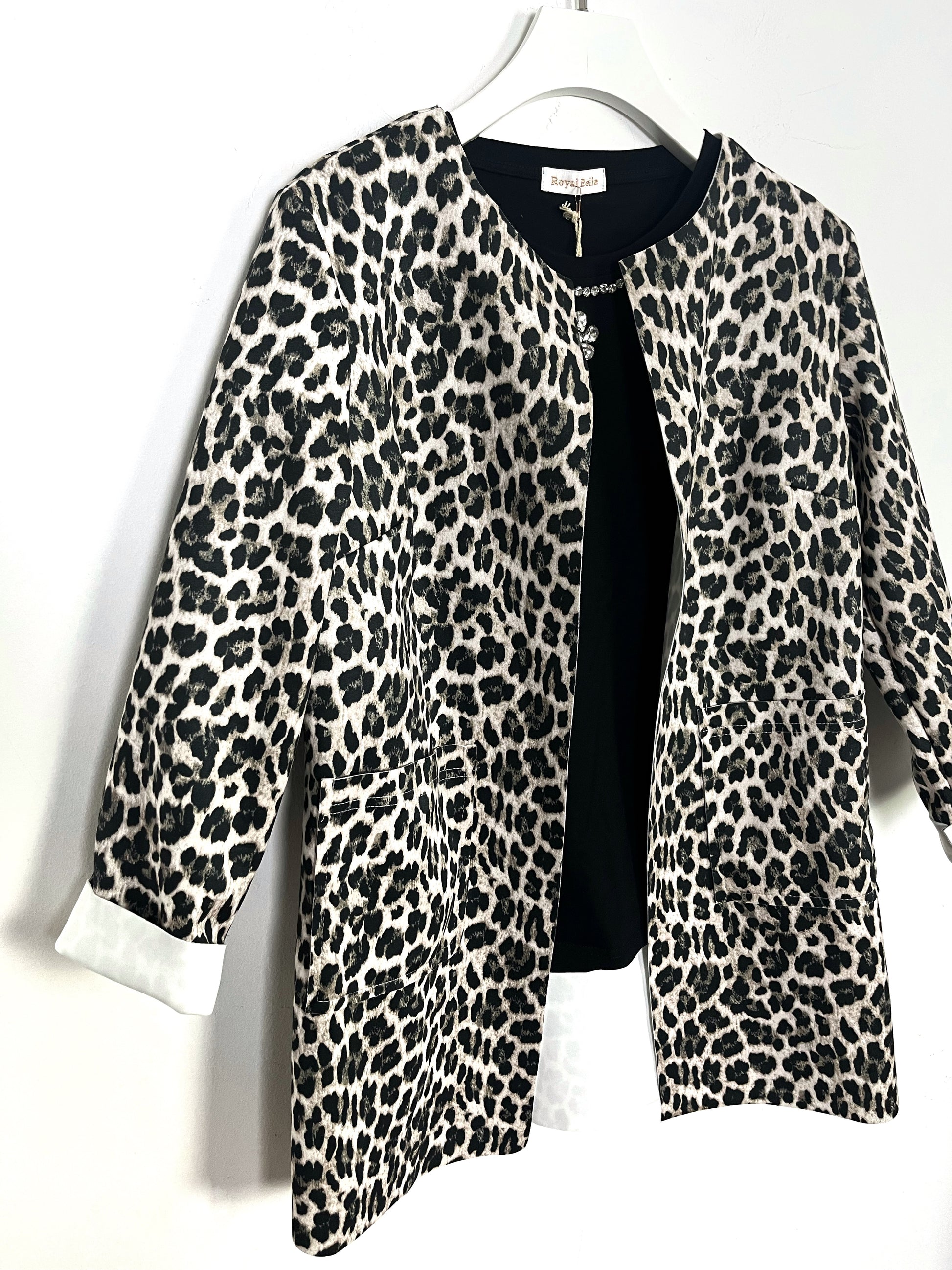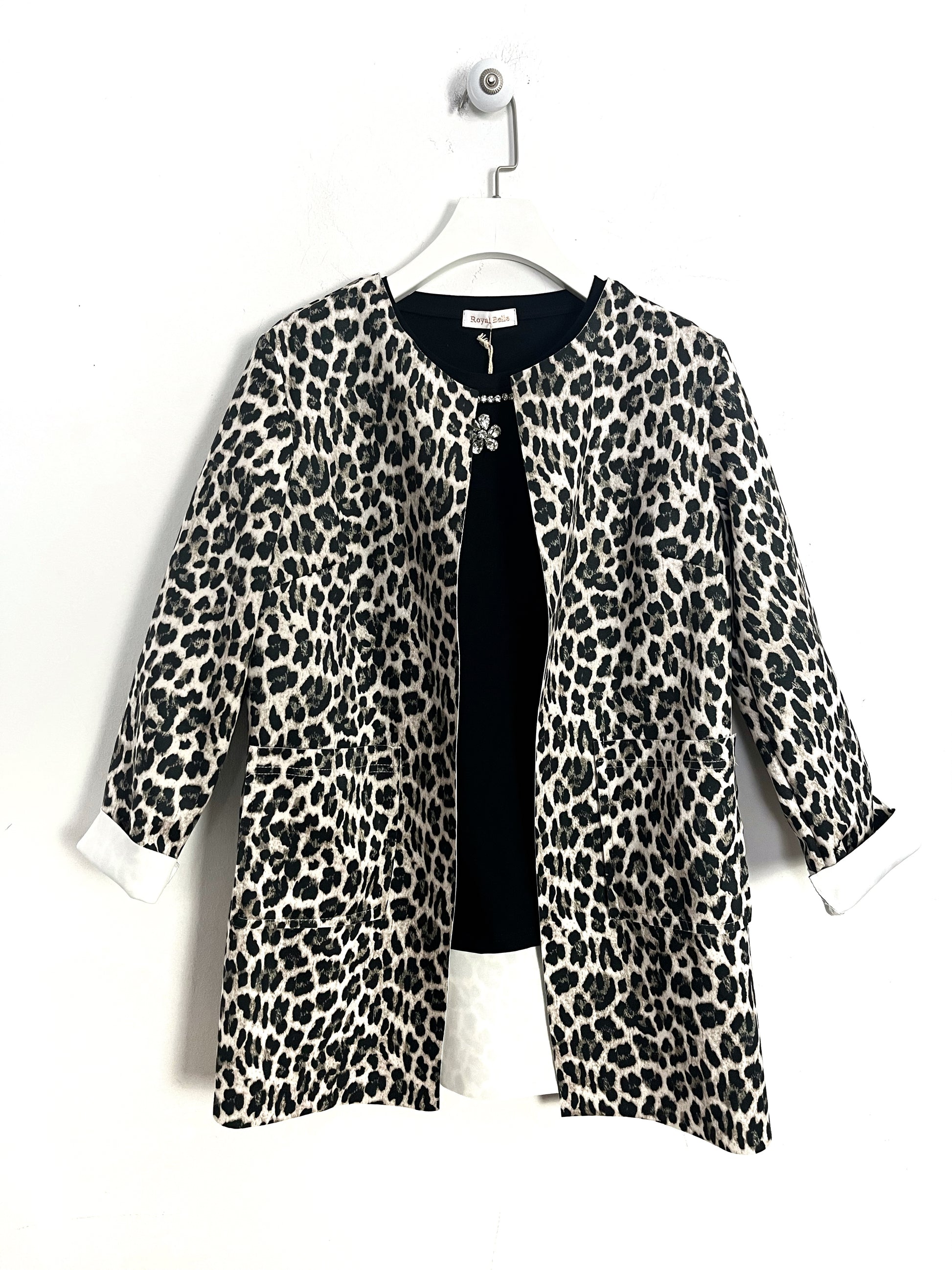 Giacca lunga girocollo scamosciata, tasche applicate davanti. Manica lunga, sfoderato.