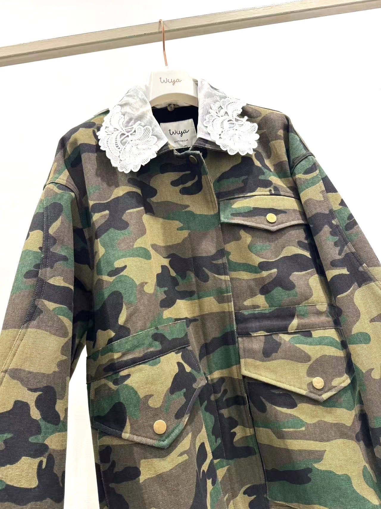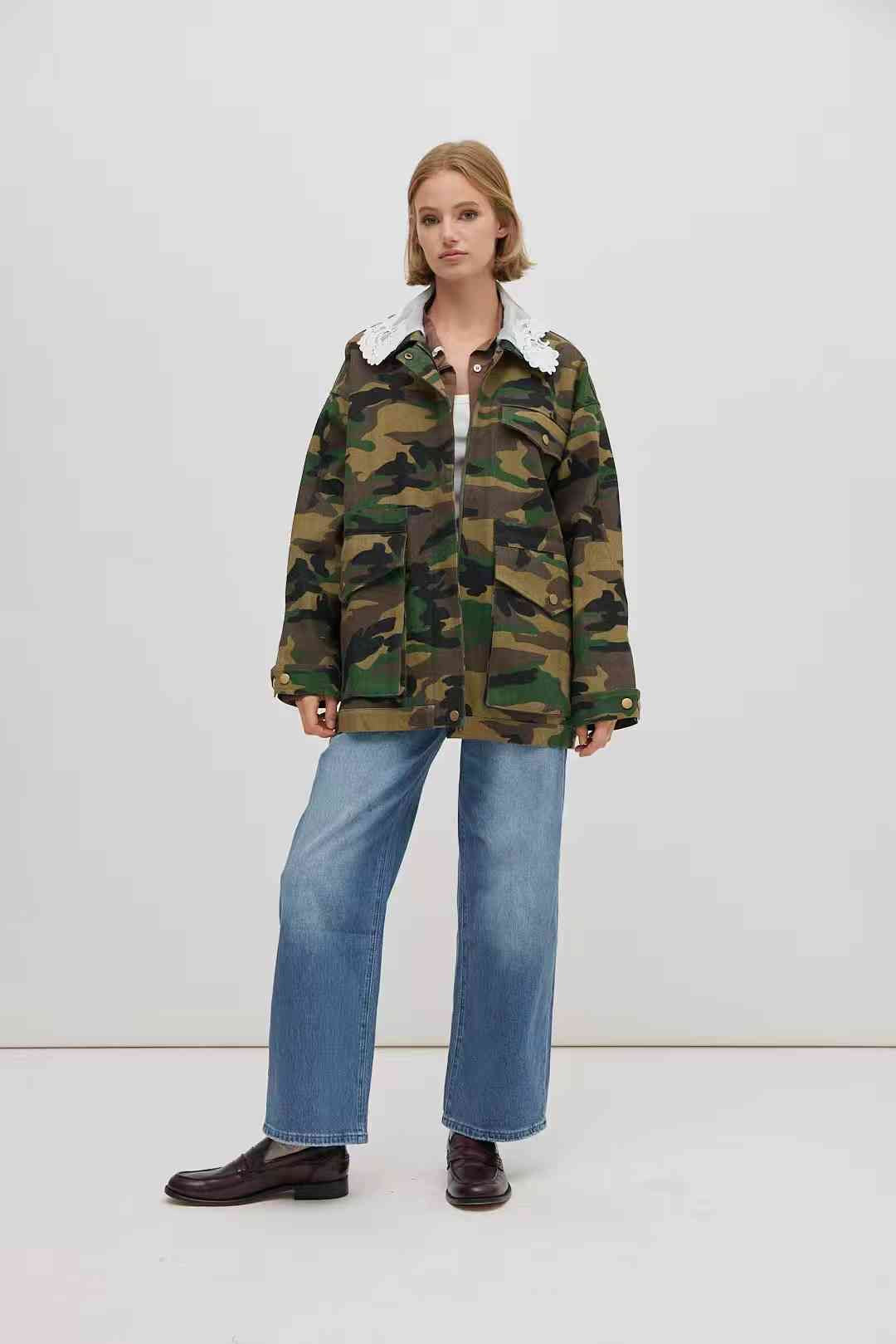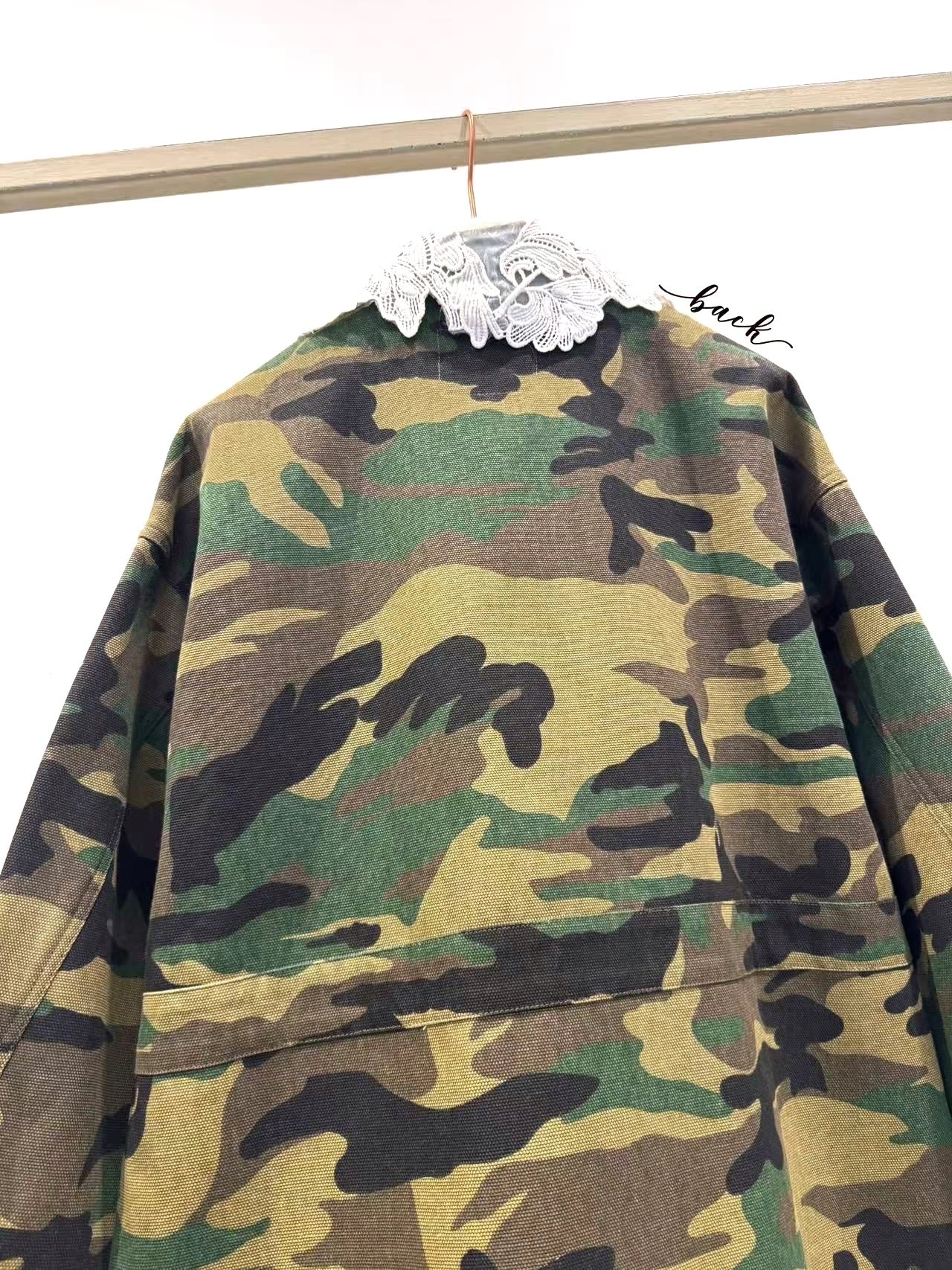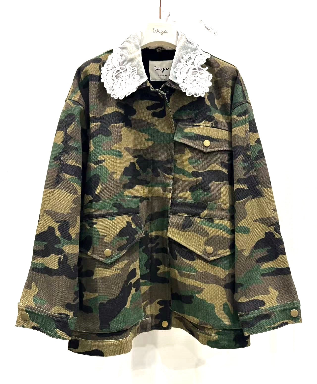 Giacca in tessuto consistente, fantasia camouflage, vestibilità over. Chiusura con zip, tasconi sul davanti con patta. Colletto in pizzo e cotone.