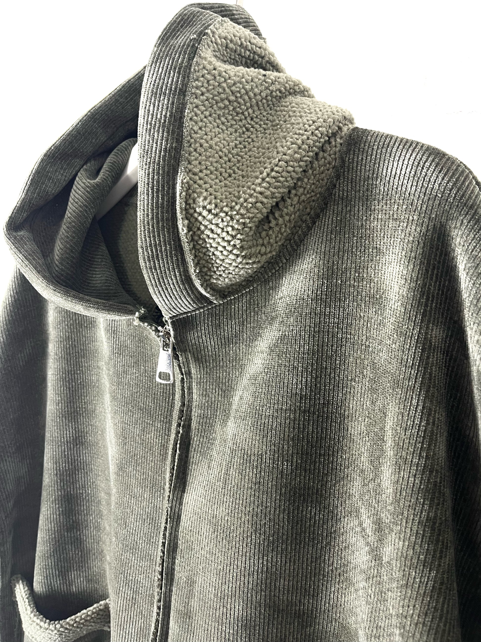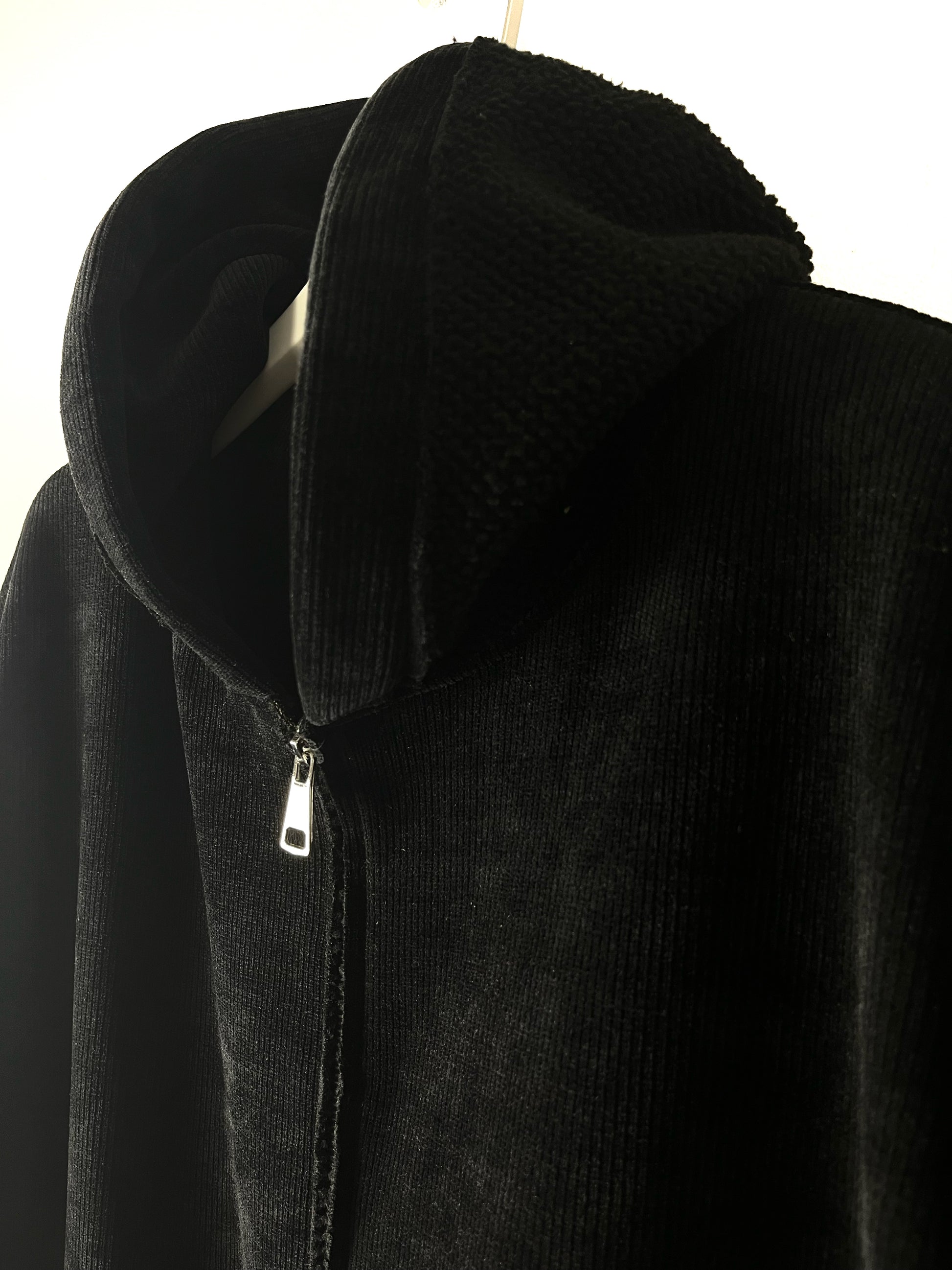 Giacca strutturata in velluto cinigliato con cappuccio e cerniera. Due tasche applicate sul davanti, manica lunga, spalla ribassata. Più lunga dietro.
