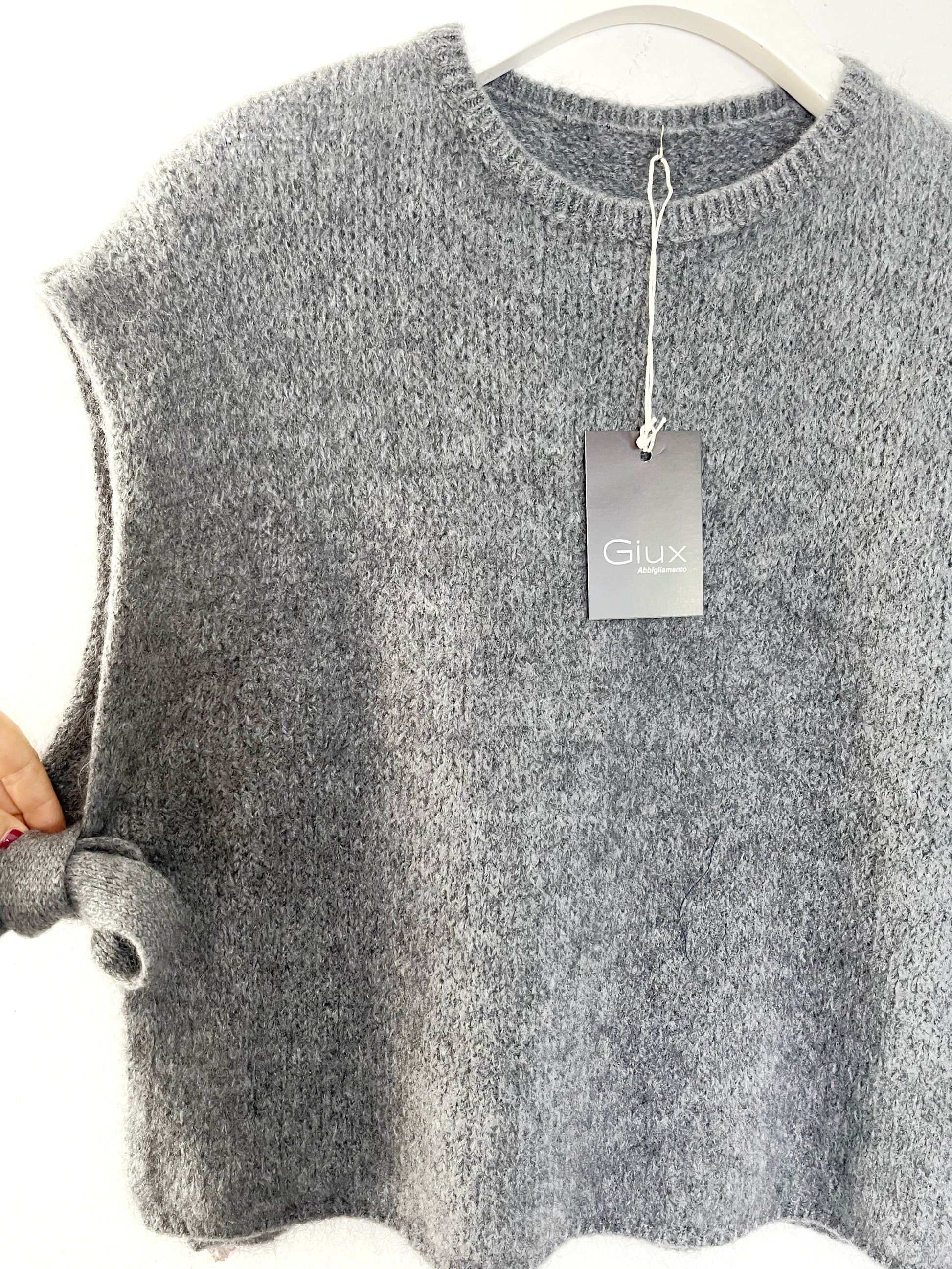 Gilet smanicato in morbidissima misto lama, chiudo lateralmente da nastri. Cropped