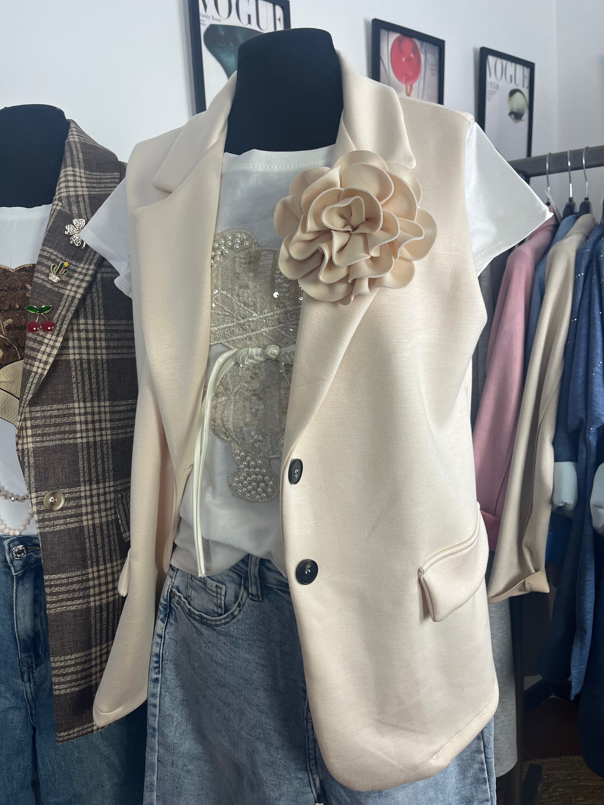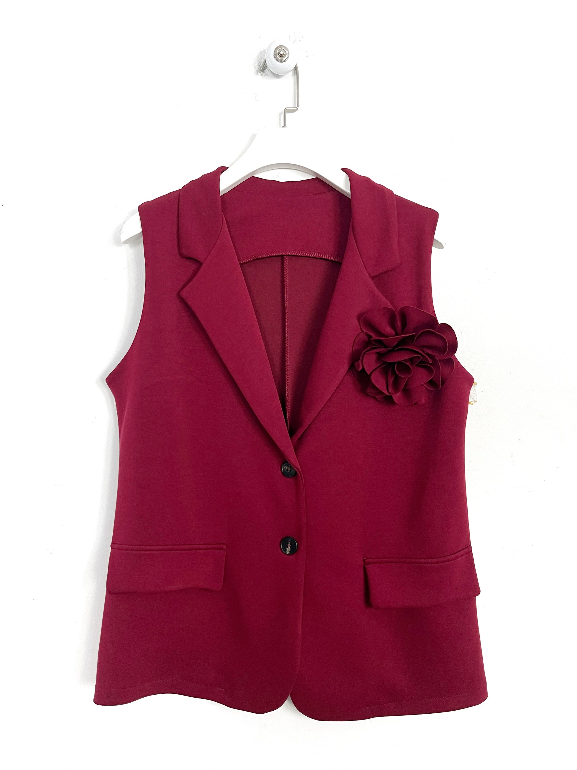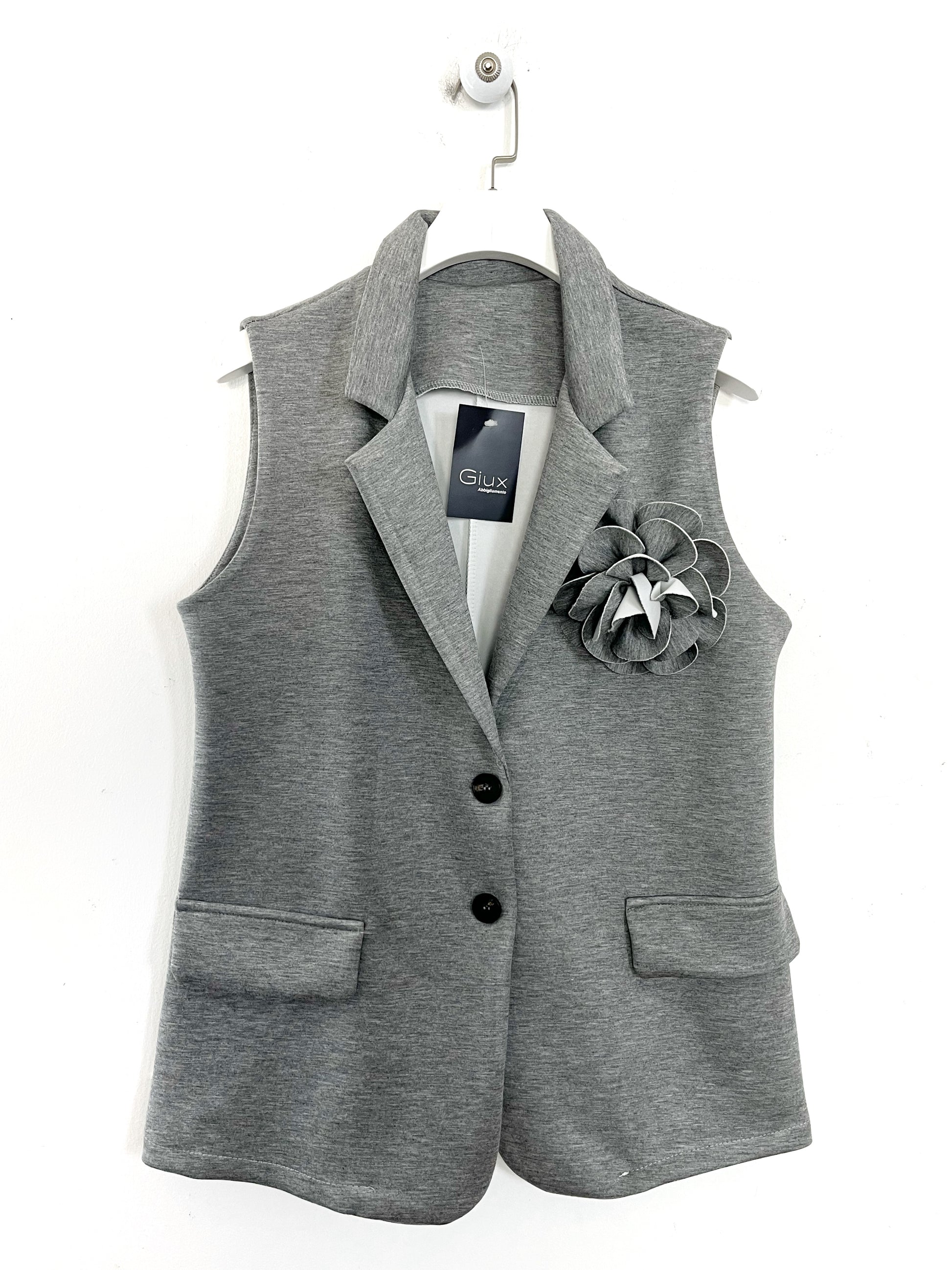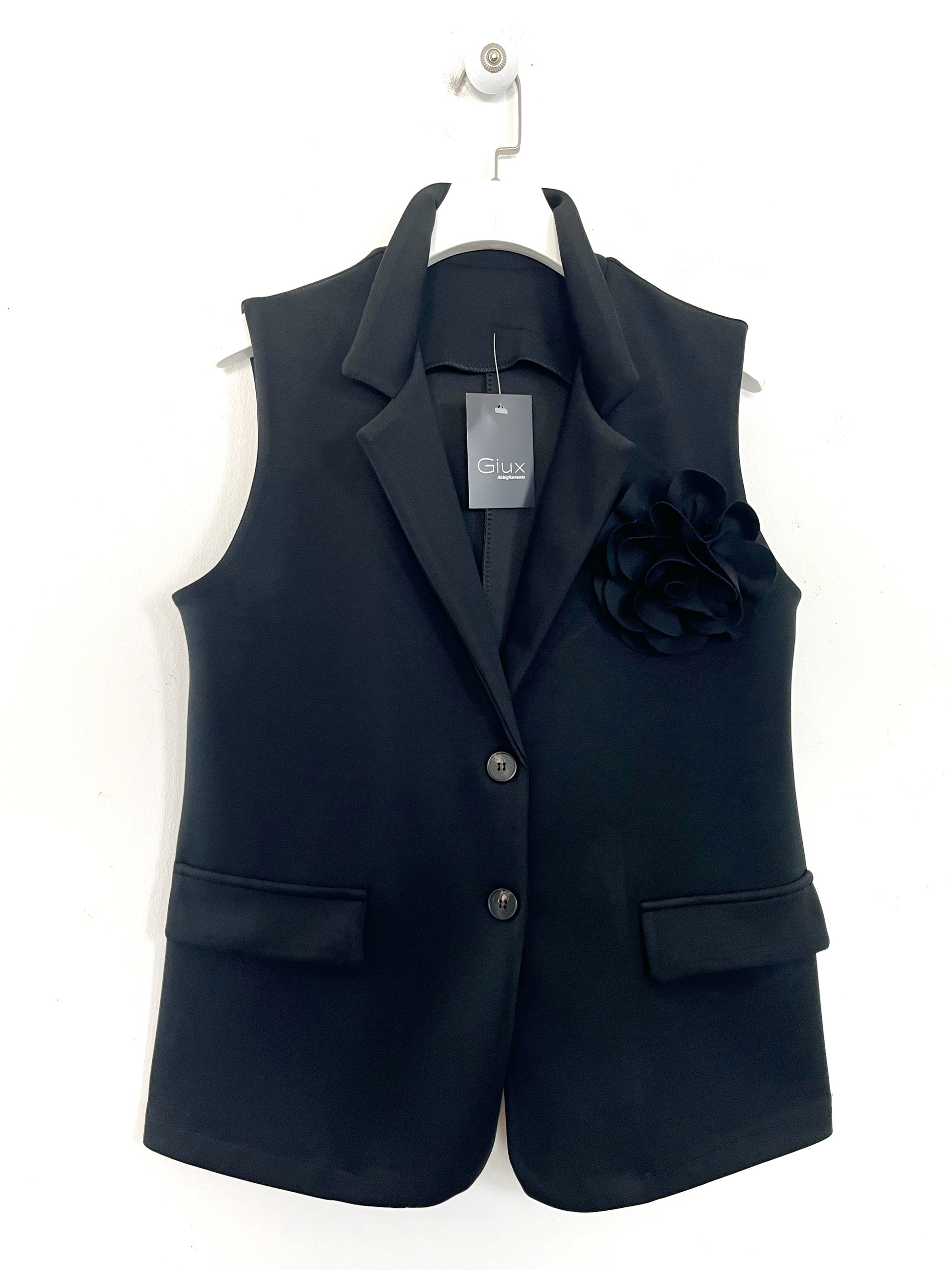 Gilet in leggerissimo neoprene. Chiusura con 2 bottoni sul davanti, tasche finte con patta applicata. Spilla a forma di fiore staccabile