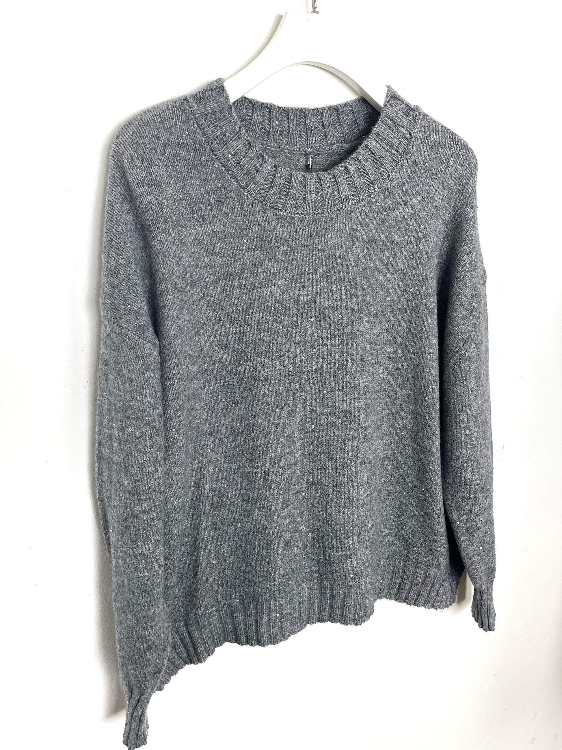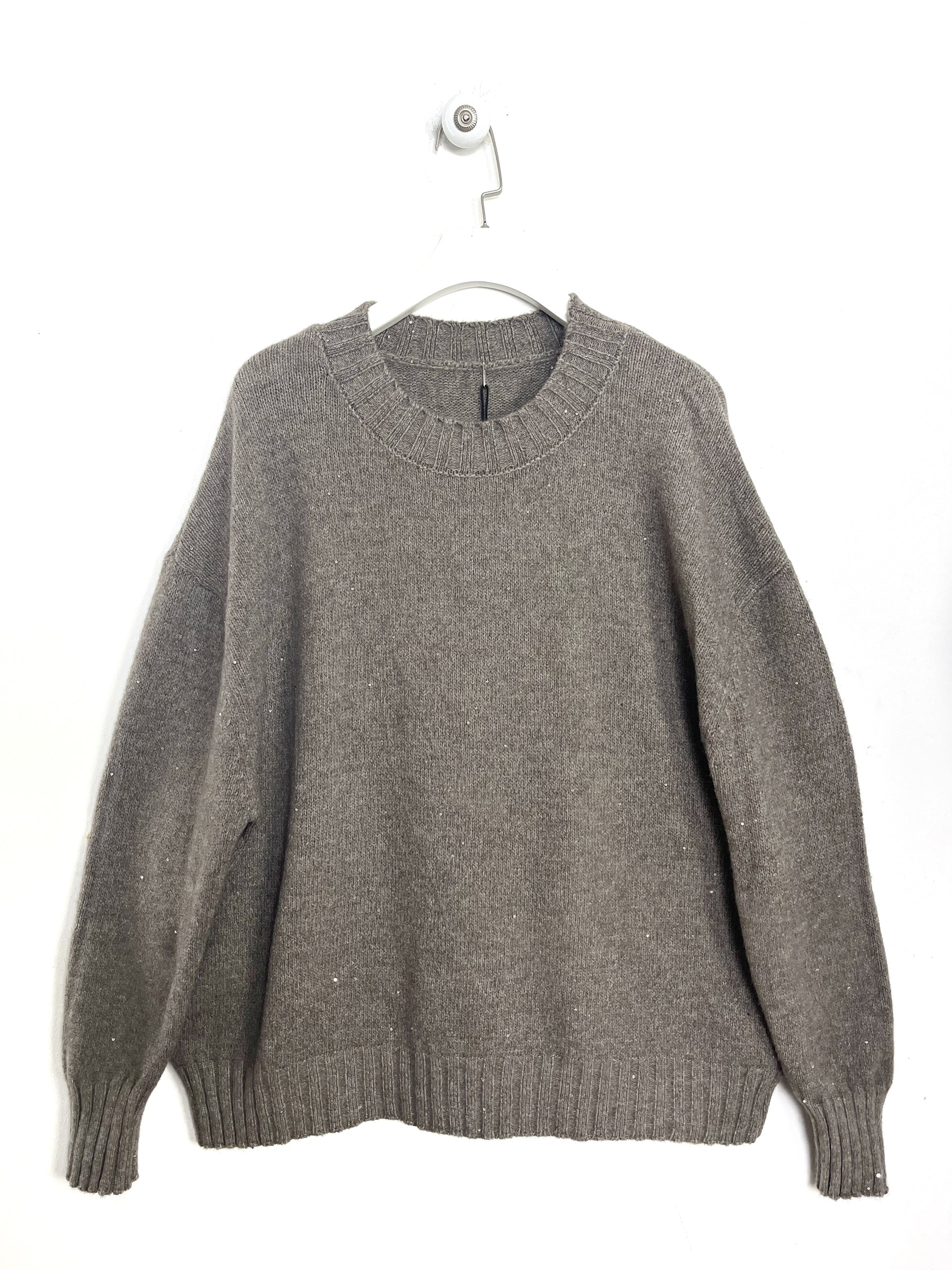 Girocollo con micro paillettes applicate, vestibilità over. Bordi a coste.
