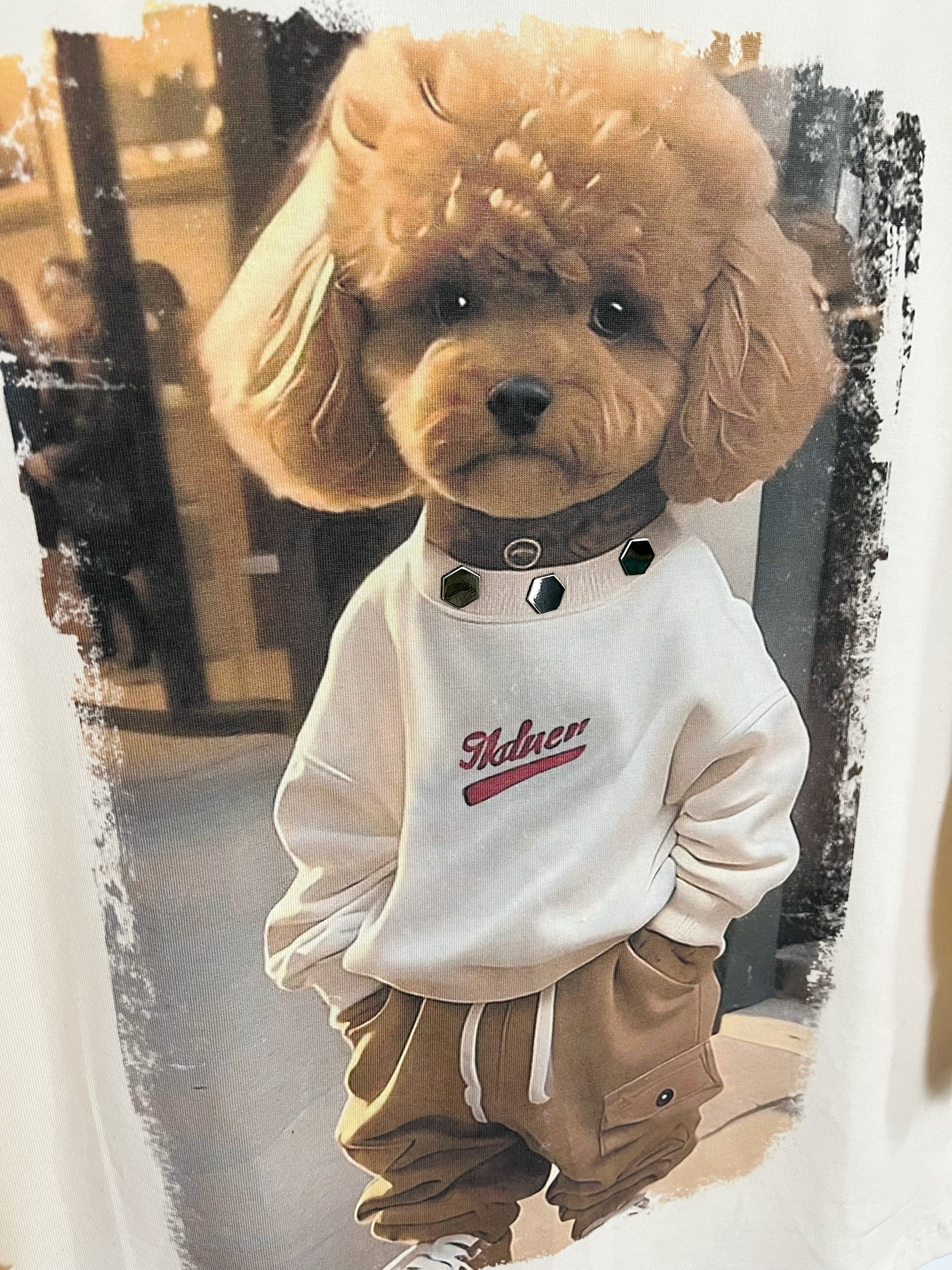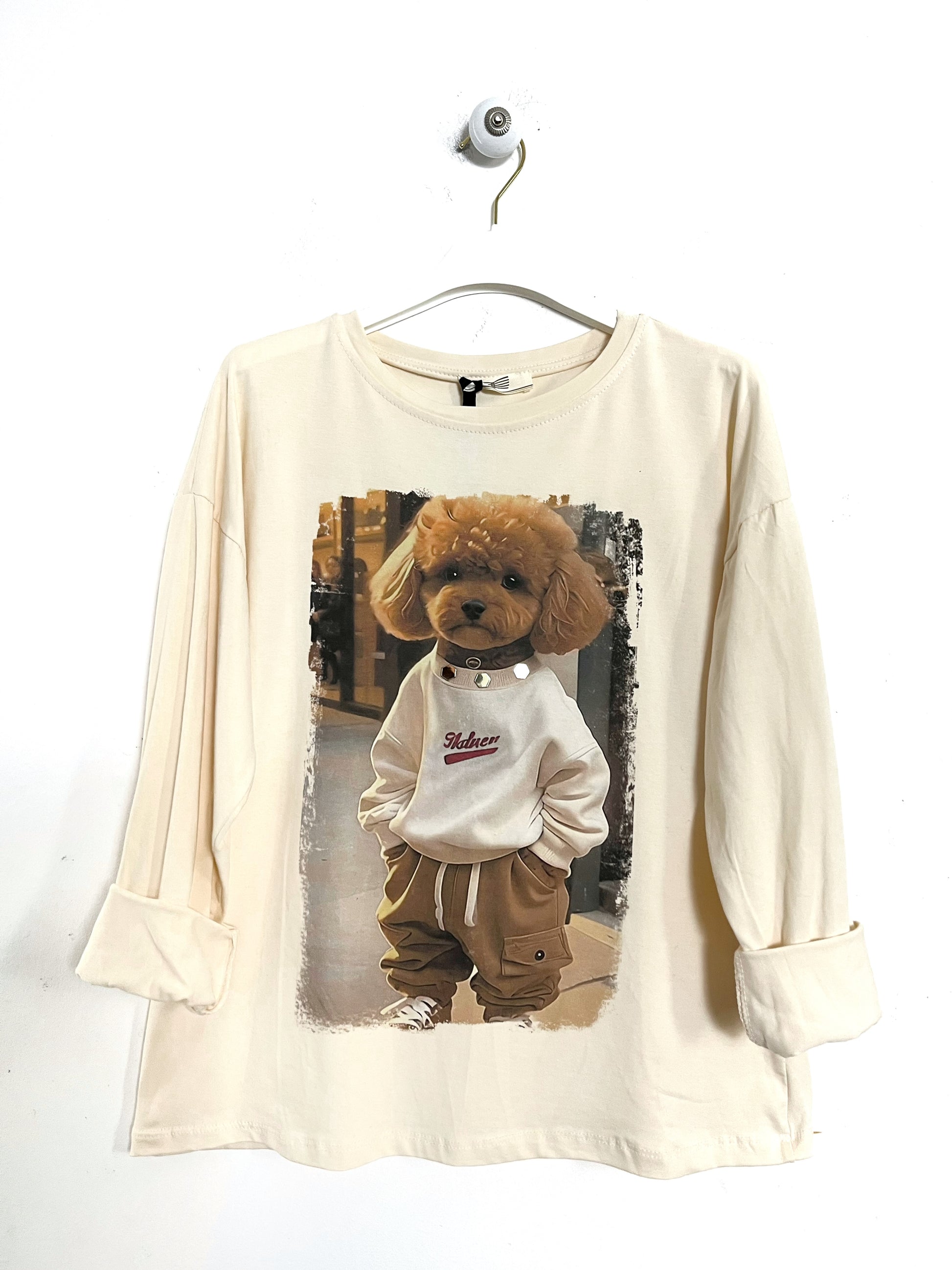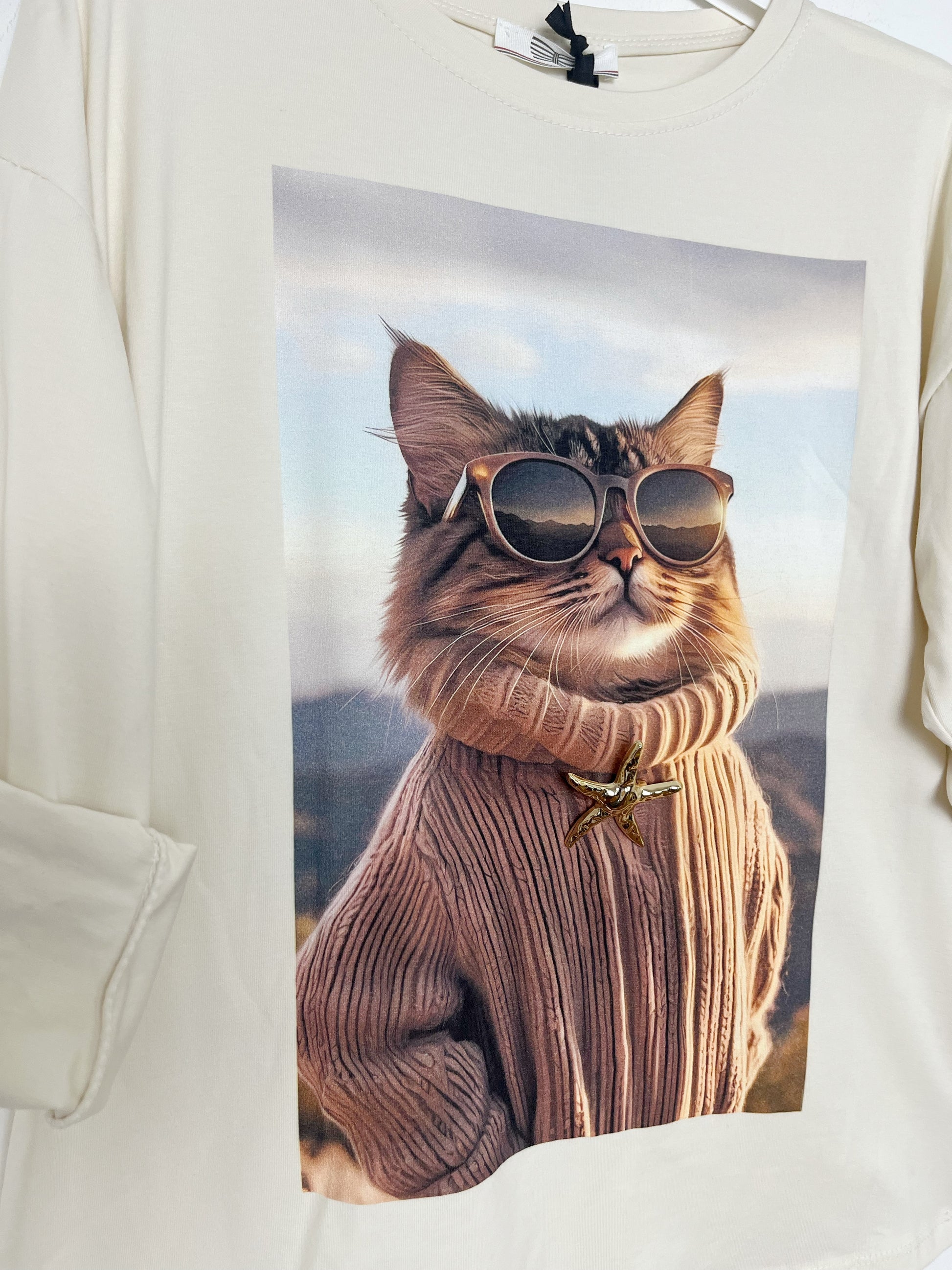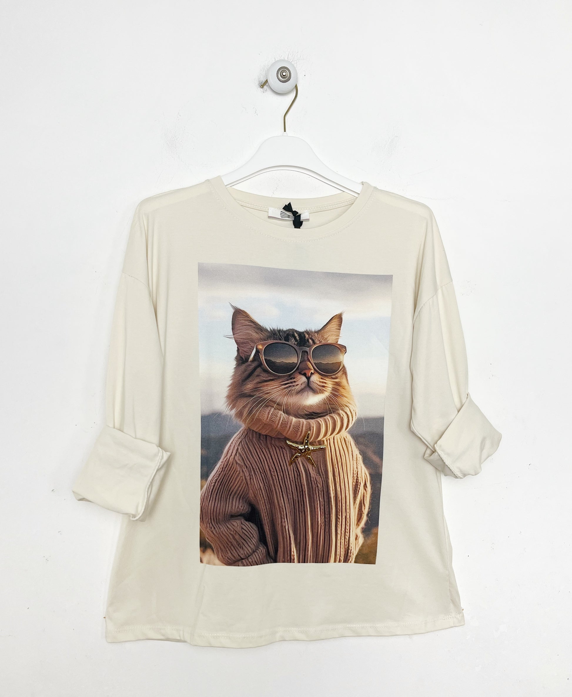 Girocollo in cotone elasticizzato, manica lunga con stampa. Spilla