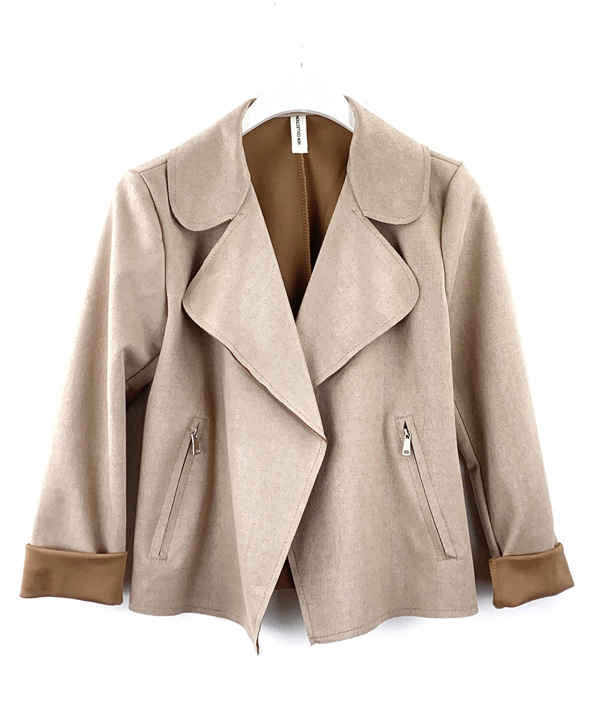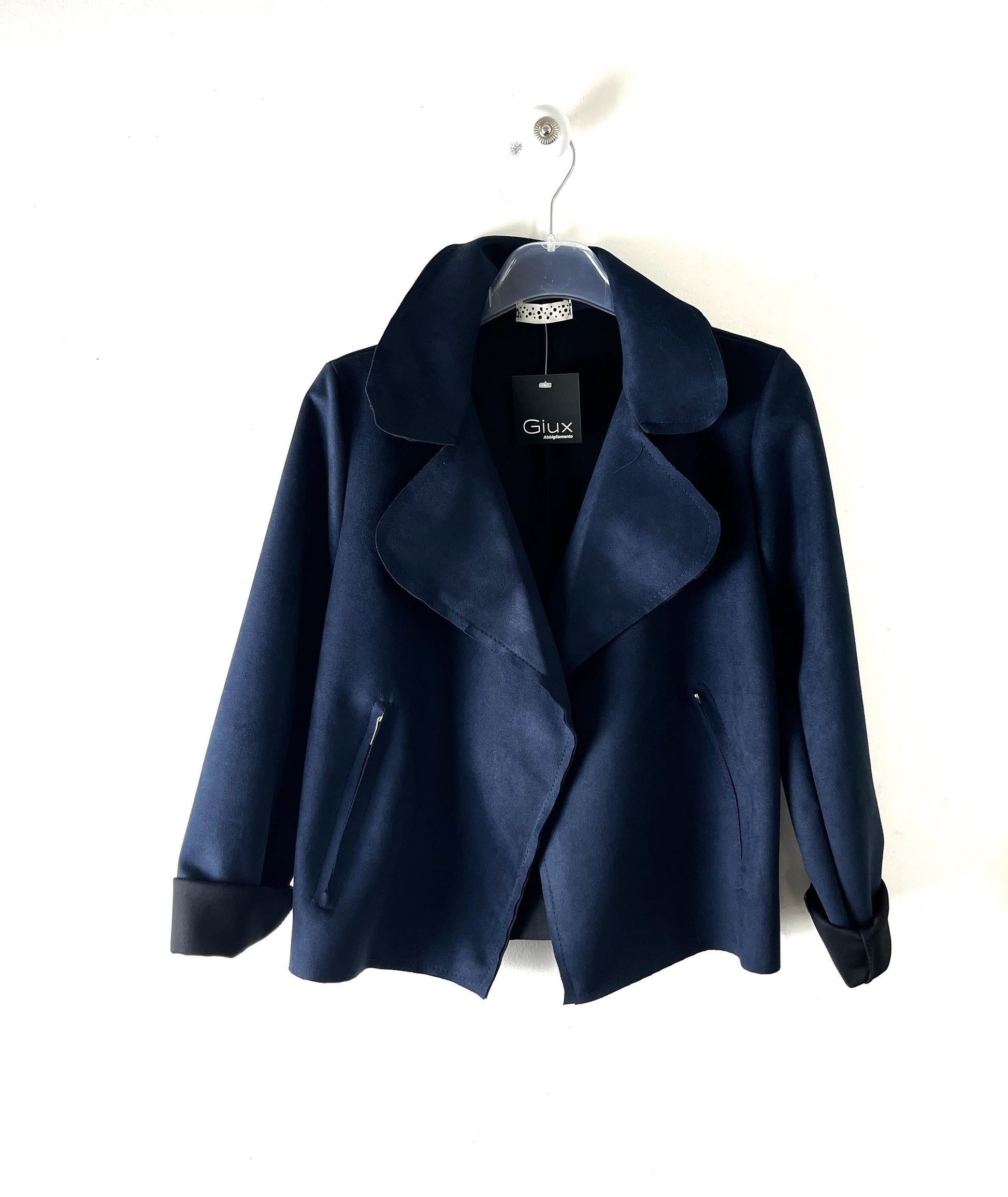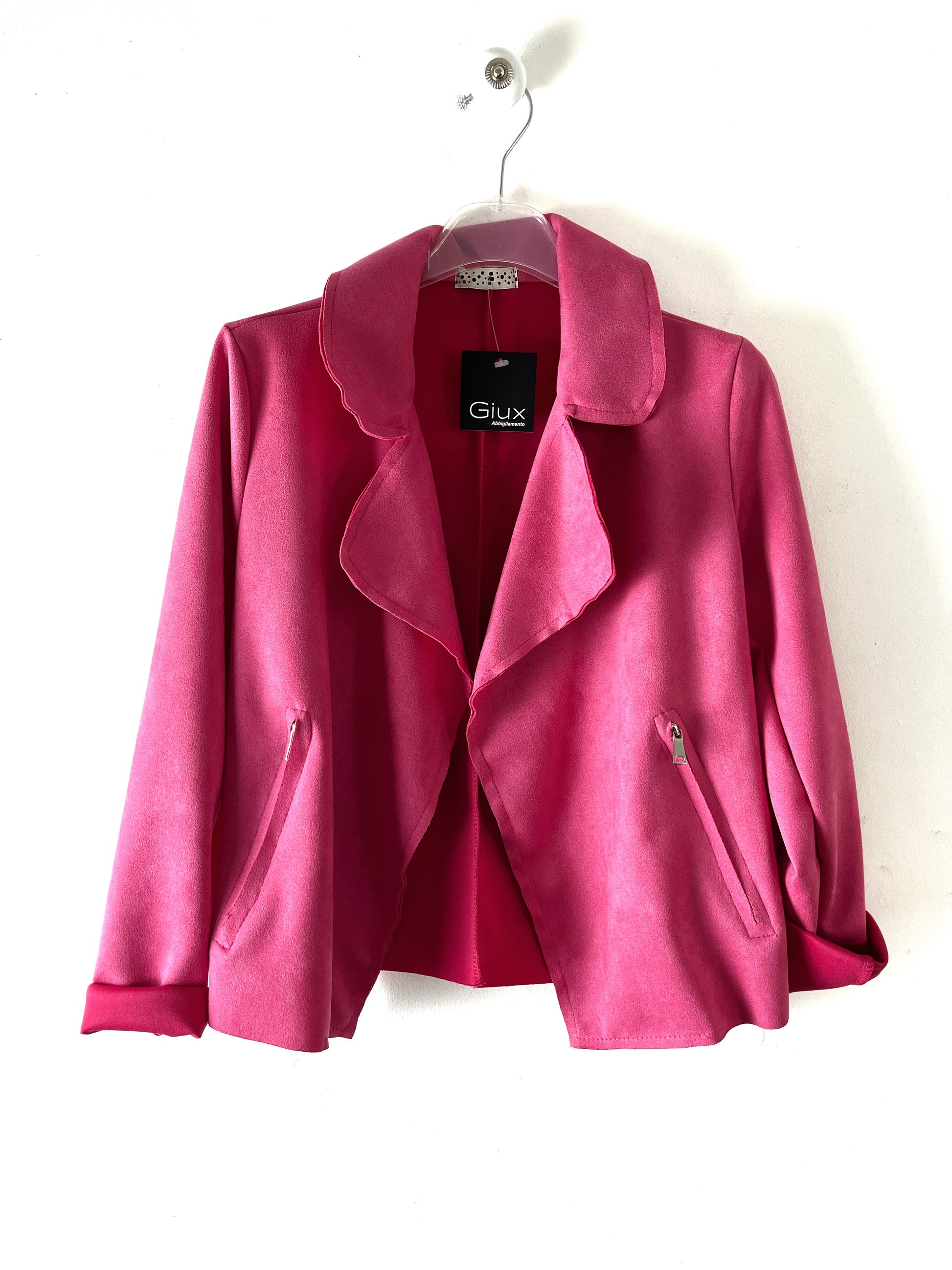 Giubbino biker corto in morbido finto camoscio. Colletto e revers con tasche laterali con cerniera. Manica lunga.