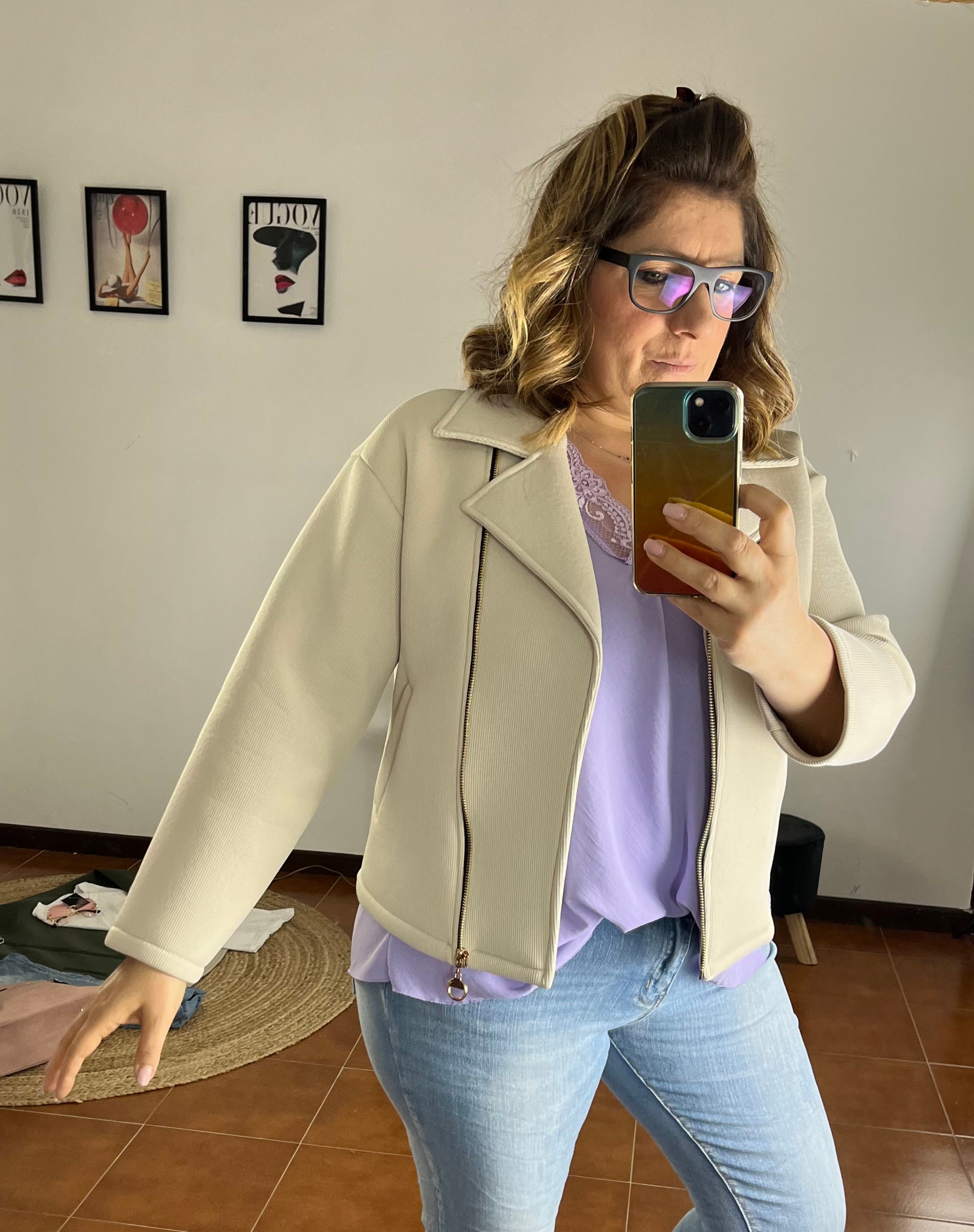 Giubbino biker in neoprene. Cropped, spalla ribassata.