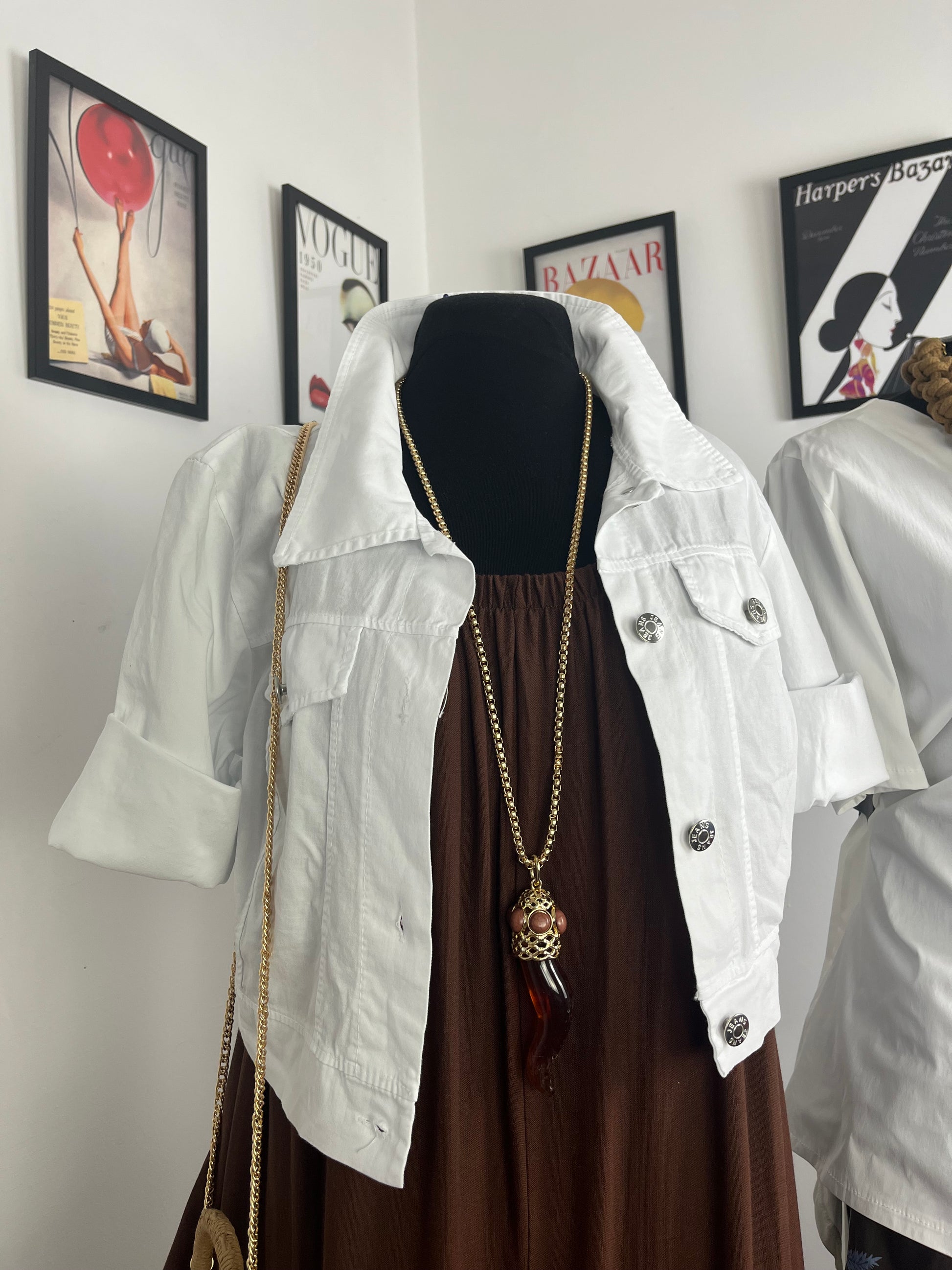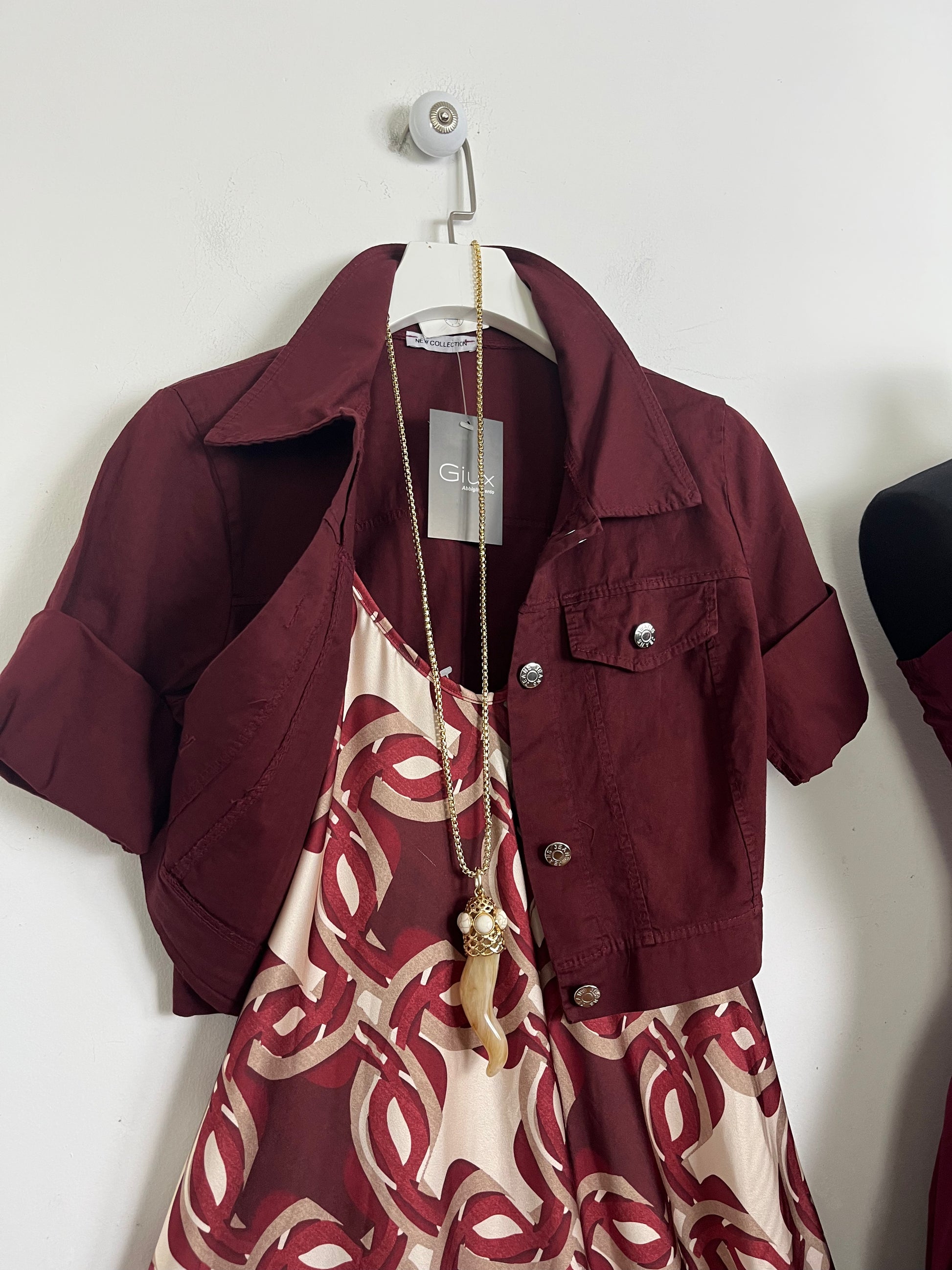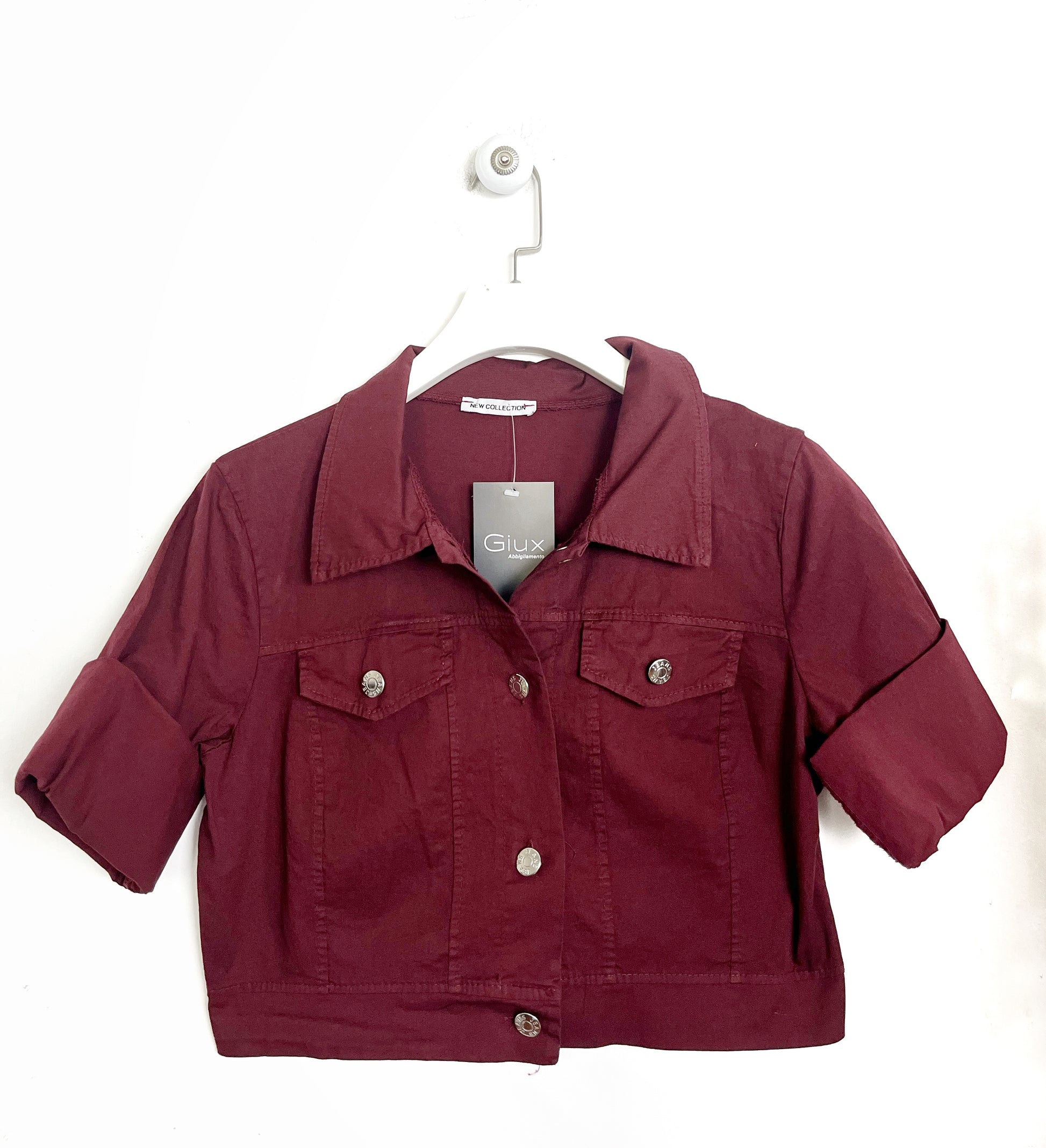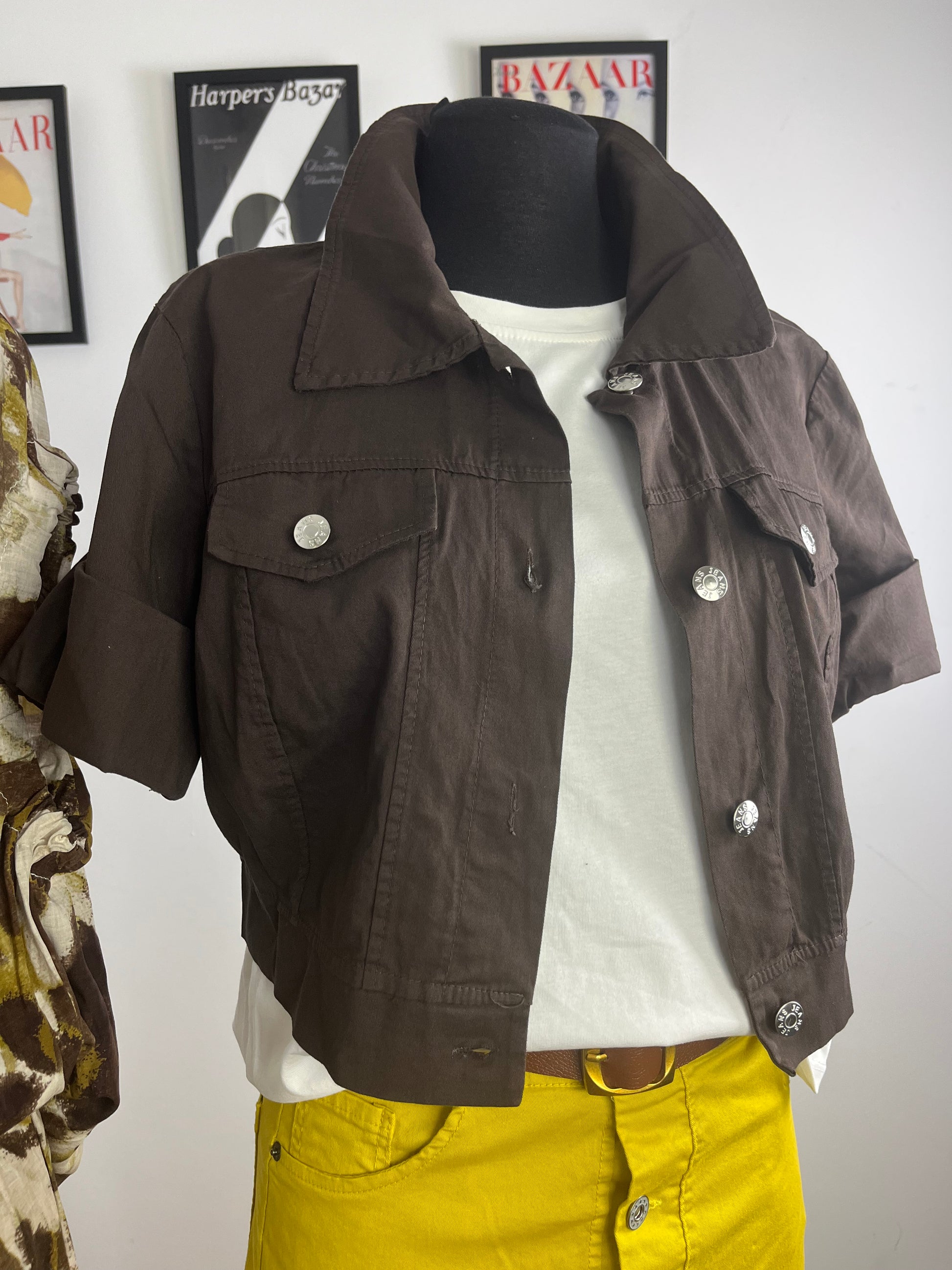 Giubbino crop in cotone, con colletto, chiusura con bottoni sul davanti, taschine sul davanti, maniche a 3/4 con bottoncino sul polsino.