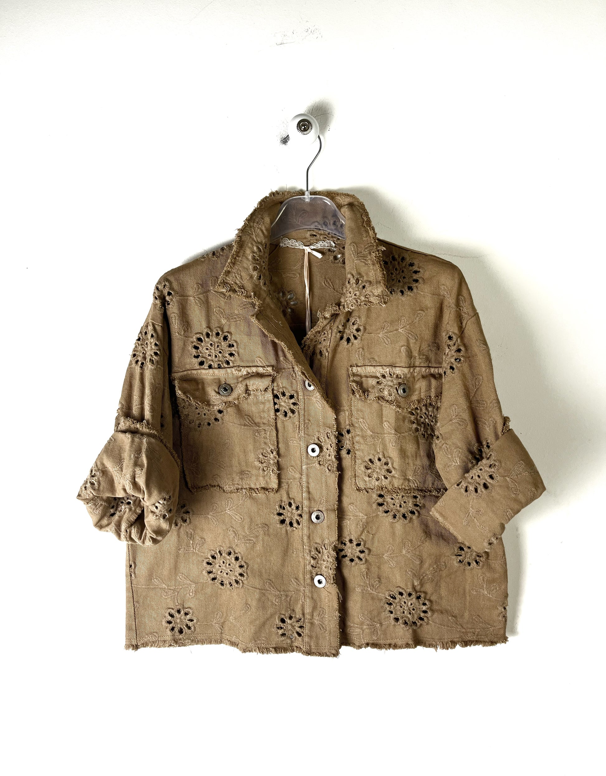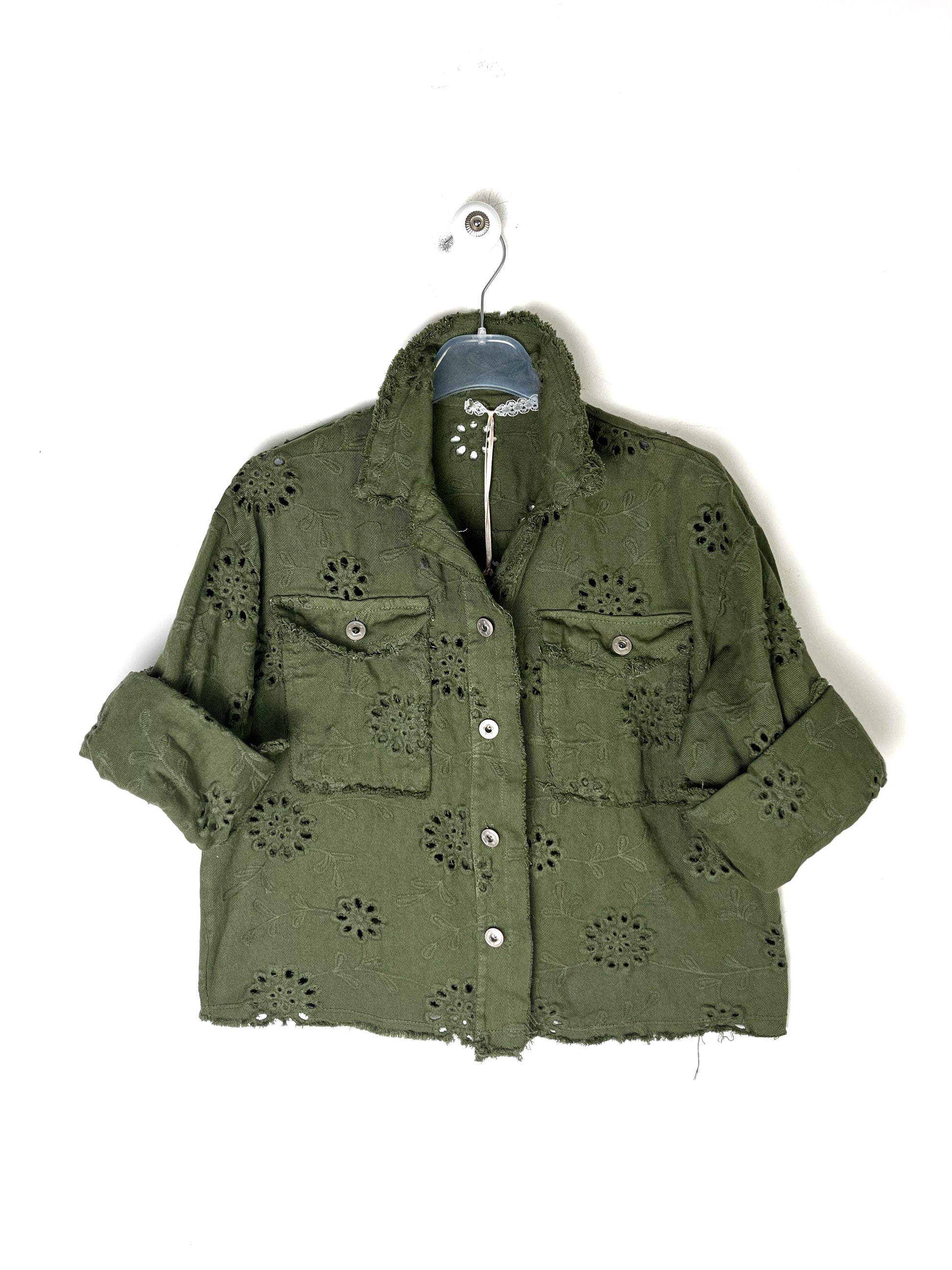 Giubbino in cotone traforato. Chiusura con bottoni. 2 Tasche applicate con patta e bottone. Manica lunga con polsino e bottone.