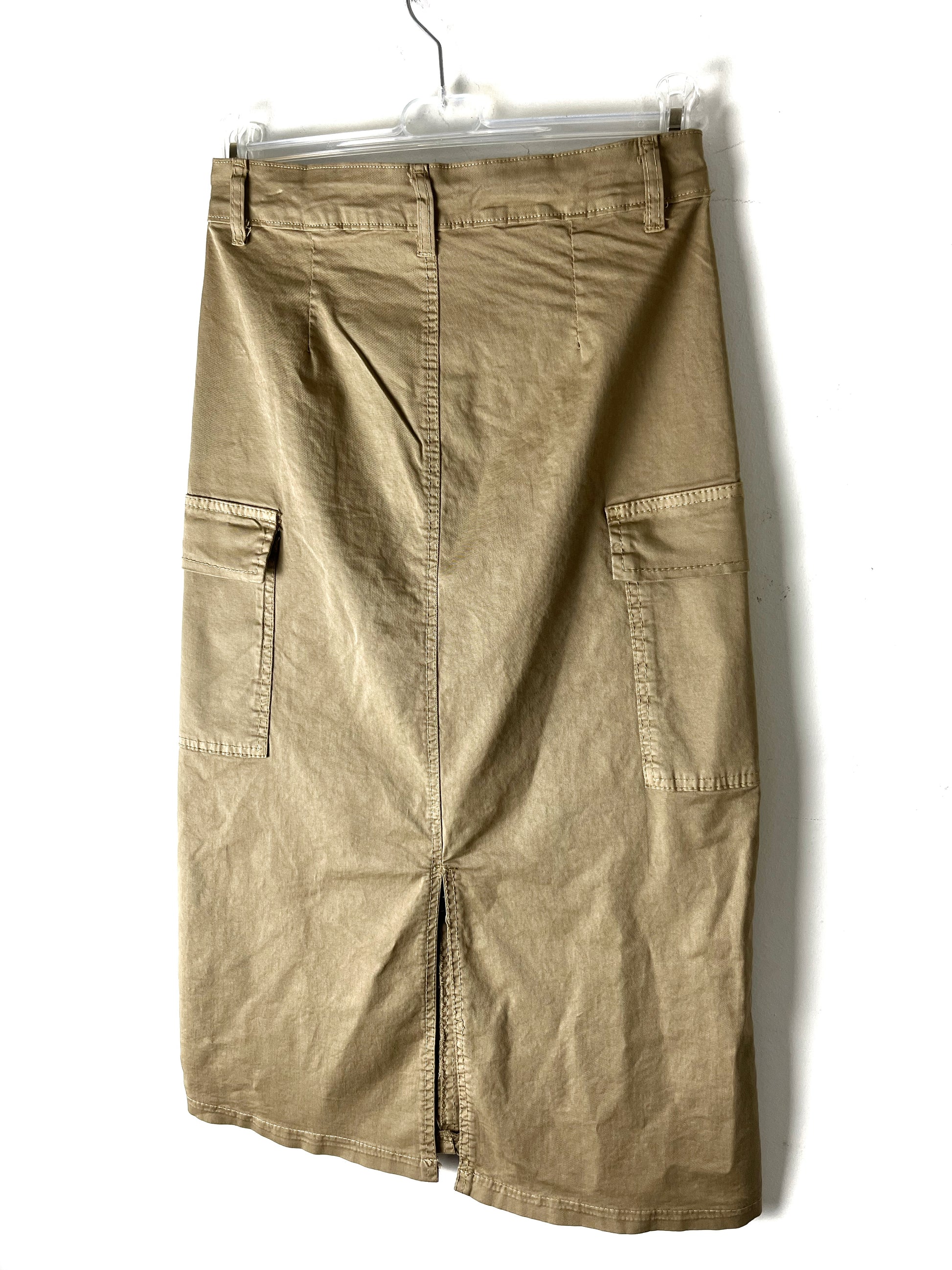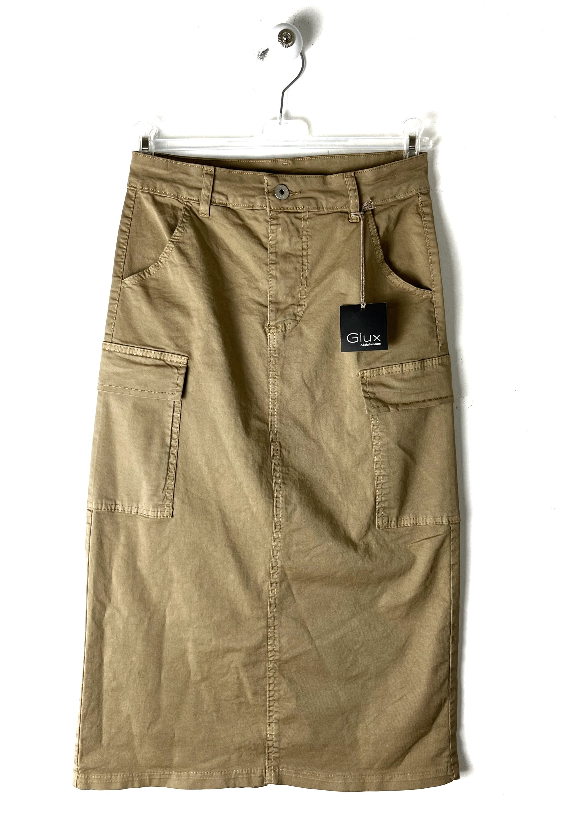 Gonna cargo con vita alta, chiusura con bottone e cerniera. Tasche laterali con patta, spacco dietro. Lunghezza midi