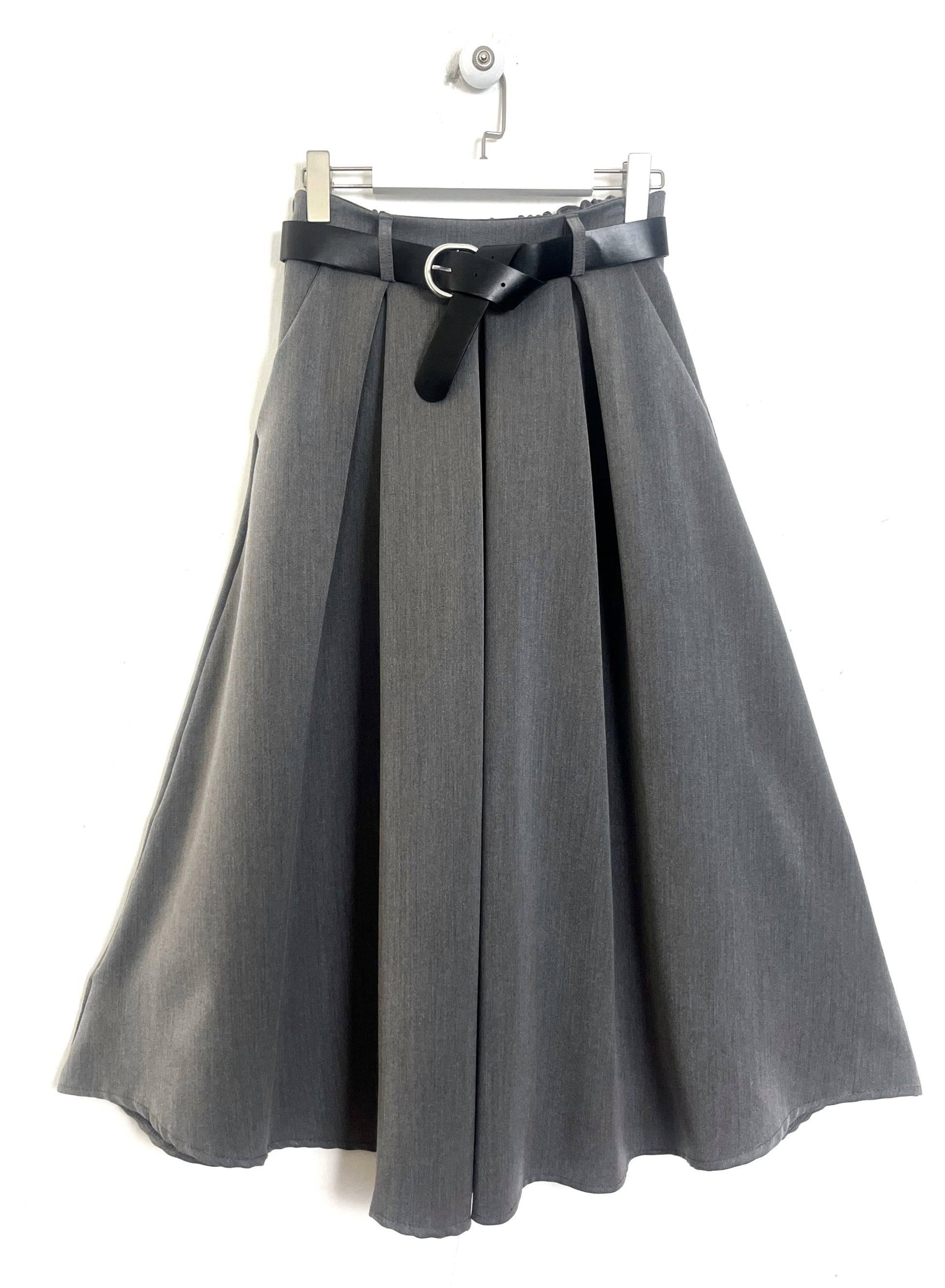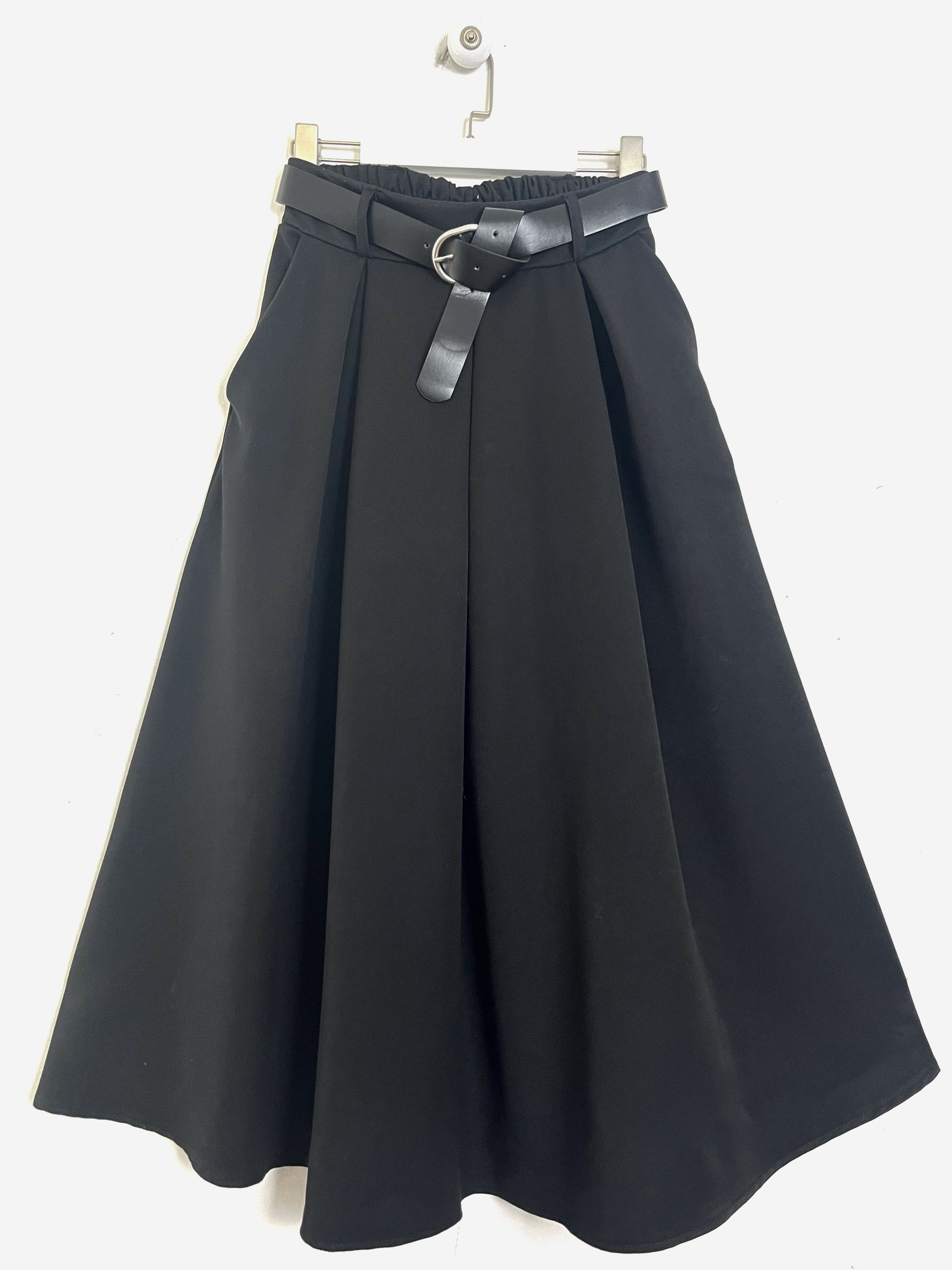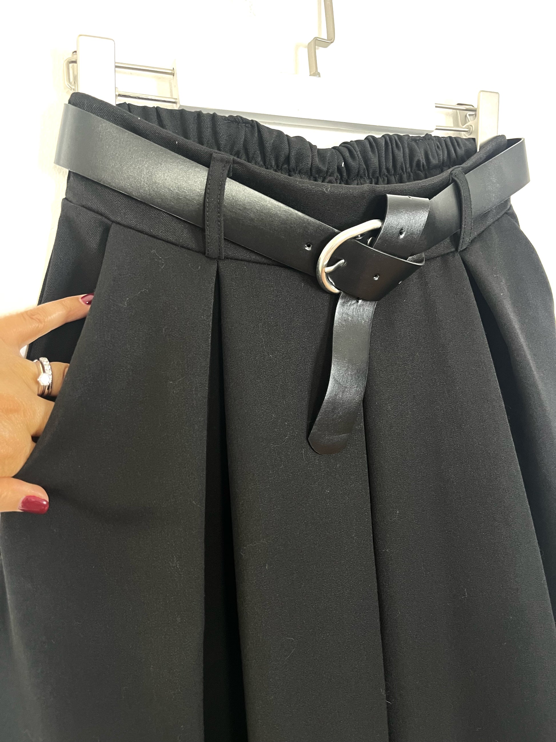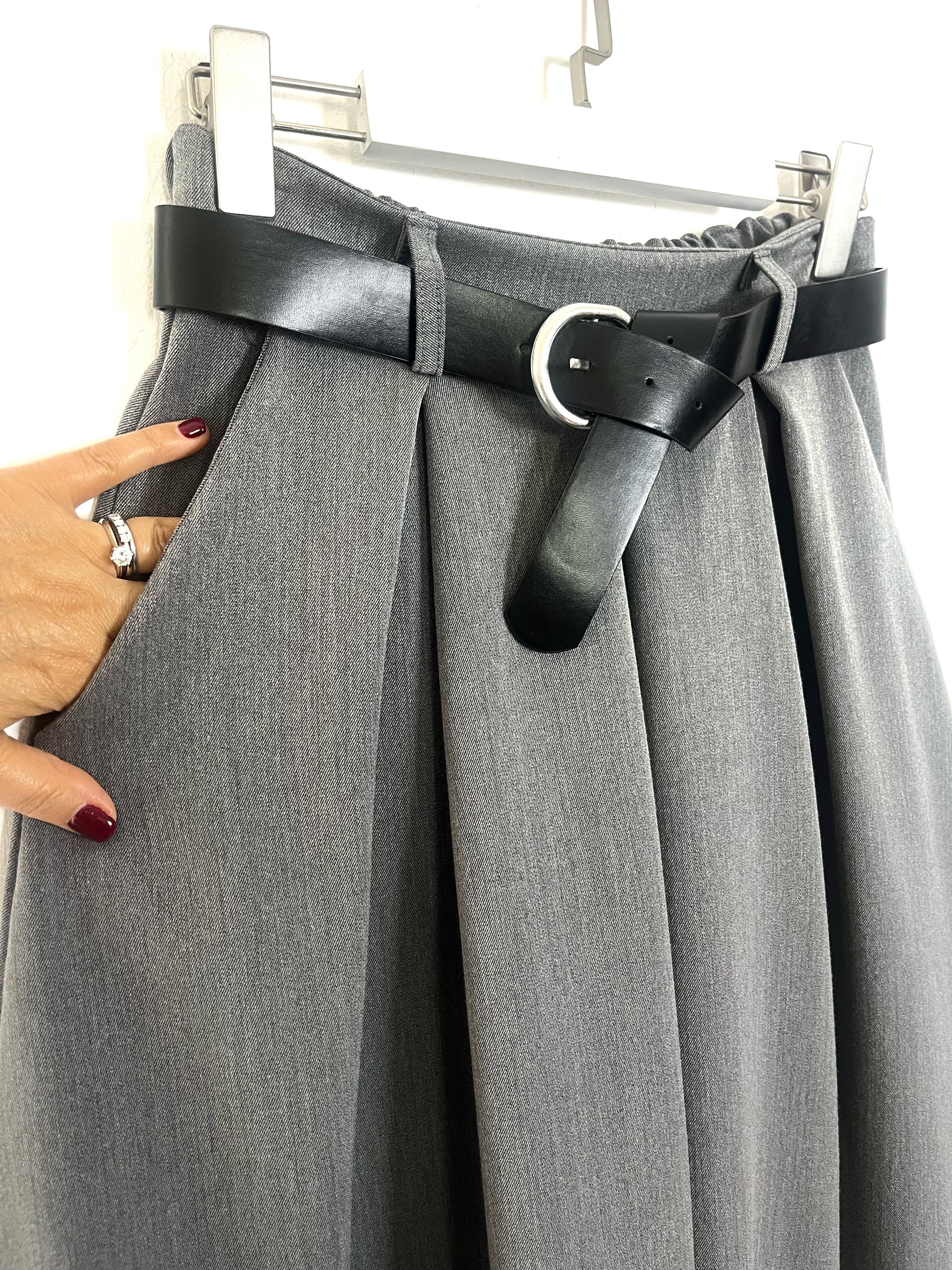 Gonna in tessuto lunghezza midi, elastico in vita dietro, baschina liscia davanti. Passanti con cintura in ecopelle. Pence sul davanti, Tasche laterali