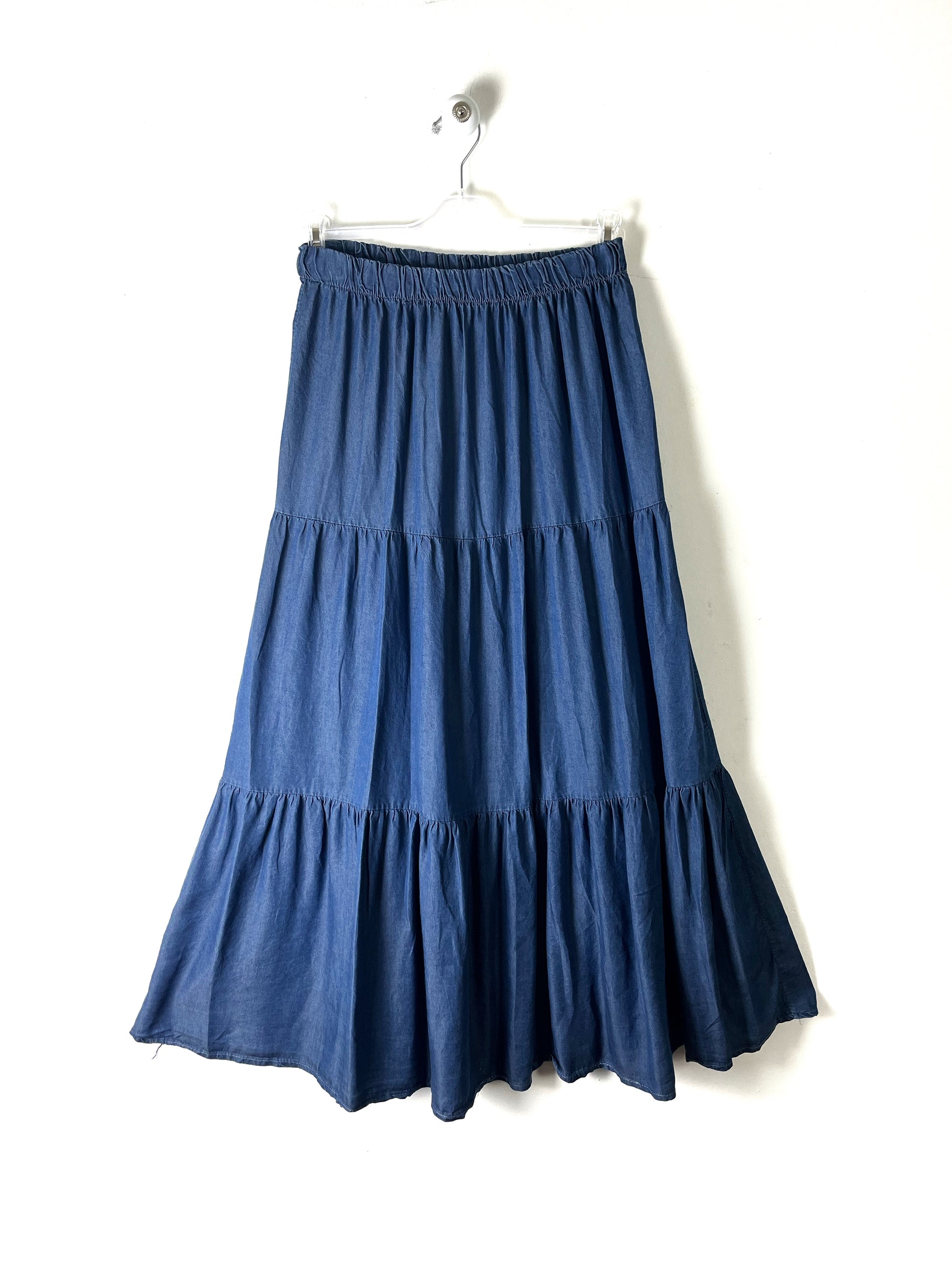 Gonna lunga in denim leggero. Elastico in vita. Svasata.