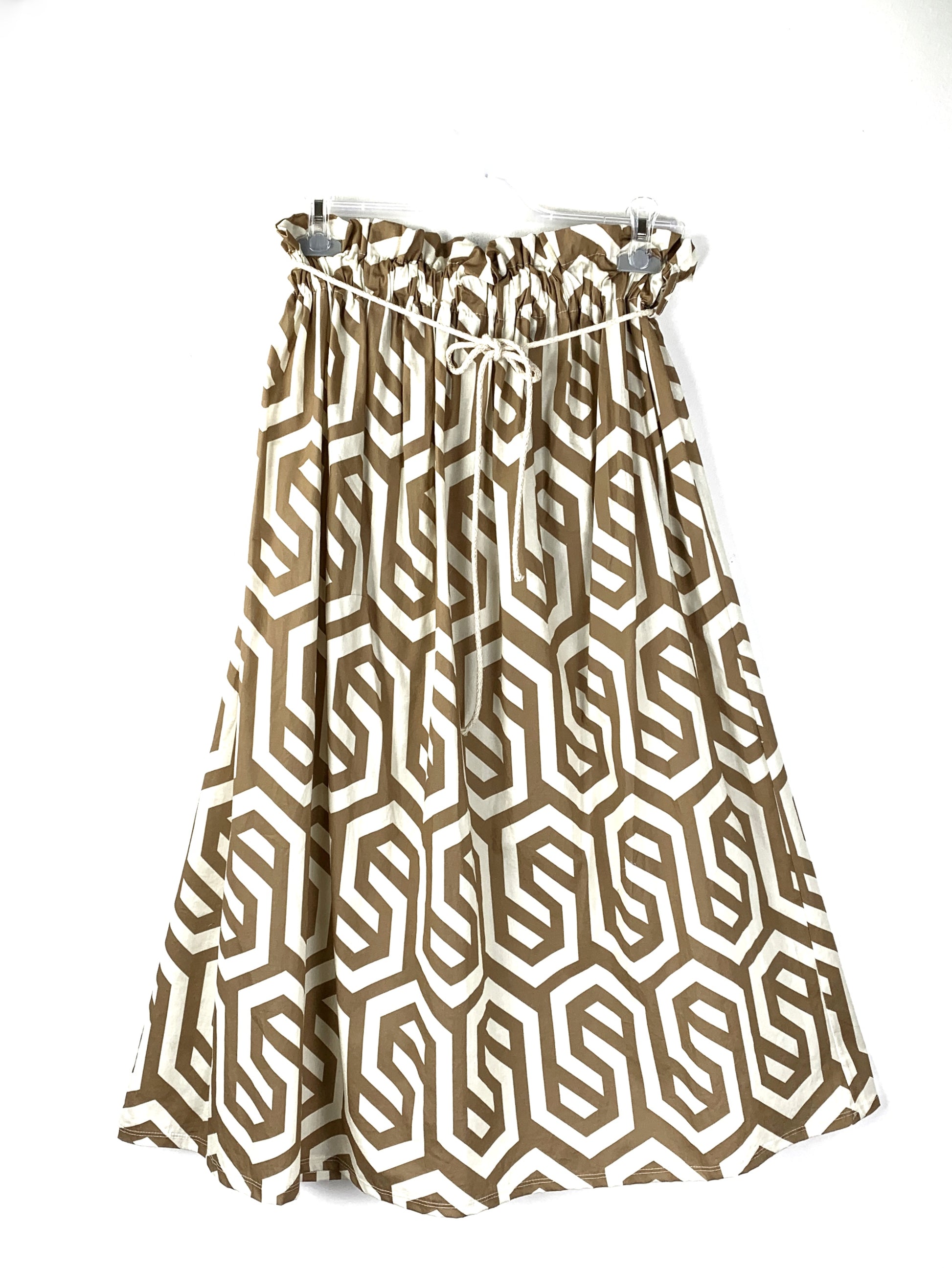 Gonna lunga in cotone. Elastico arricciato in vita. Passanti per cinturino in corda. Svasata.