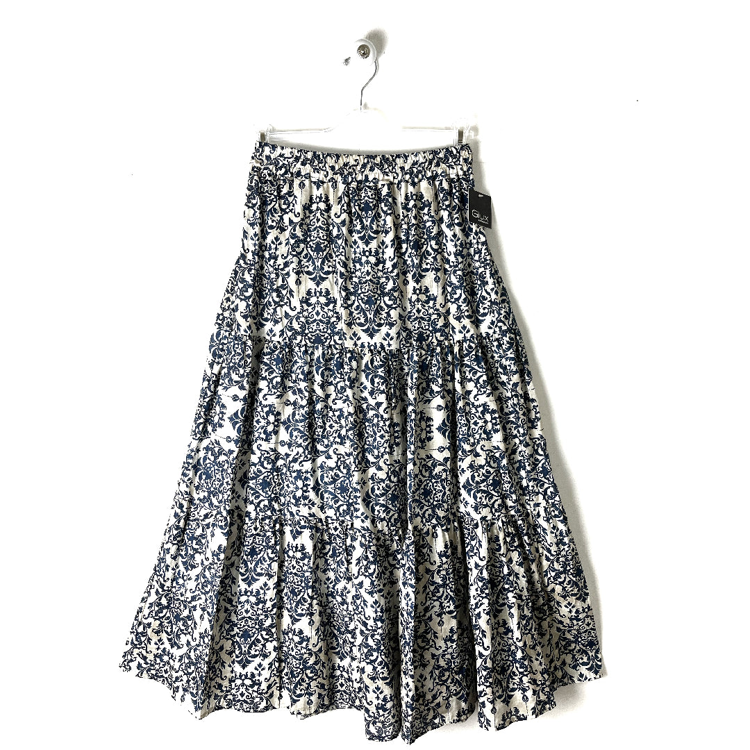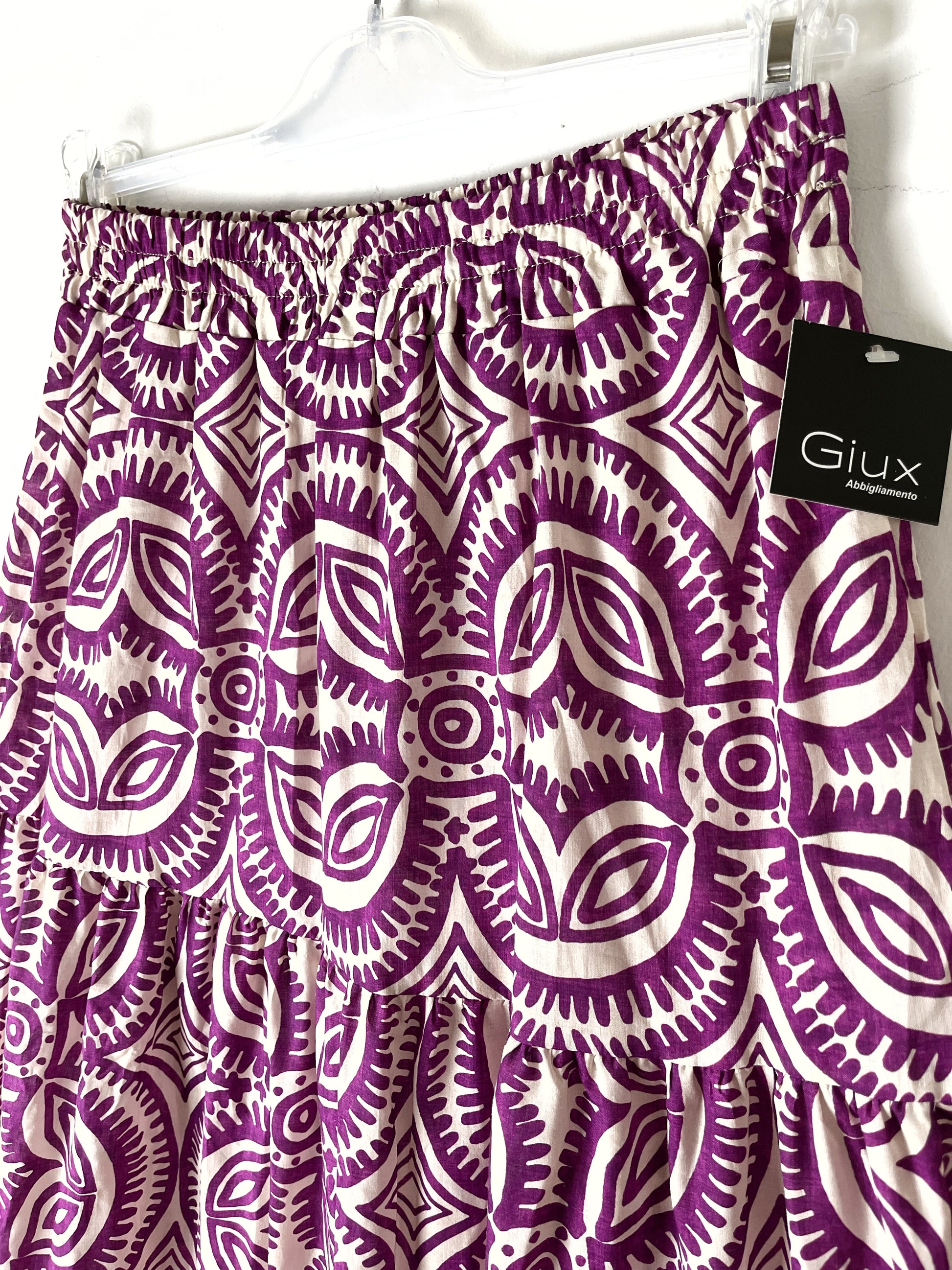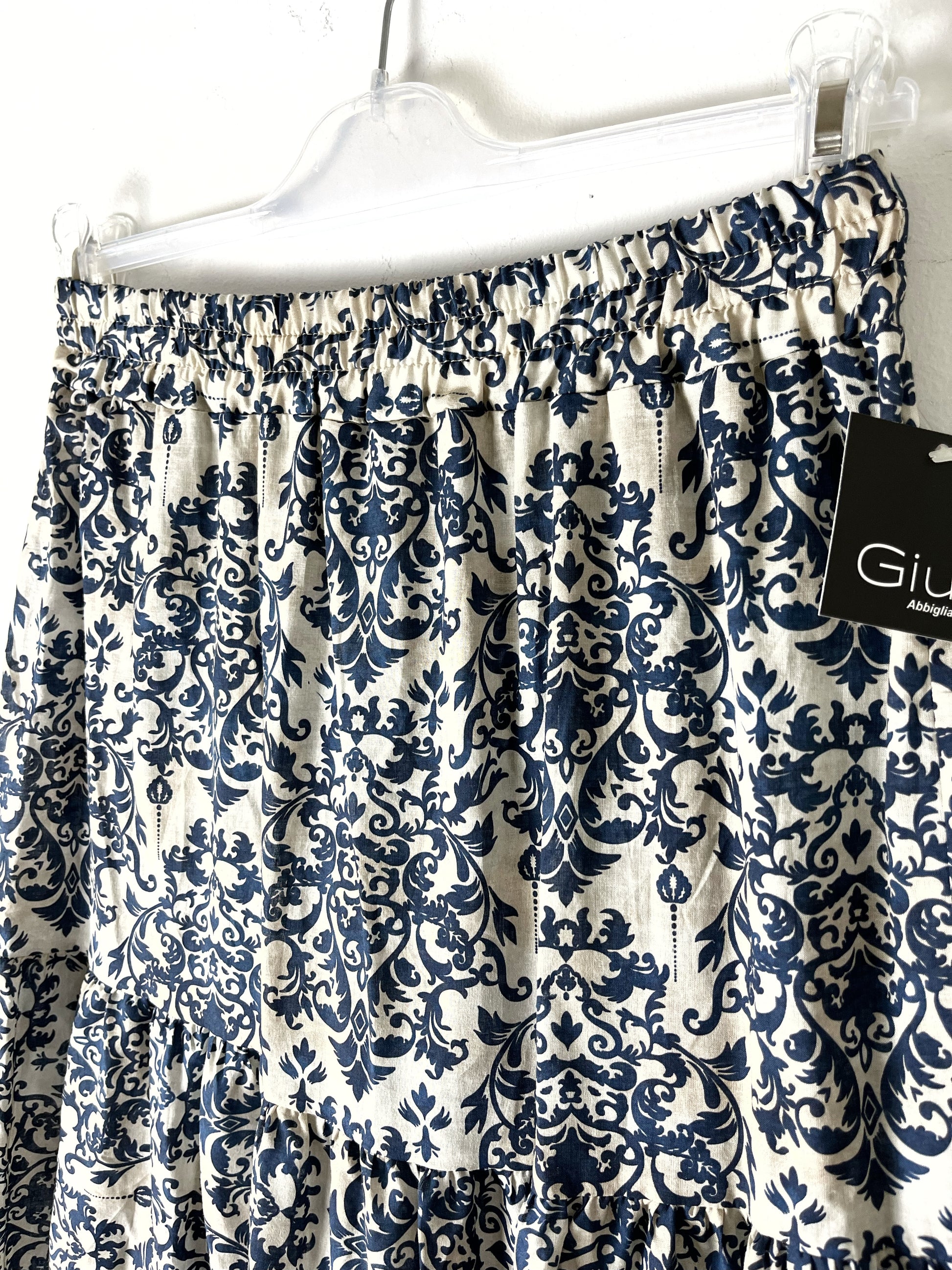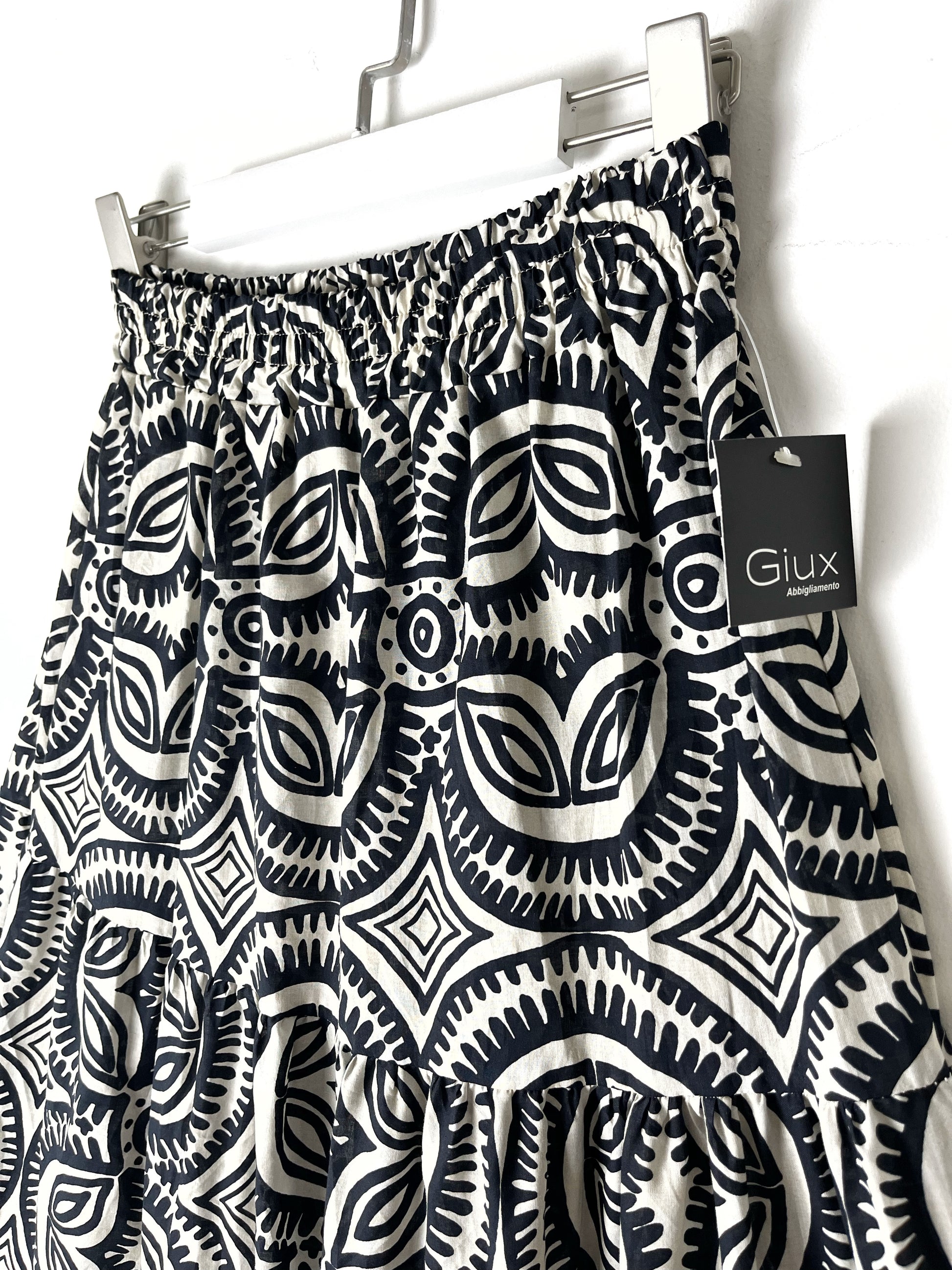 Gonna lunga in puro cotone. Elastico in vita, svasata sul fondo. A balze