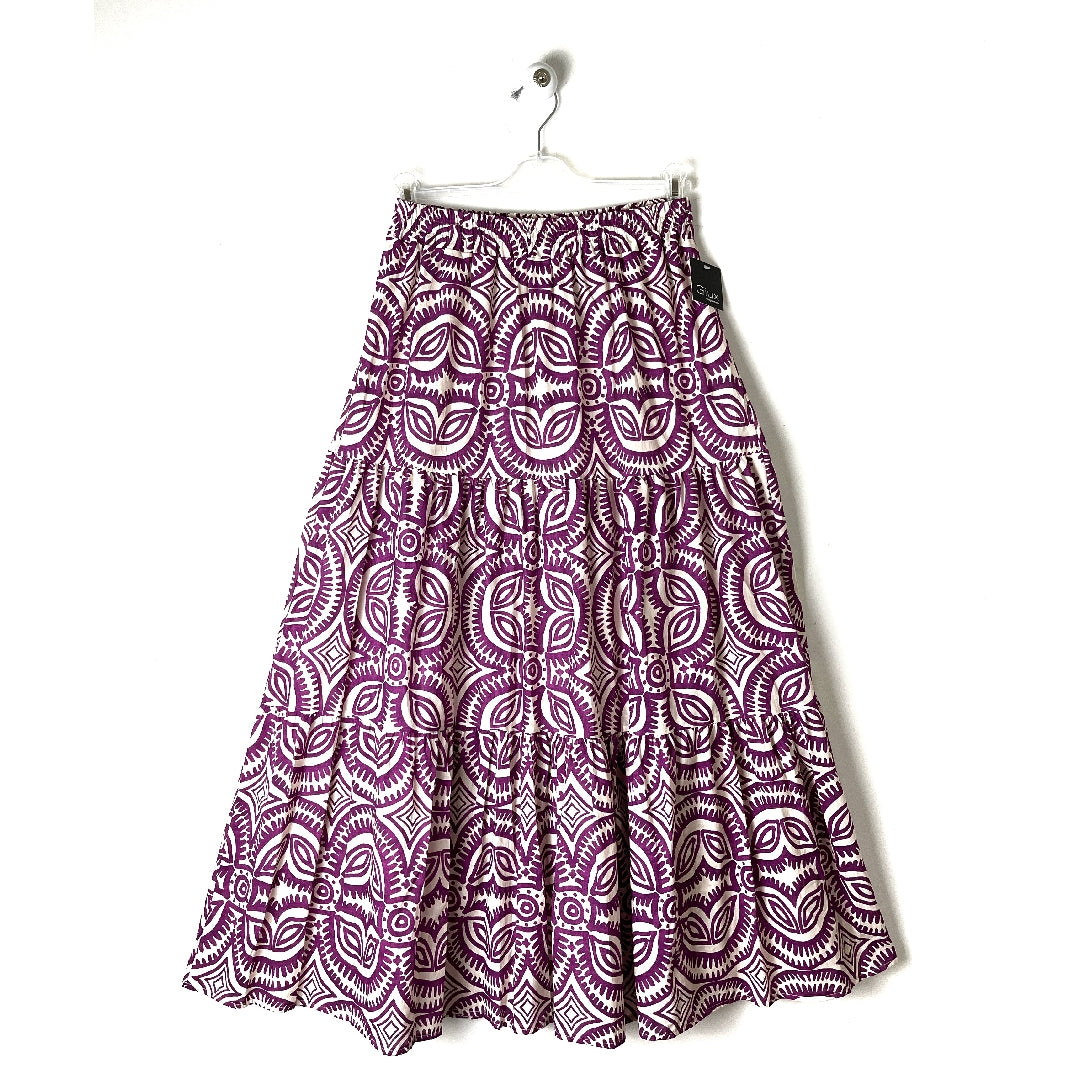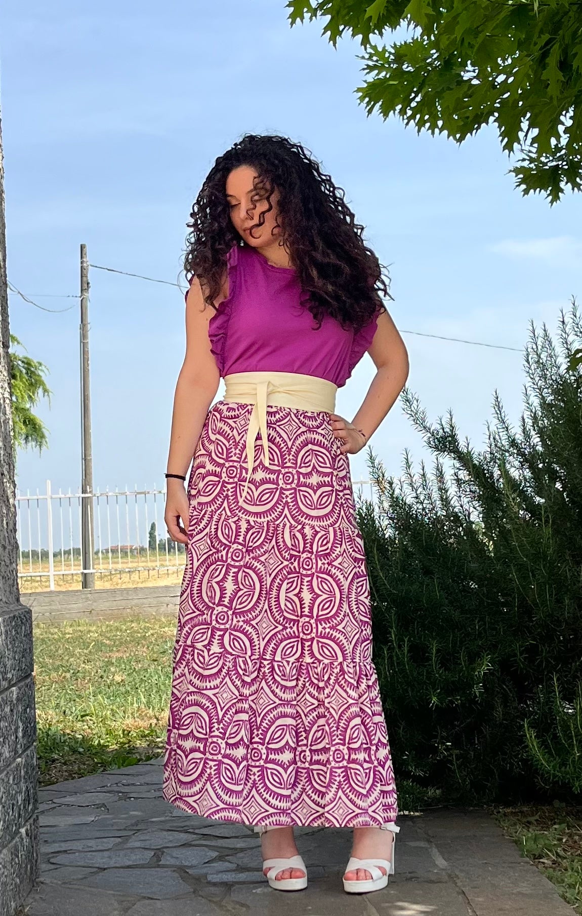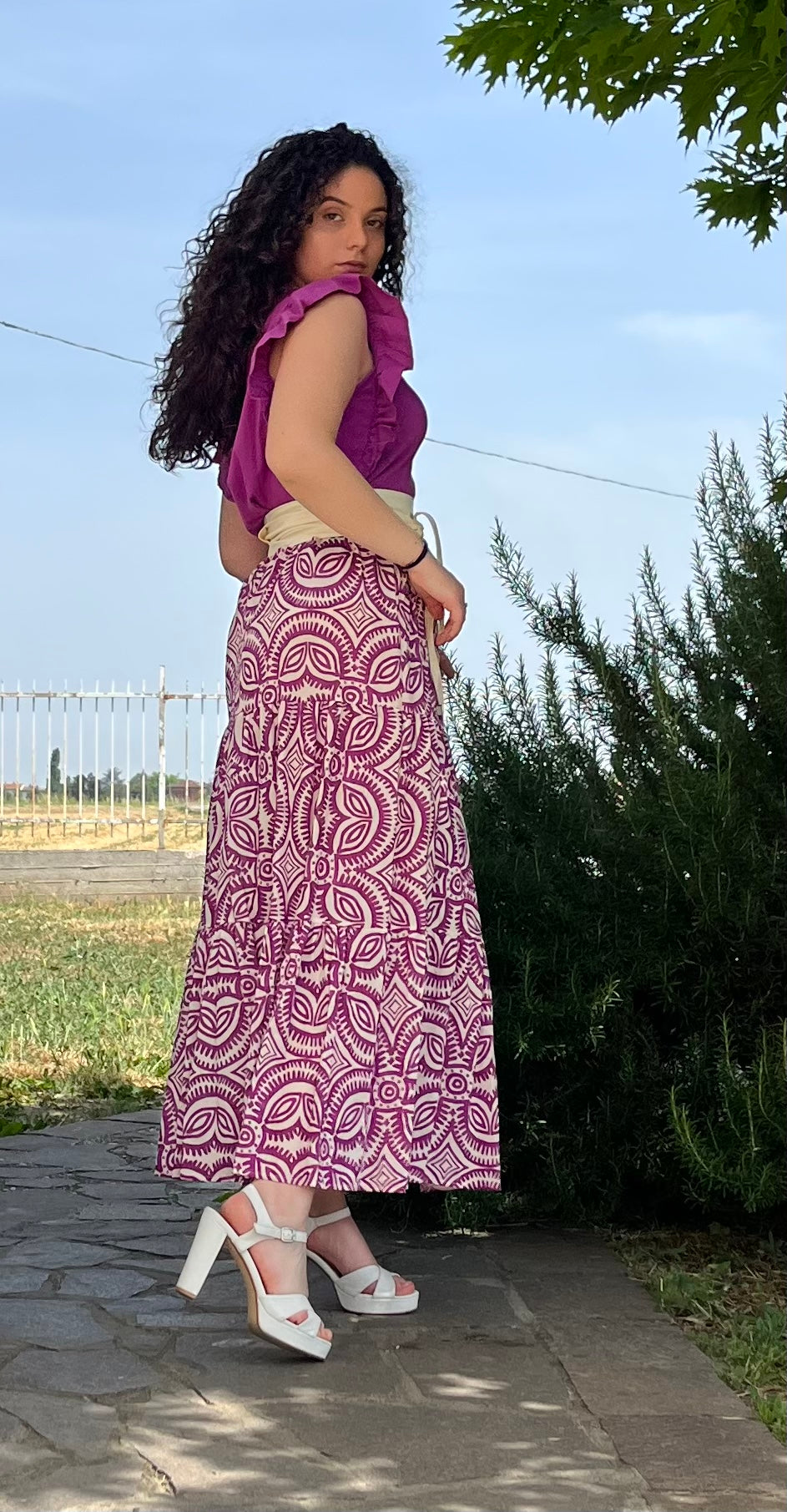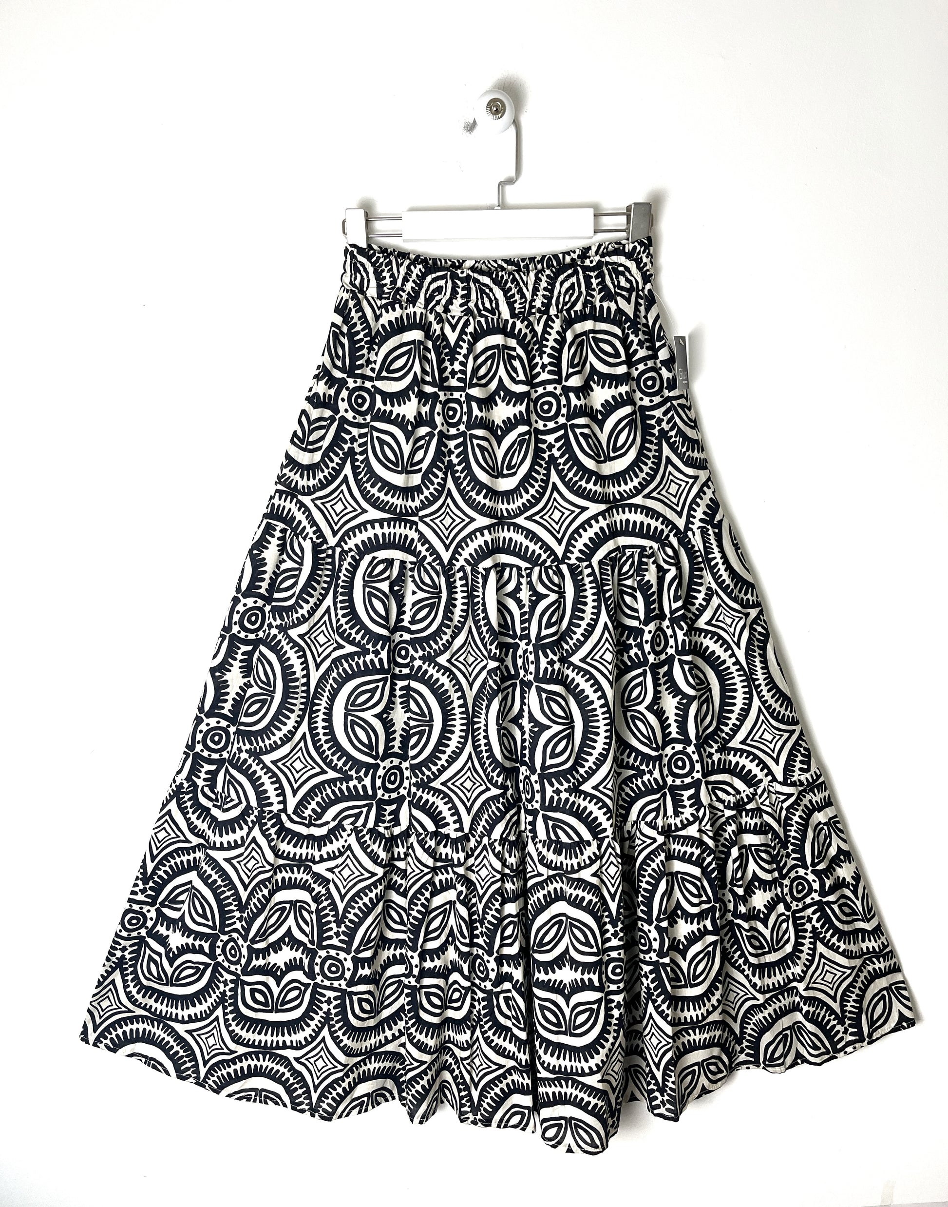 Gonna lunga in puro cotone. Elastico in vita, svasata sul fondo. A balze