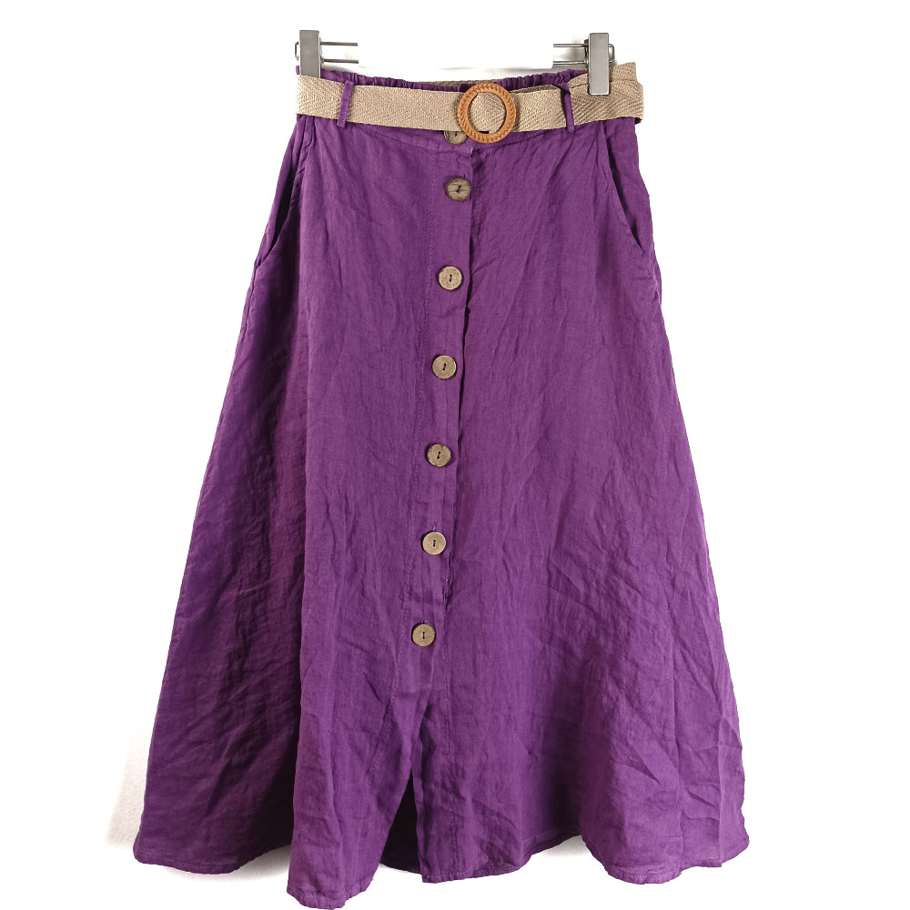 Gonna lunga in puro lino. Tutta abbottonata sul davanti. Passanti con cintura, tasche laterali. Elastico in vita, apertura con bottone e asola.