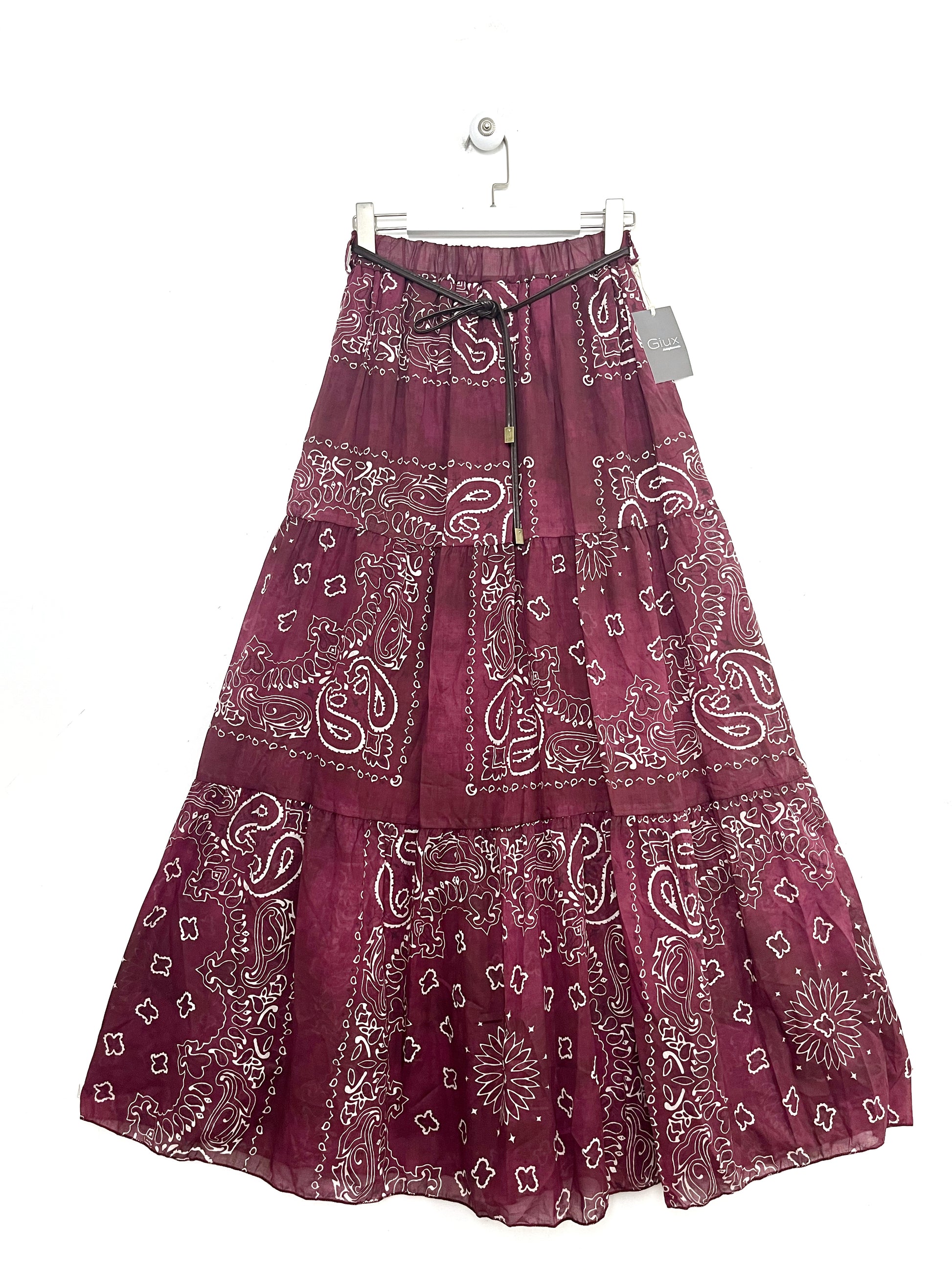 Gonna lunga in mussola di cotone leggerissima, fantasia bandana. Elastico in vita, svasata. Foderata