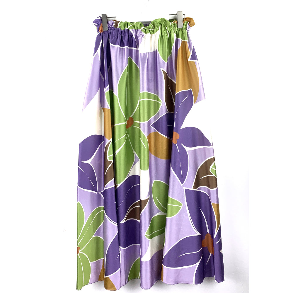 Gonna lunga, ampia e svasata. In raso, elastico e arricciatura in vita.