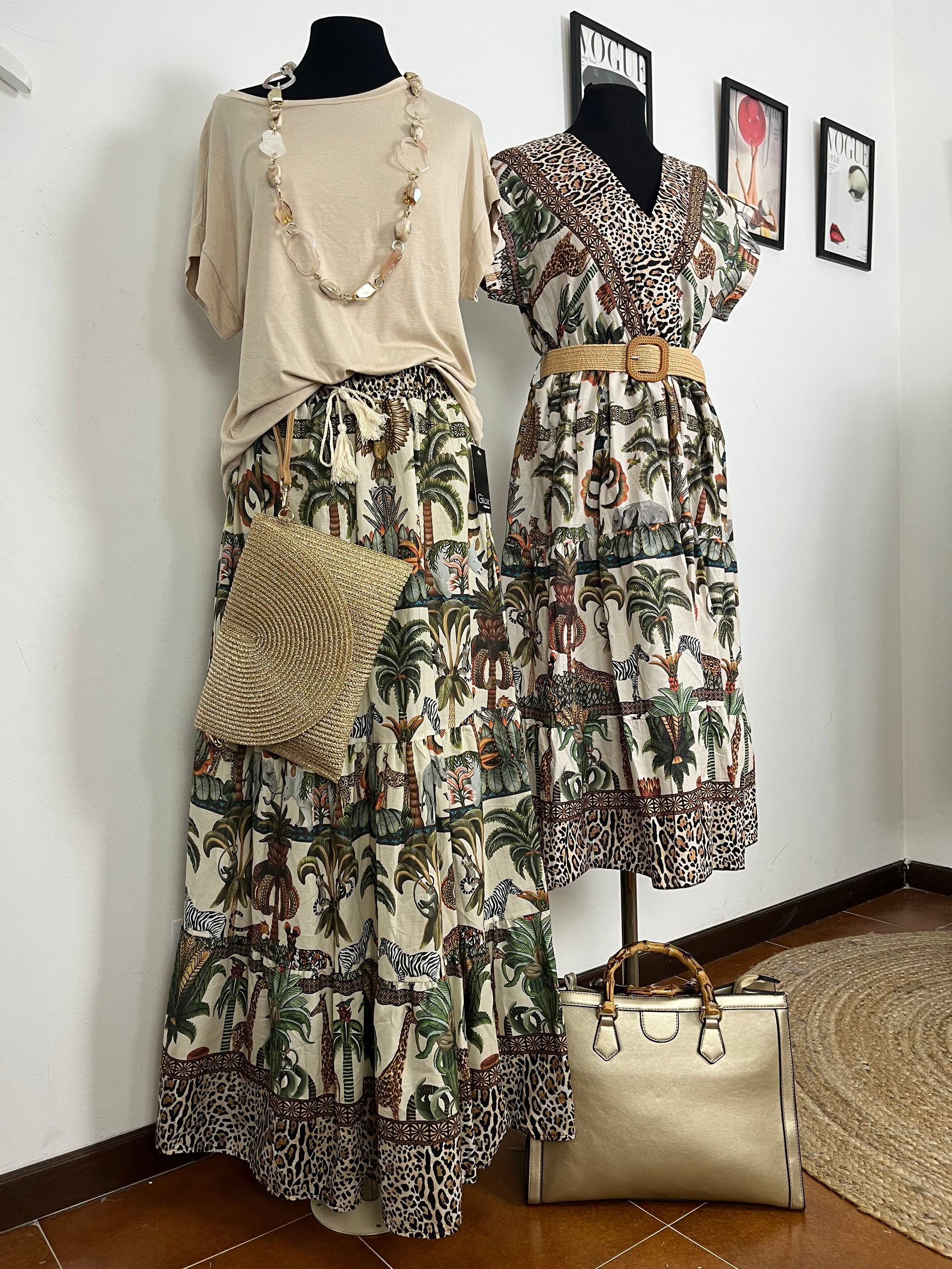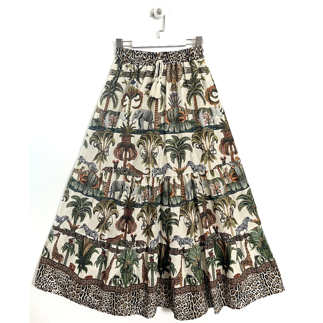 Gonna lunga in puro cotone. Elastico in vita, svasata sul fondo. A balze