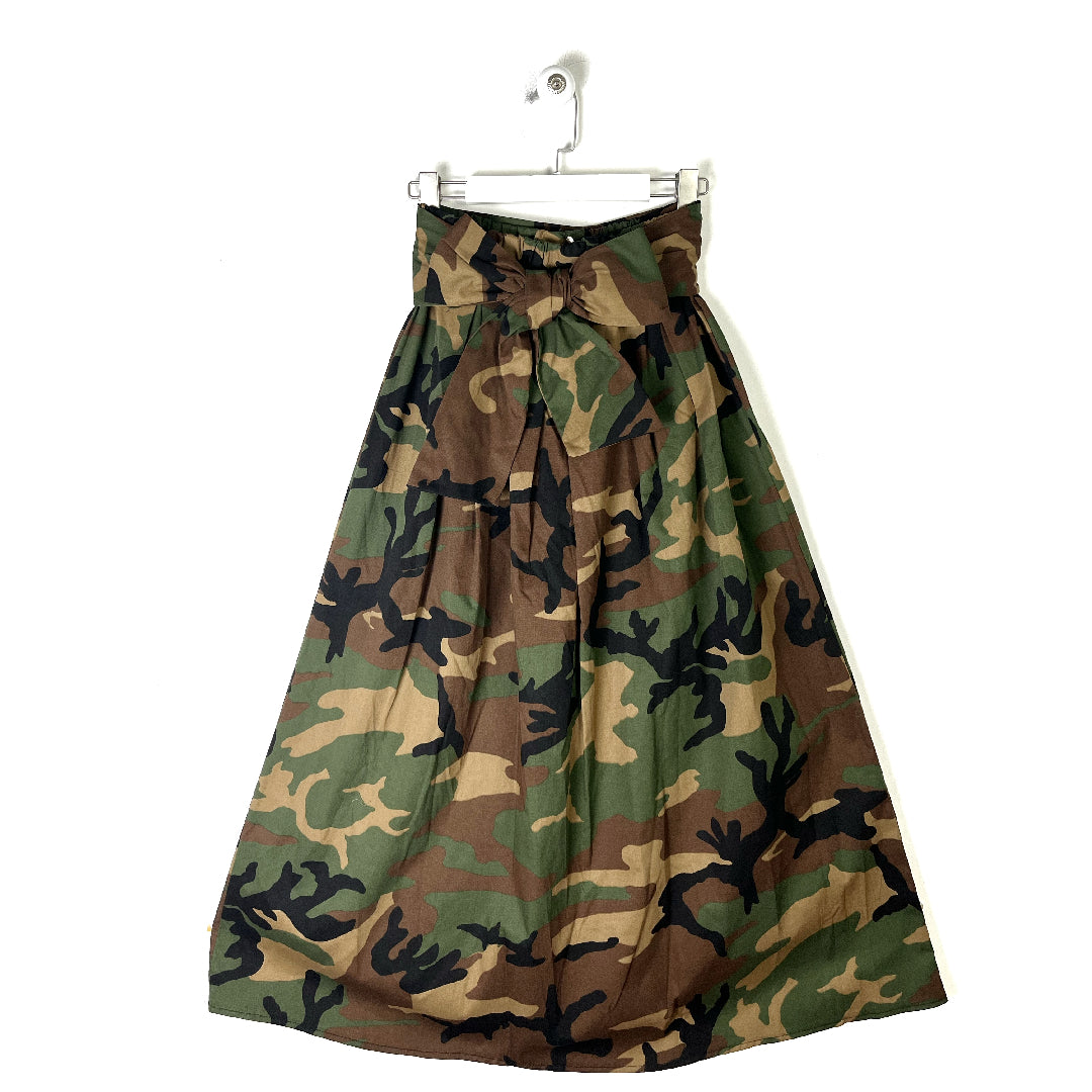 Gonna lunga in cotone, fantasia camouflage. Cintura in tessuto, elastico in vita.