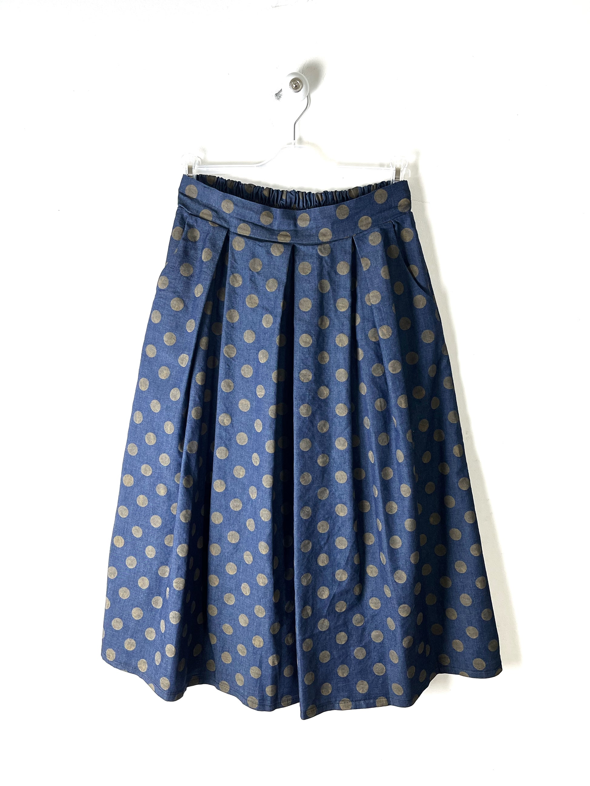 Gonna in denim leggerissimo a pieghe, lunghezza midi. Fantasia a pois. Elastico dietro in vita. Tasche a scomparsa laterali. Sfoderata.